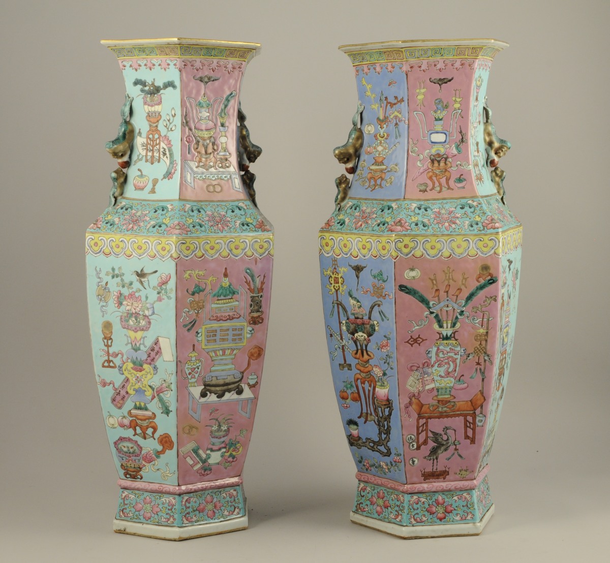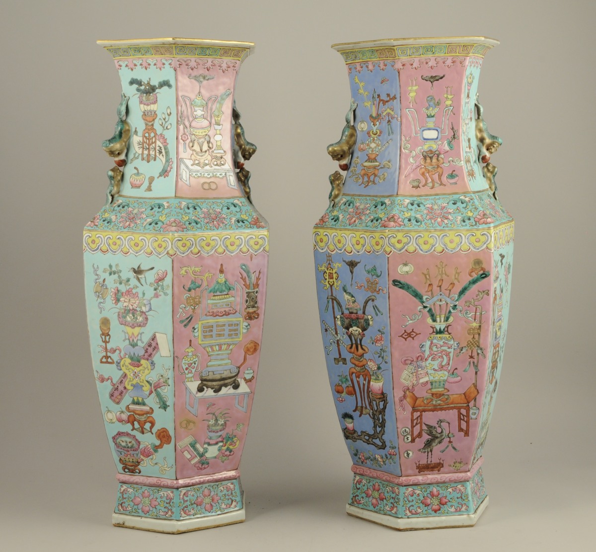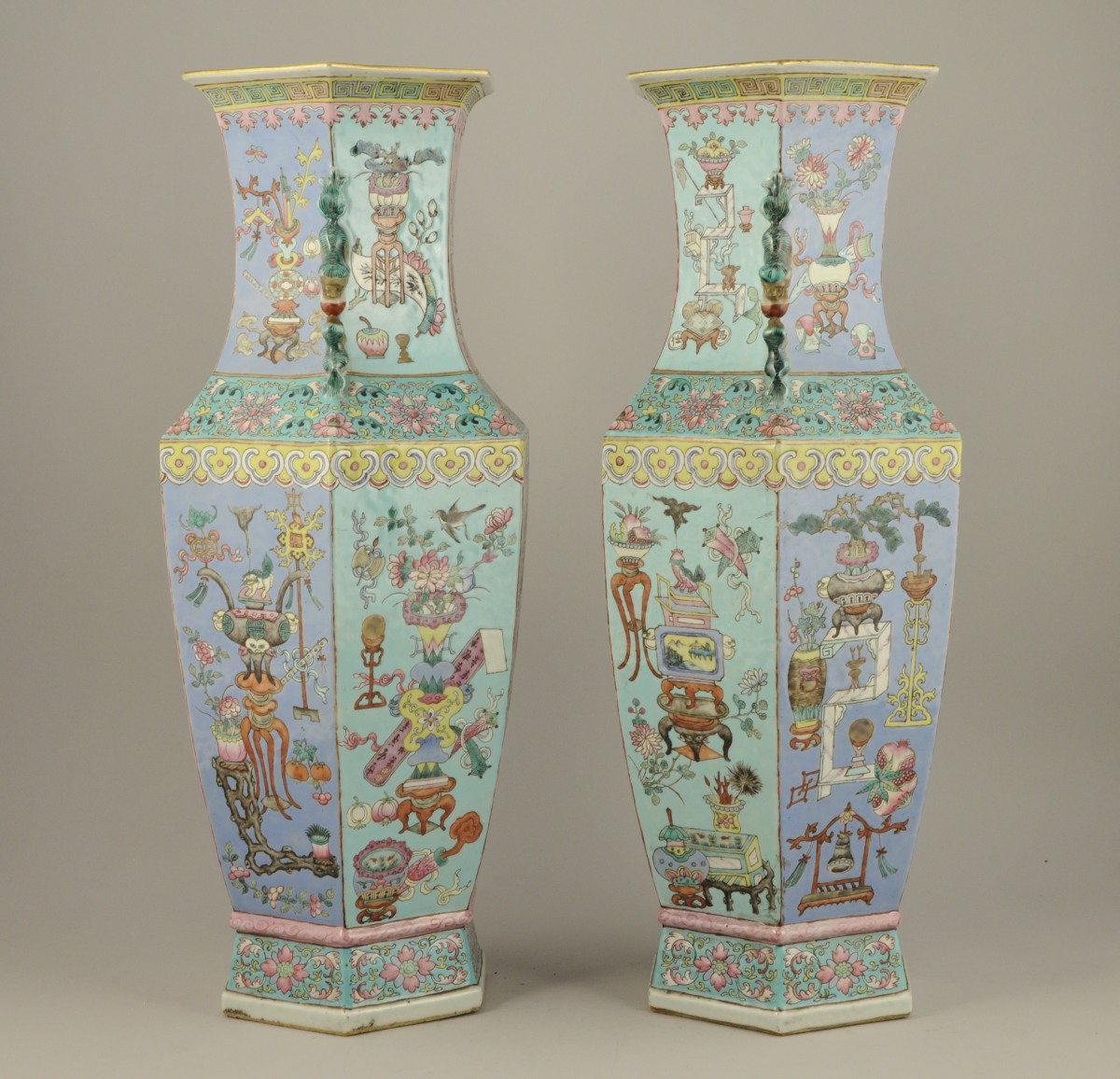 PAIRE DE VASES de forme hexagonale en porcelaine émaillée polychrome à décor de sujets mobiliers parmi les fleurs sur fond bleu ciel et rose.