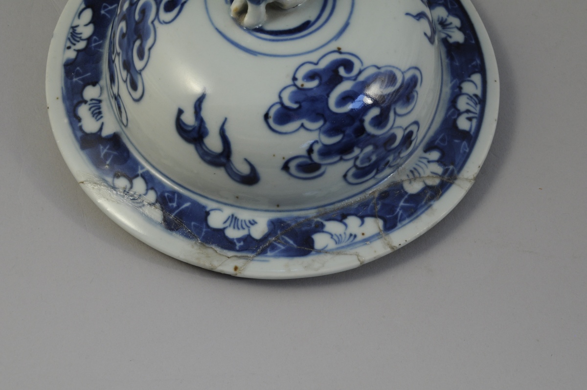 VASE COUVERT, en porcelaine blanc et bleu figurant un phoenix. L'épaulement orné de têtes de chien de Fô.
