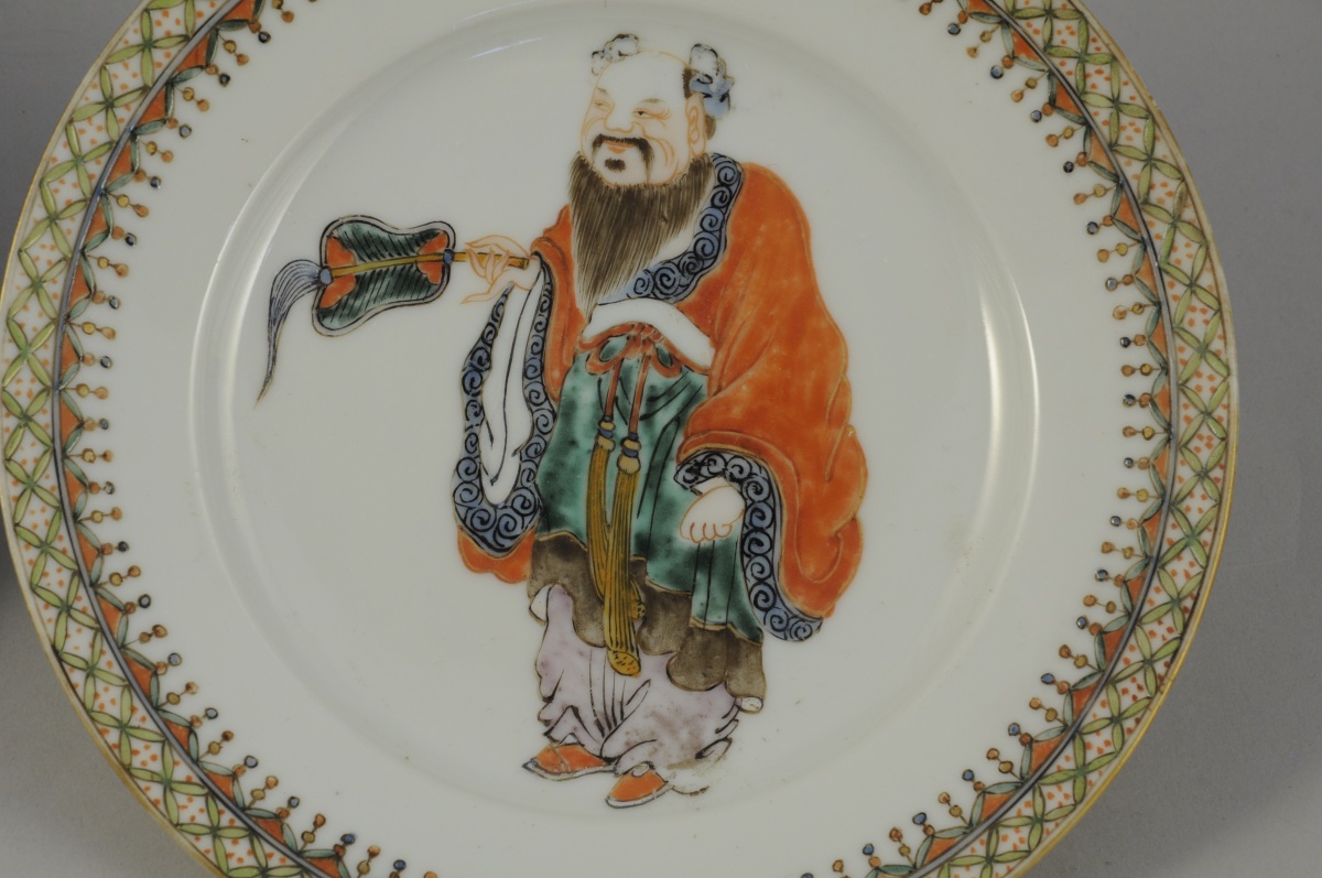 PAIRE d' ASSIETTES en porcelaine polychrome avec personnage central .