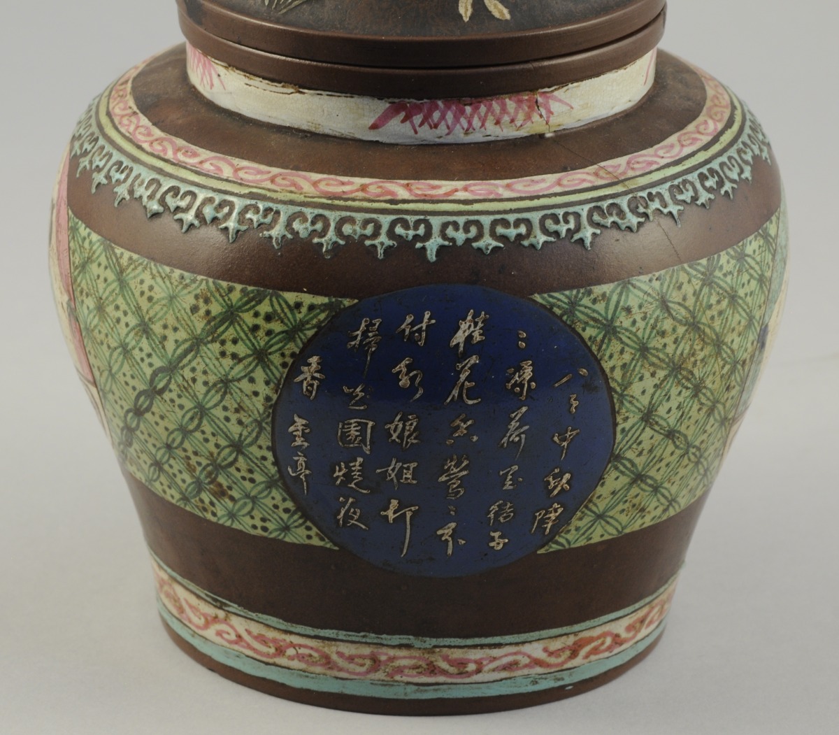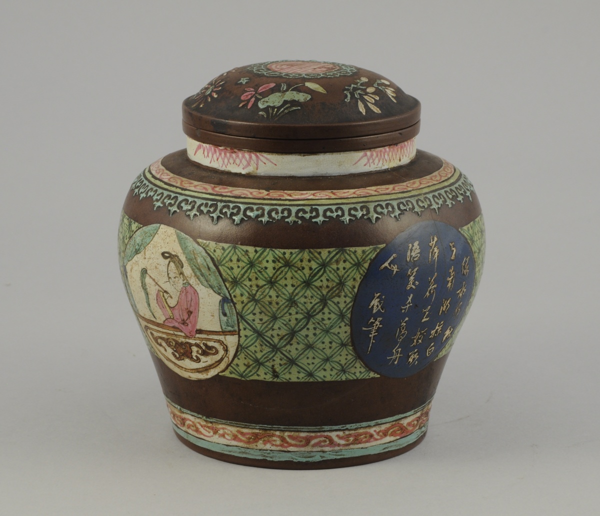 POT COUVERT en grès à décor peint dans quatre médaillons de femme aux doigts de bouddah et d'idéogrammes.