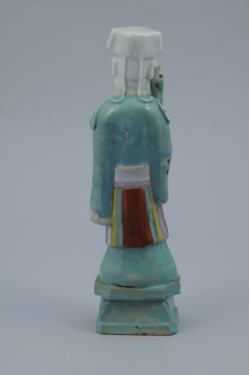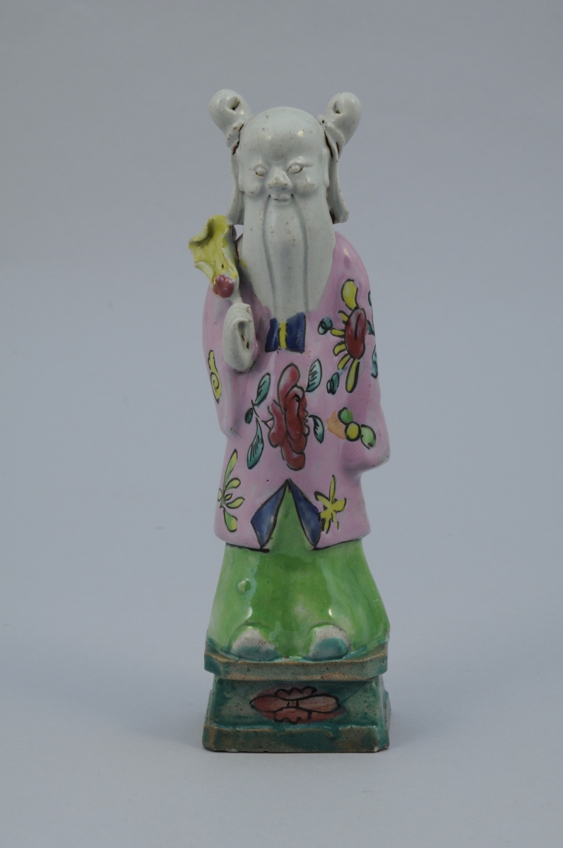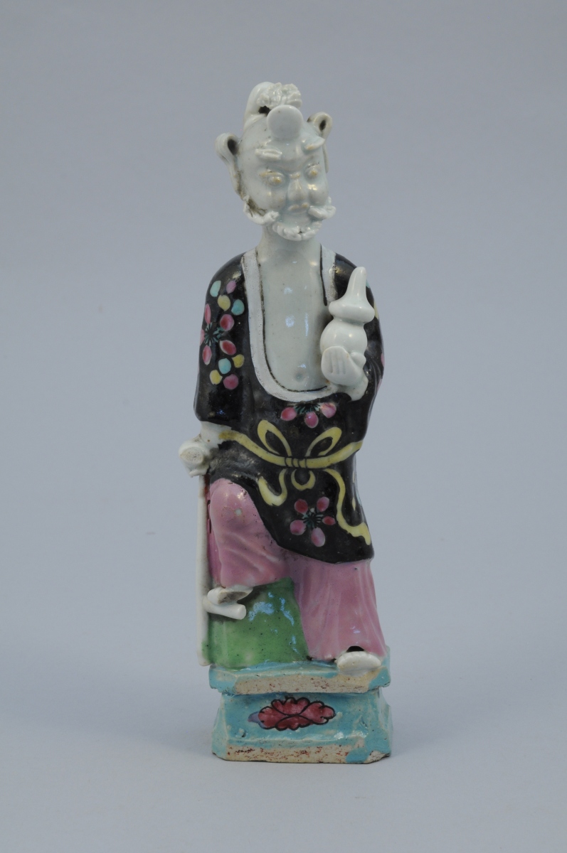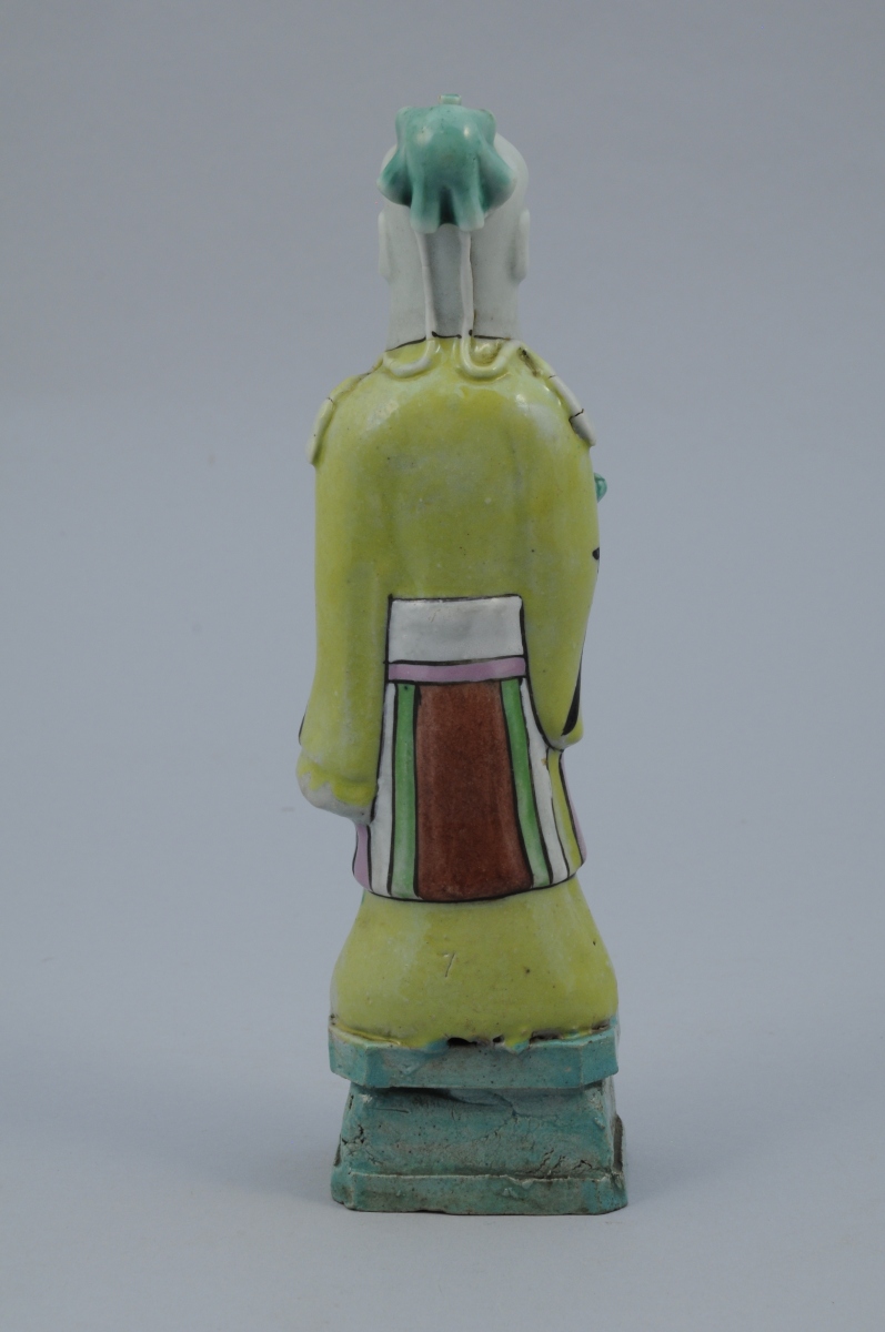 SEPT STATUETTES en porcelaine aux émaux de la famille rose représentant des personnages. Chacune percée à l'arrière de la tête.