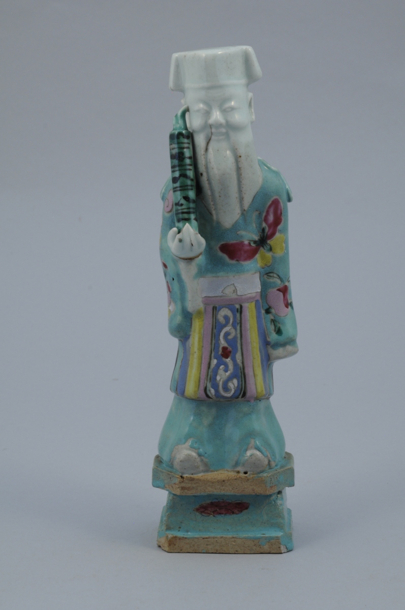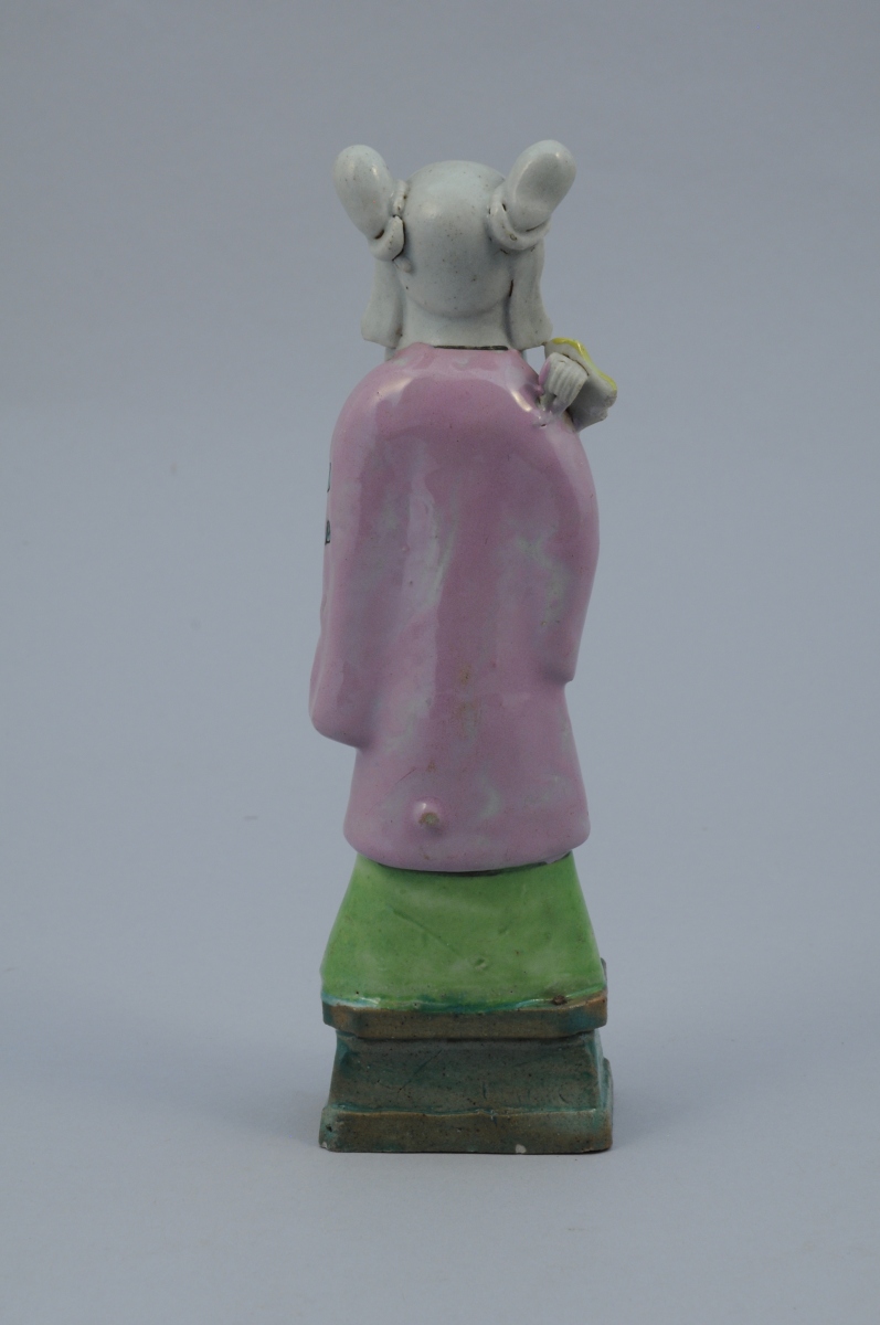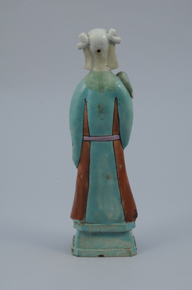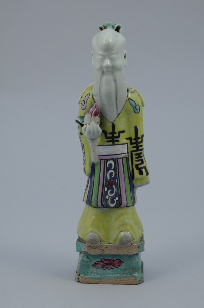 SEPT STATUETTES en porcelaine aux émaux de la famille rose représentant des personnages. Chacune percée à l'arrière de la tête.