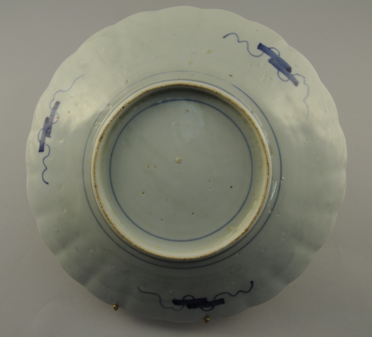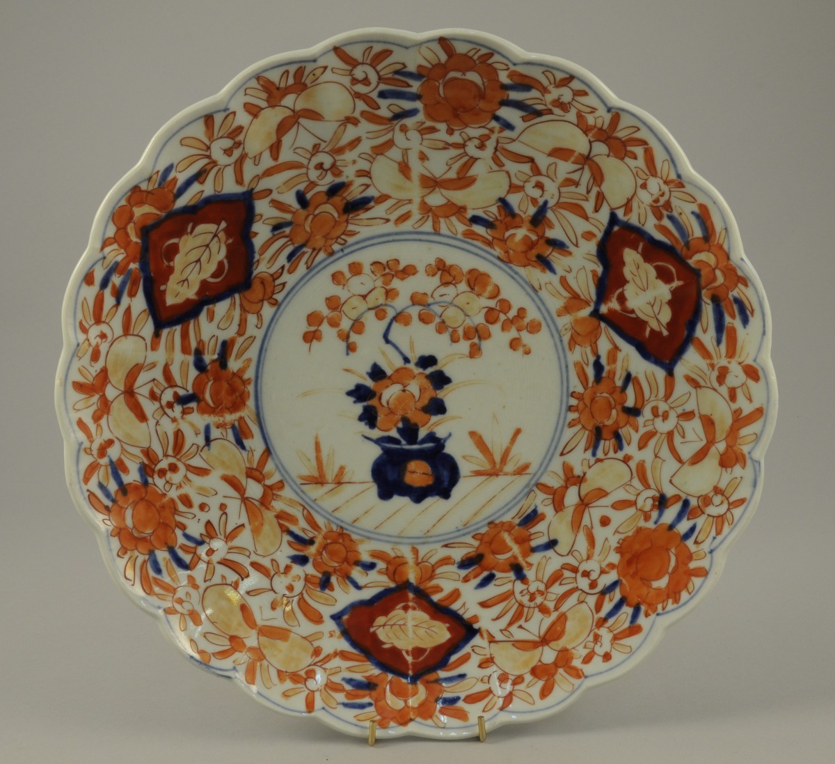 IMARI, JAPON. PLAT de forme ronde à bordure polylobée en porcelaine polychrome à décor Imari. Ornementation de motifs végétaux et papillons stylisés.