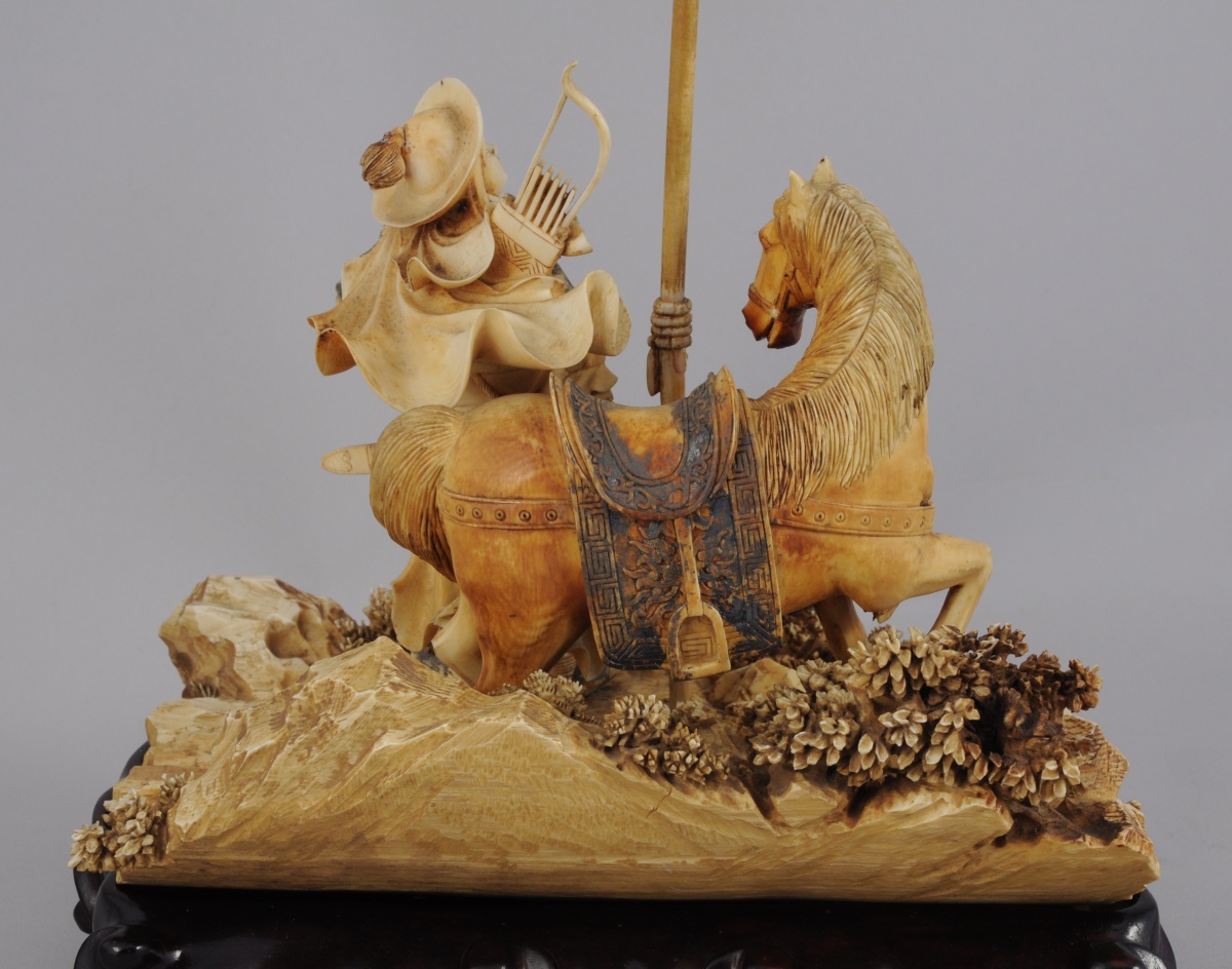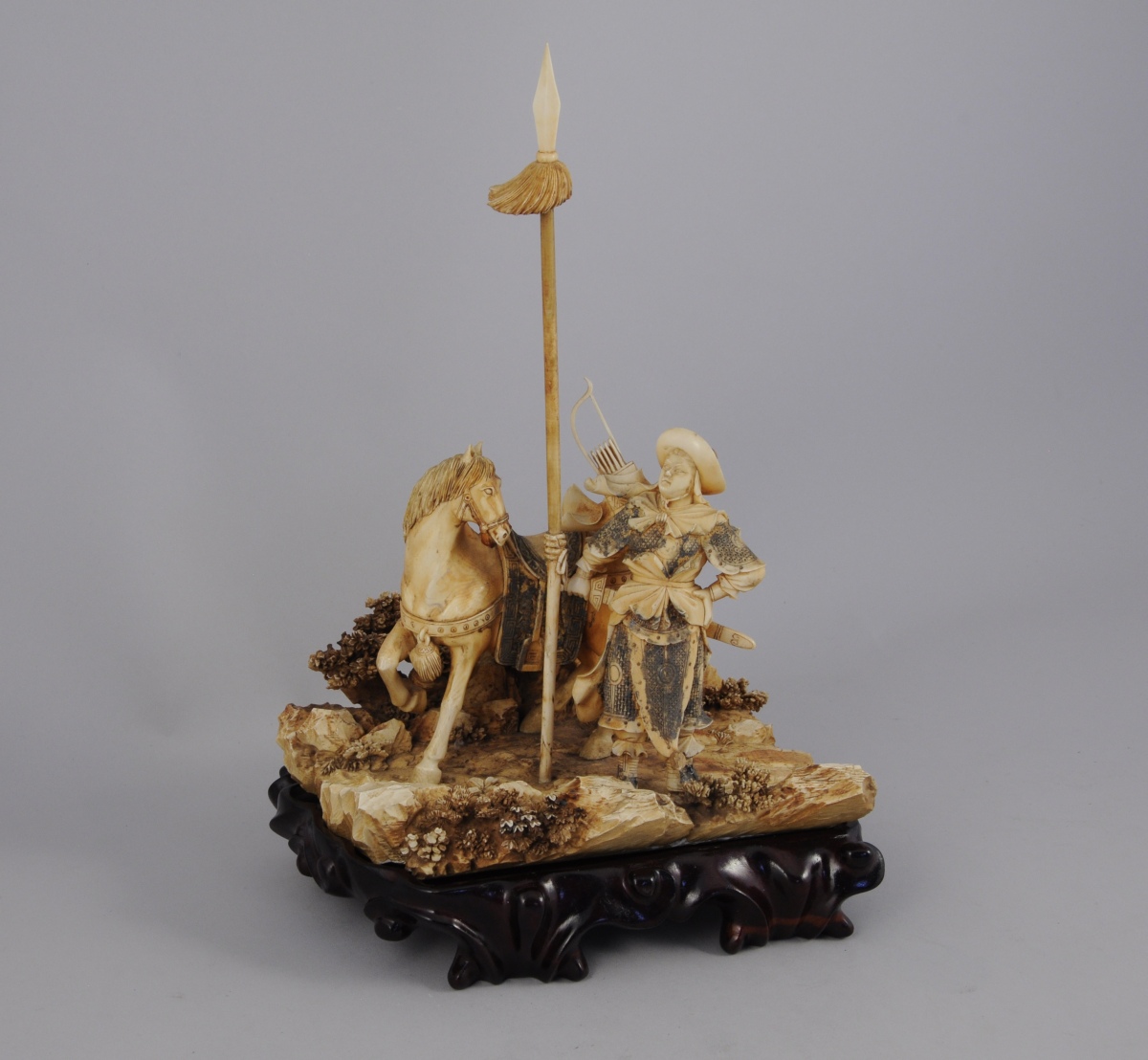 GROUPE en ivoire sculpté figurant un cavalier armé d'un arc et d'une lance aux côtés de son cheval. Ils reposent sur un tertre ornés d'arbustes.