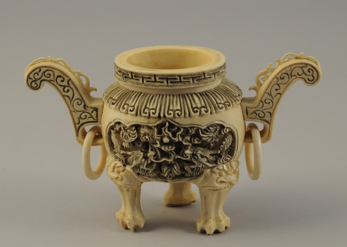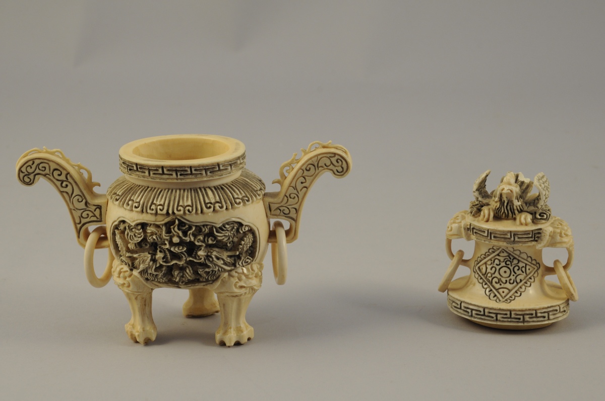 BRÛLE-PARFUM en ivoire sculpté, sommet d'un coq, à dexu anses,...