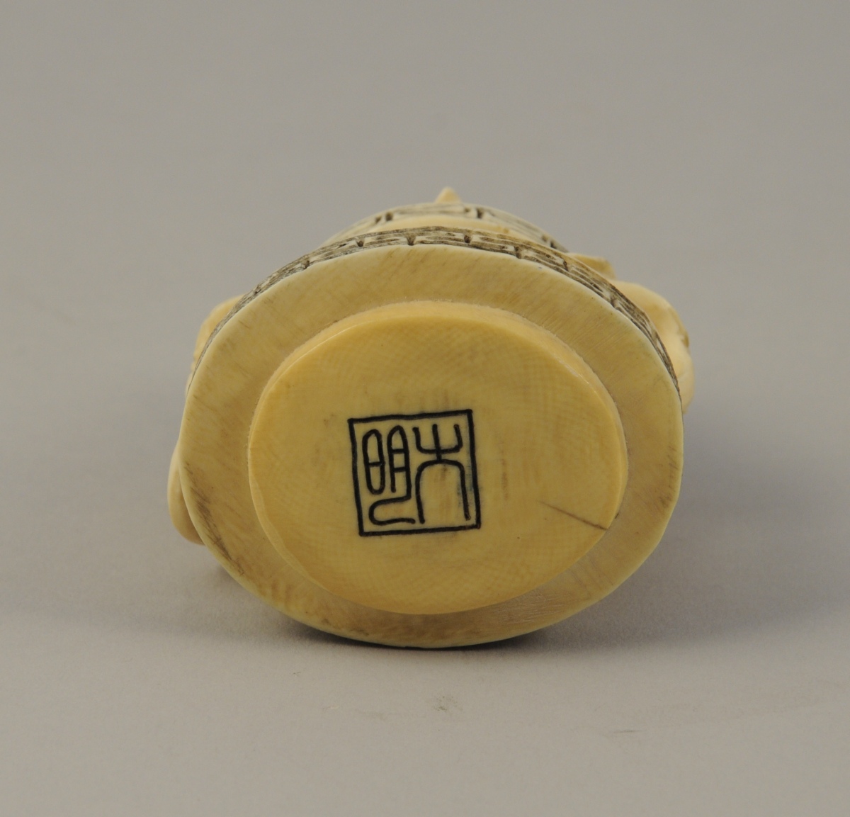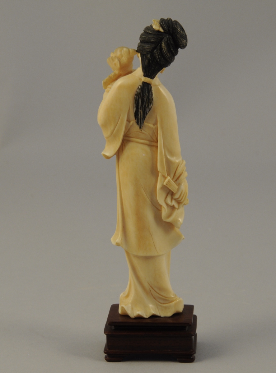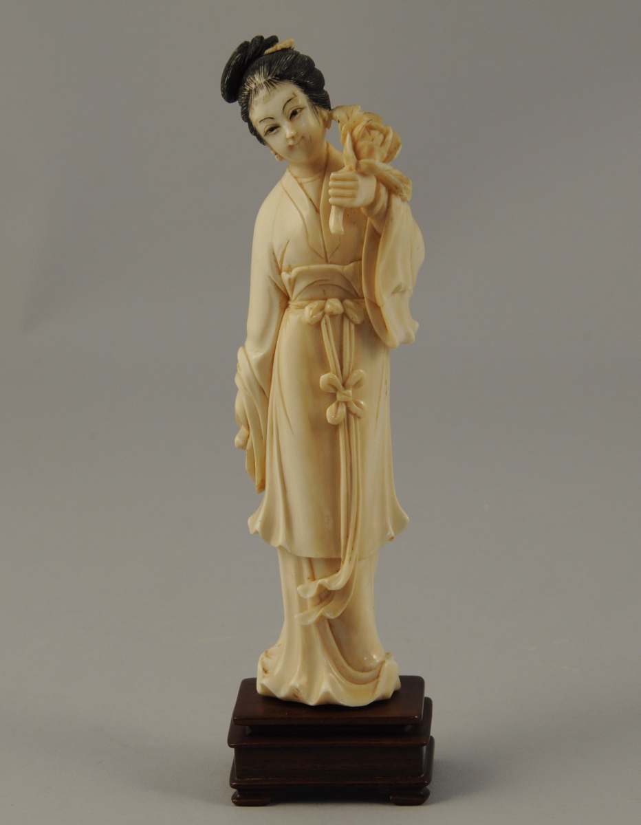 JOINT: OKIMONO en ivoirine figurant une dame à la fleur de lotus. XXe. Haut. 15 cm.