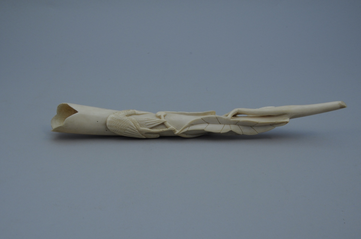 DÉFENSE en ivoire sculptée d'un oiseau dans des branchages.