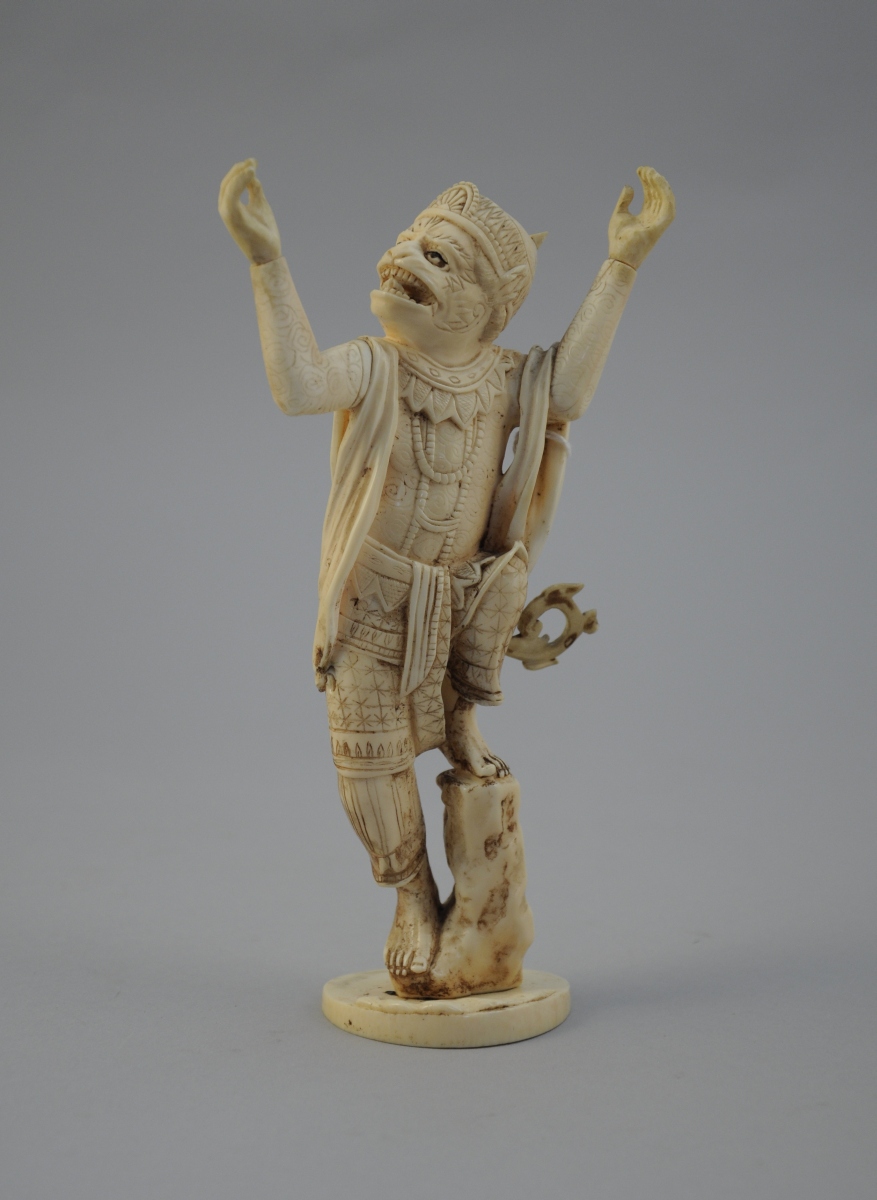 OKIMONO en ivoire à patine jaune, Hanuman debout, la jambe gauche posée sur un rocher.
