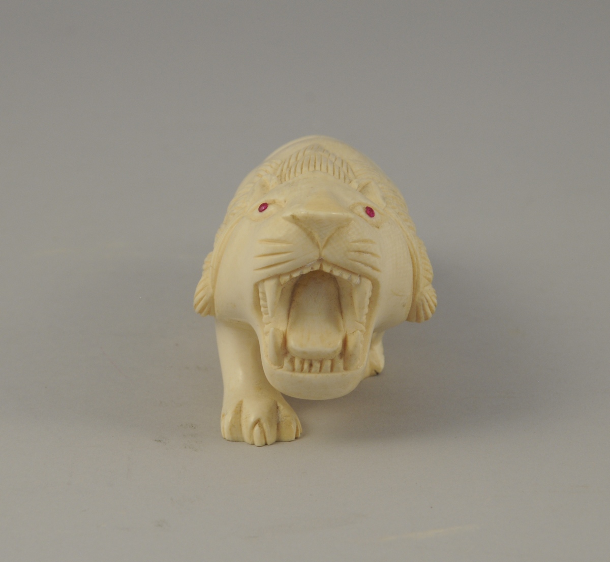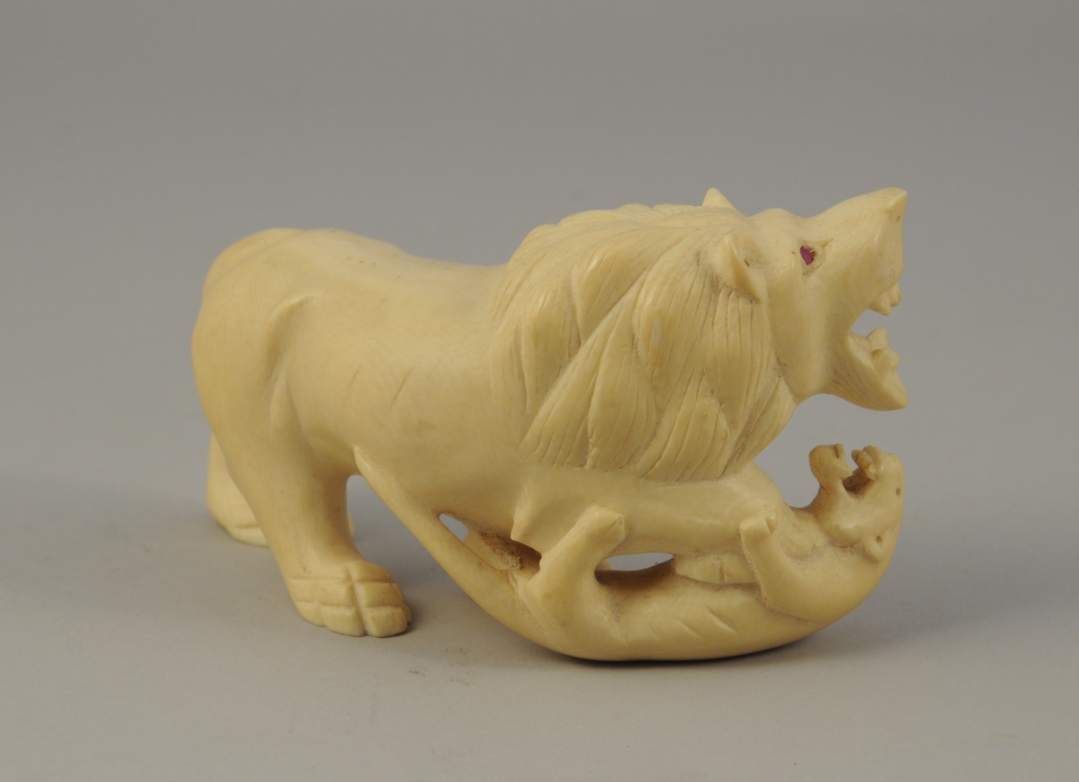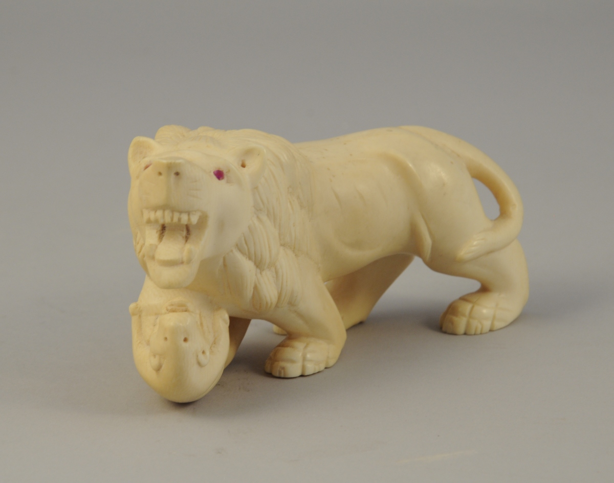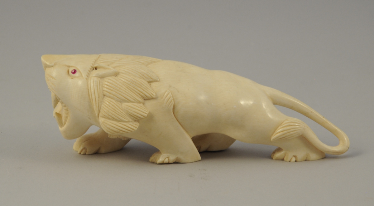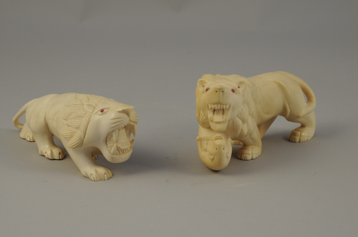 OKIMONO. 2 LIONS en ivoire/ivoirine, les yeux incrustés de verre coloré..