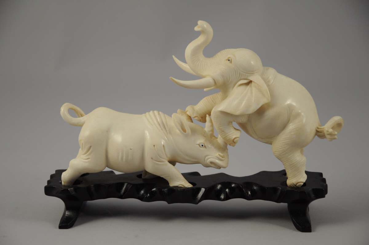 OKIMONO. ÉLÉPHANTS ET RHINOCÉROS. 2 groupes en ivoire sculpté représentant deux éléphants luttant contre un rhinocéros.