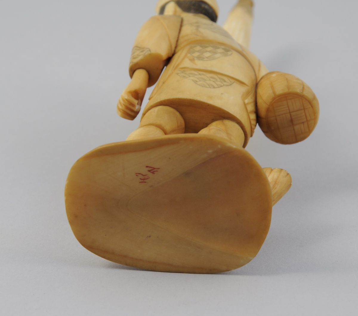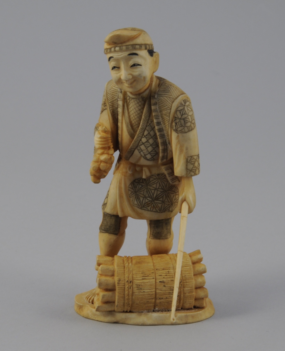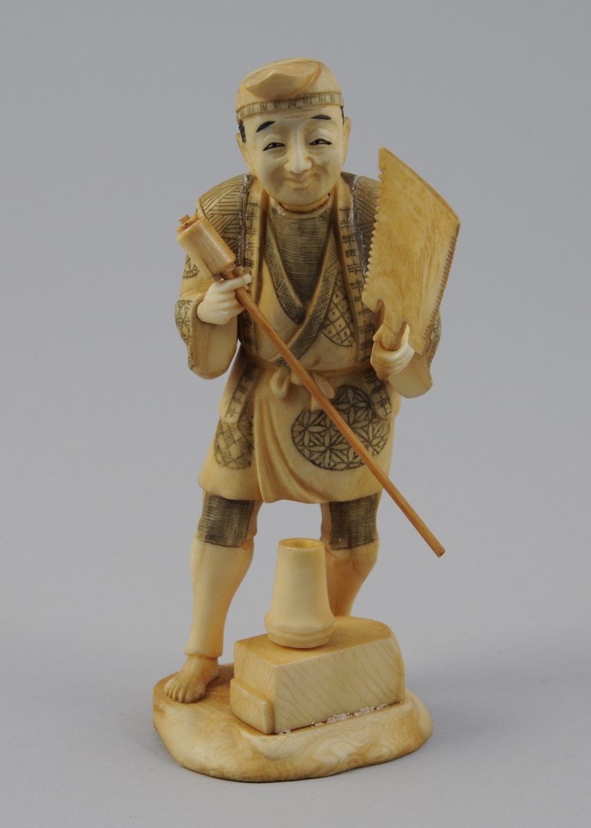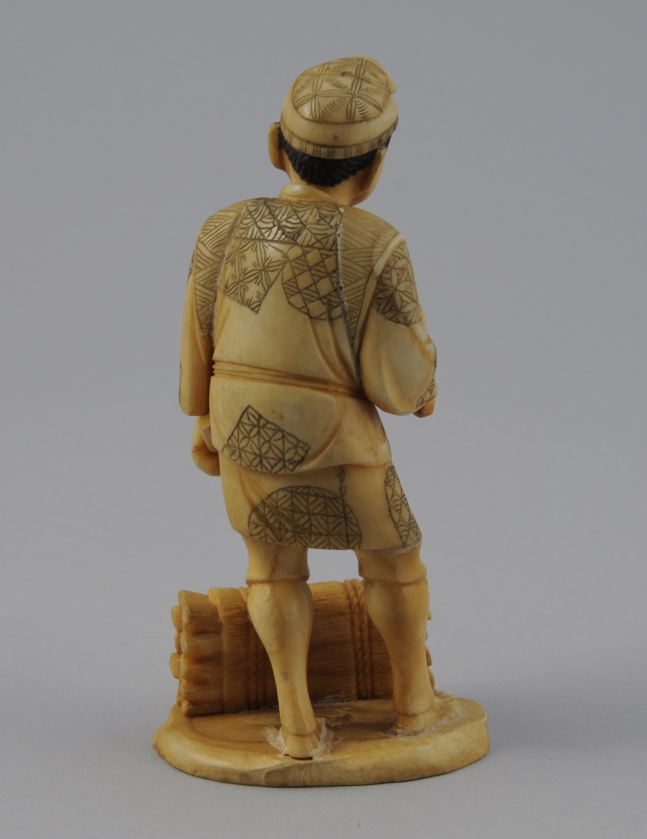 OKIMONO. 6 PERSONNAGES masculins en ivoire/ivoirine sculpté dans des activités traditionelles. Tous signés.
