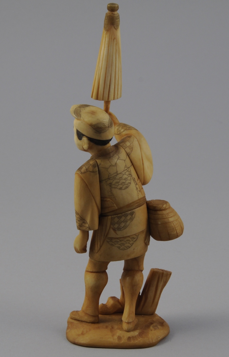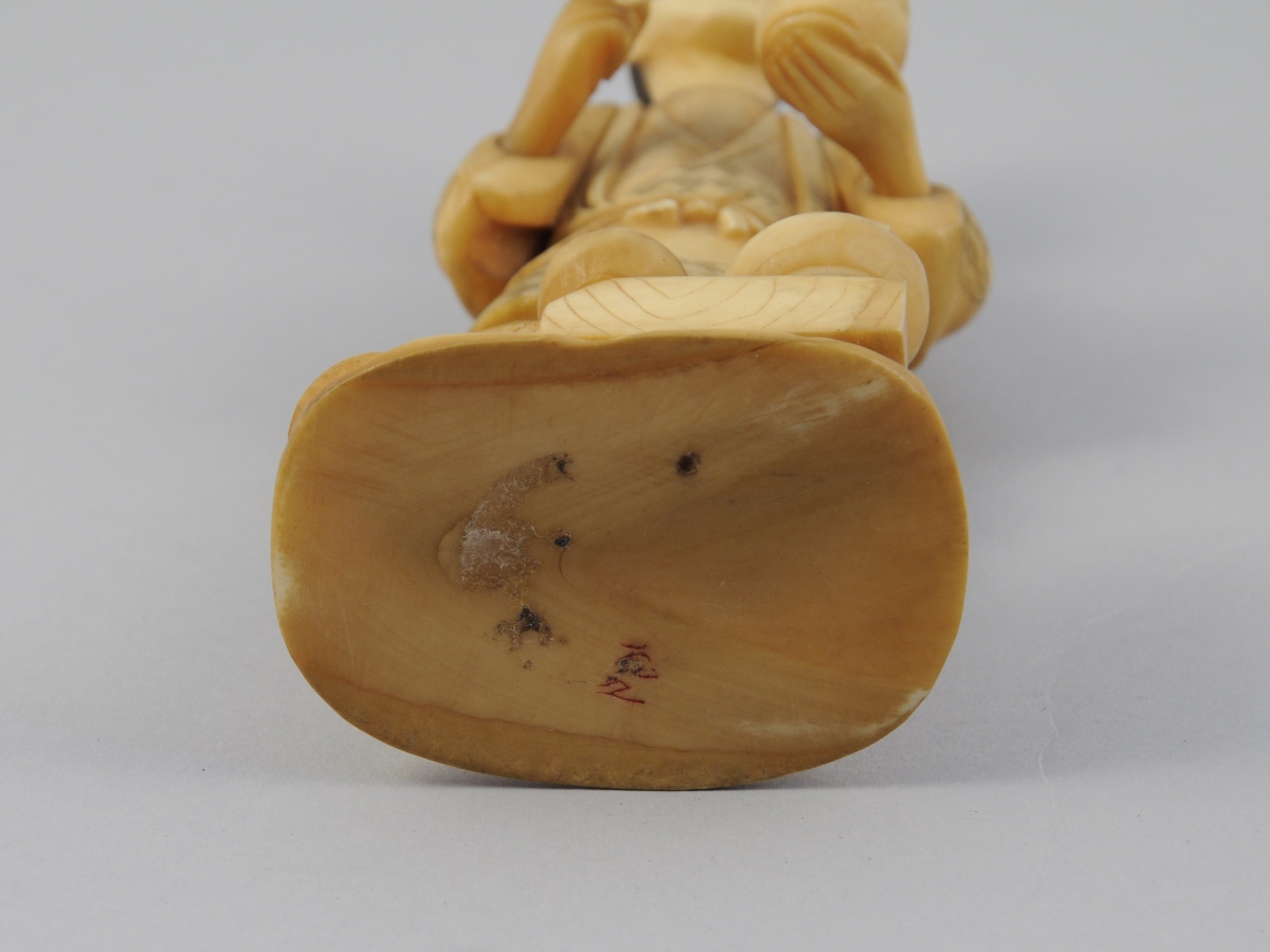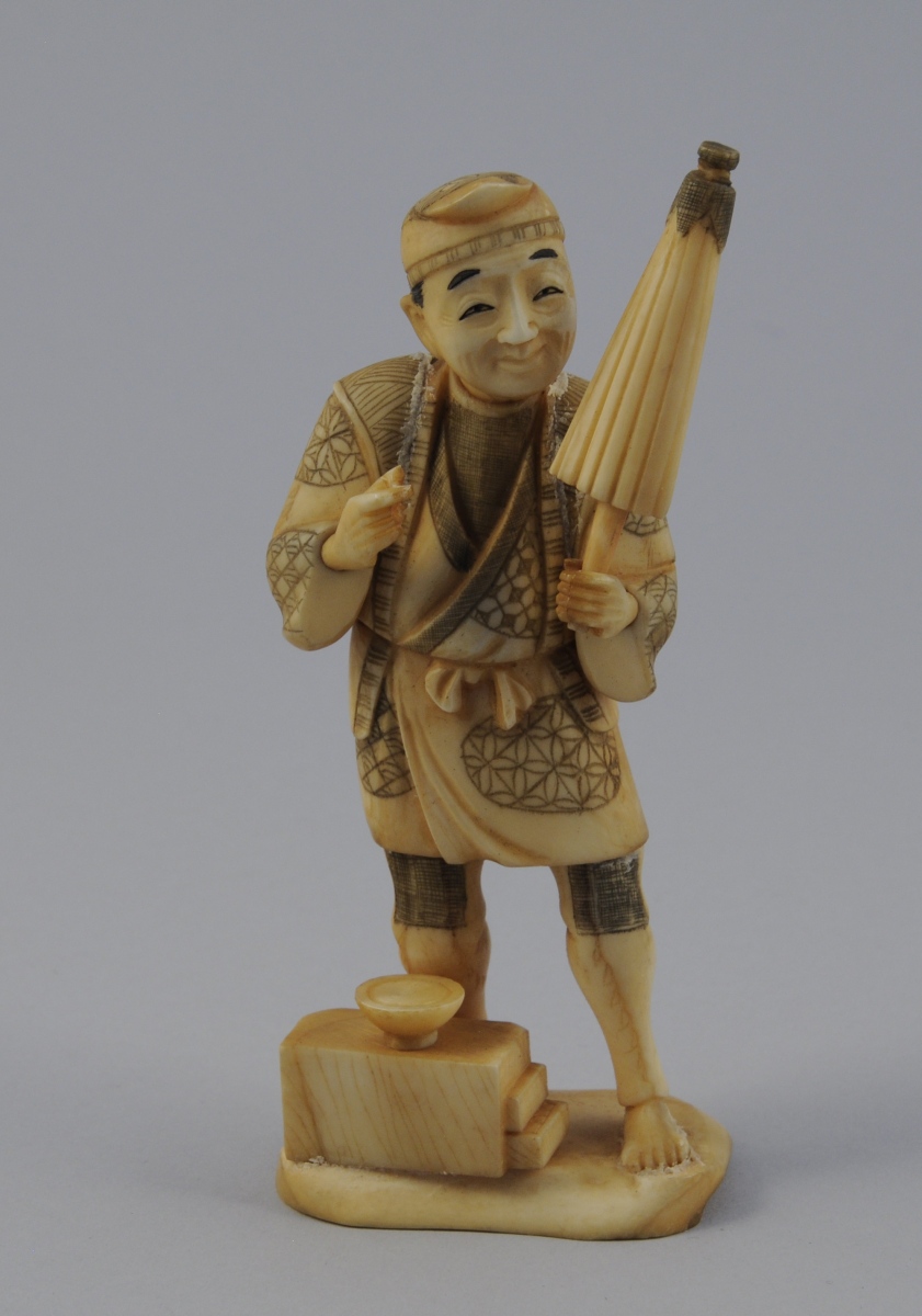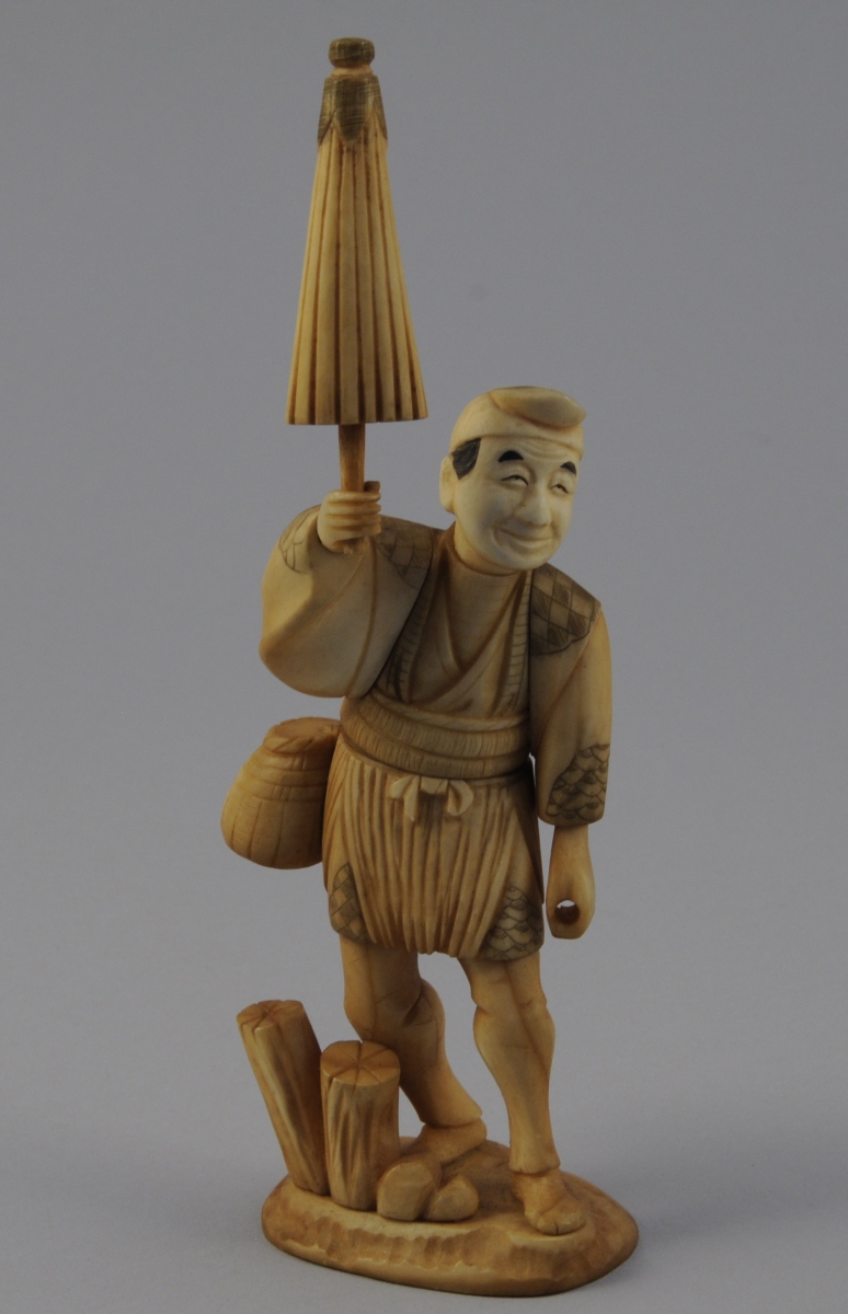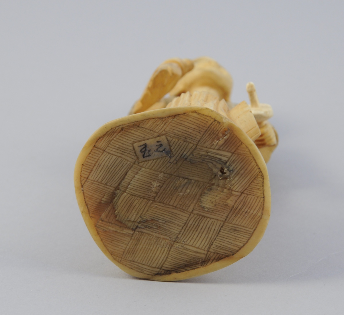 OKIMONO. 6 PERSONNAGES masculins en ivoire/ivoirine sculpté dans des activités traditionelles. Tous signés.