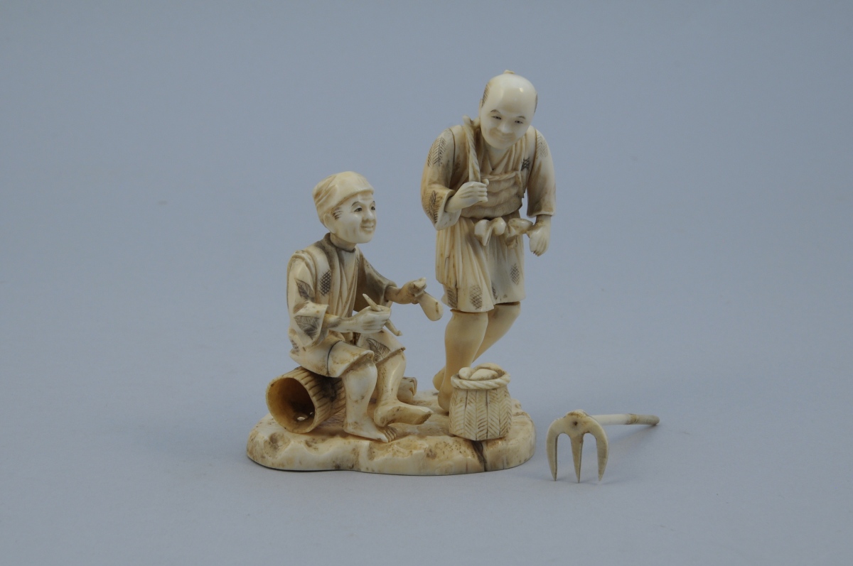 OKIMONO en ivoire représentant deux paysans au retour des champs. Signé sur la terrasse.