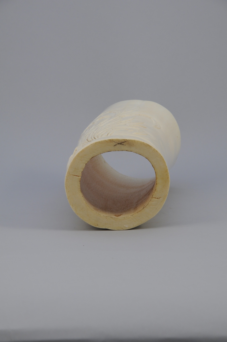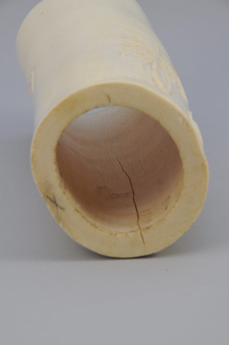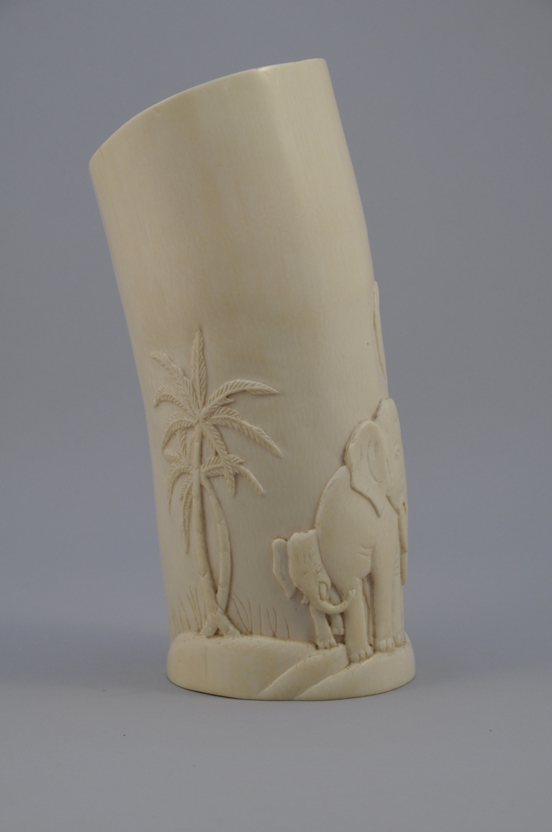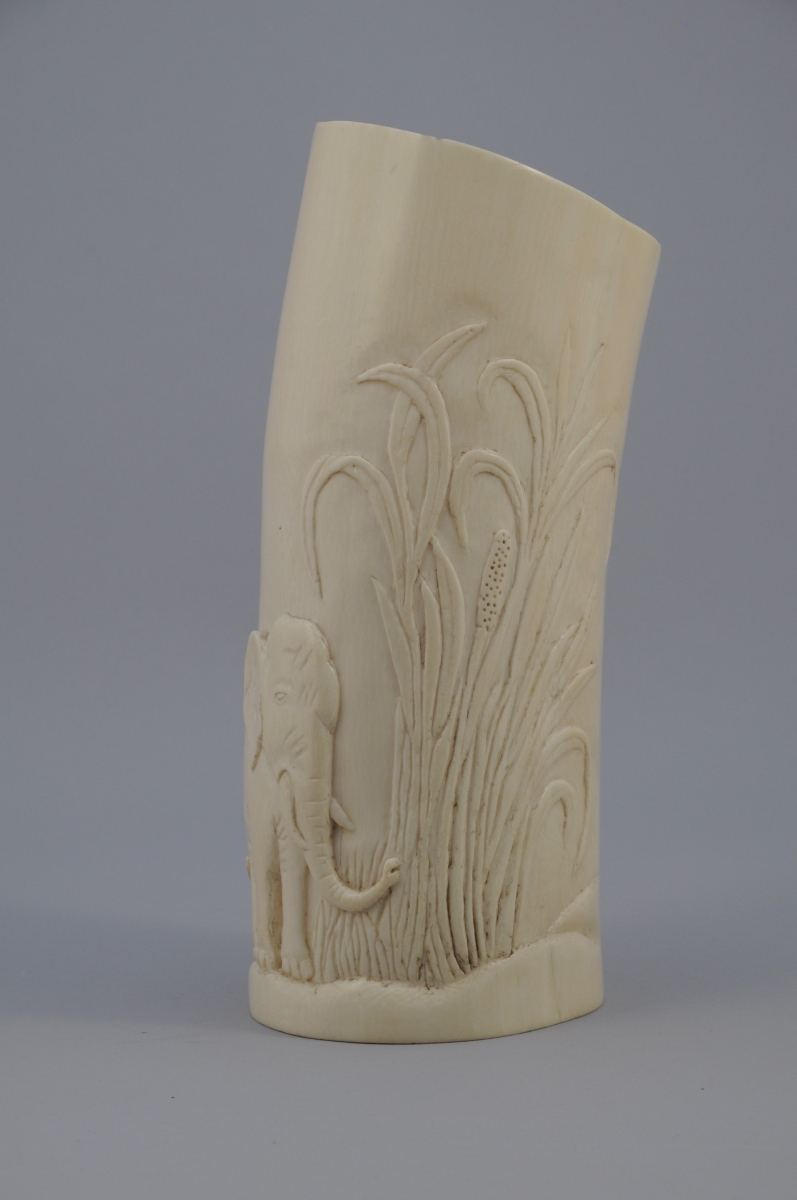 PARTIE INFÉRIEURE de DÉFENSE d'éléphant en ivoire sculptée d'éléphants et de roseaux.
