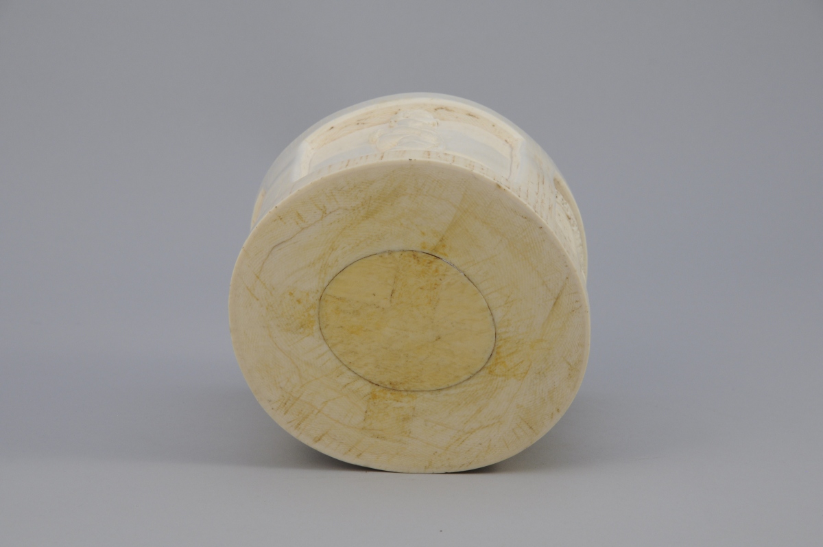 POT EN IVOIRE d'éléphant sculpté de visages et scènes populaires.