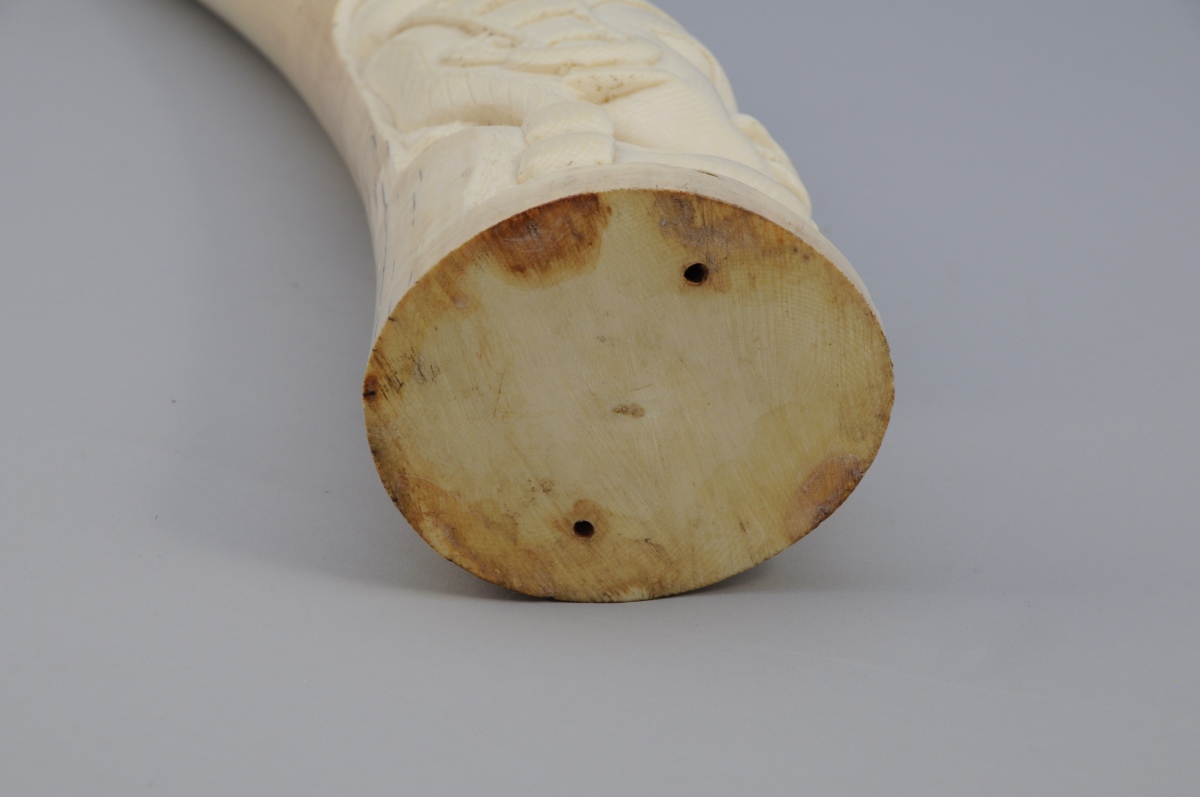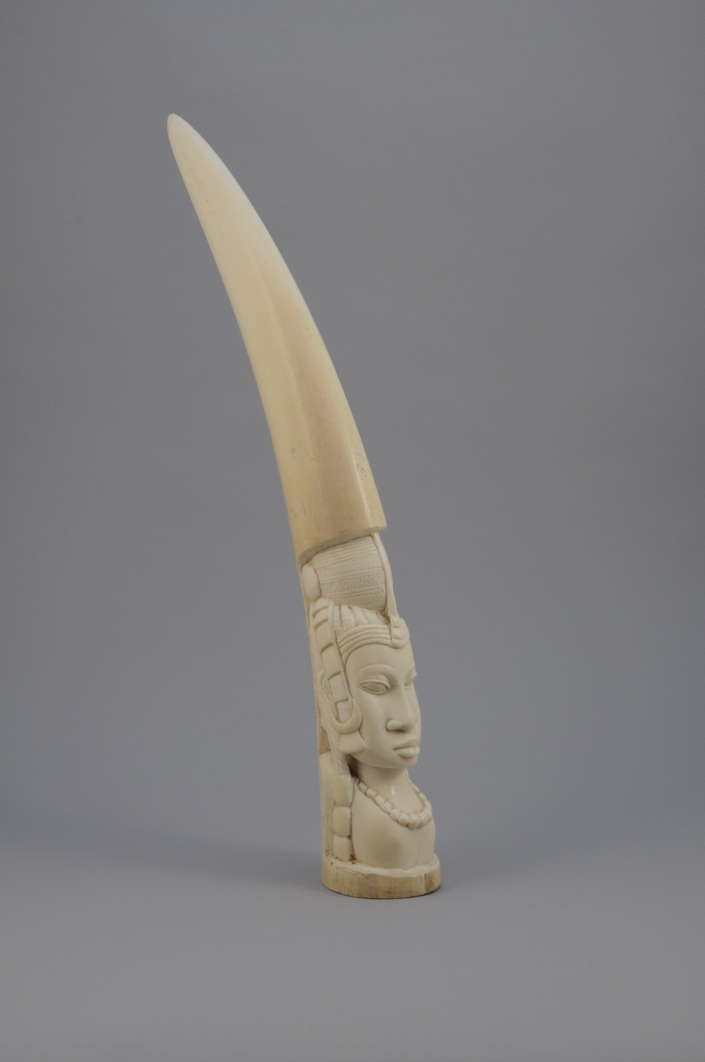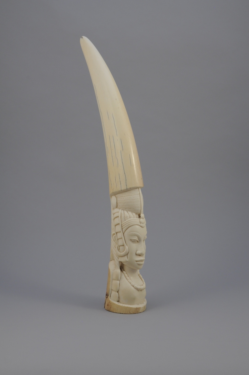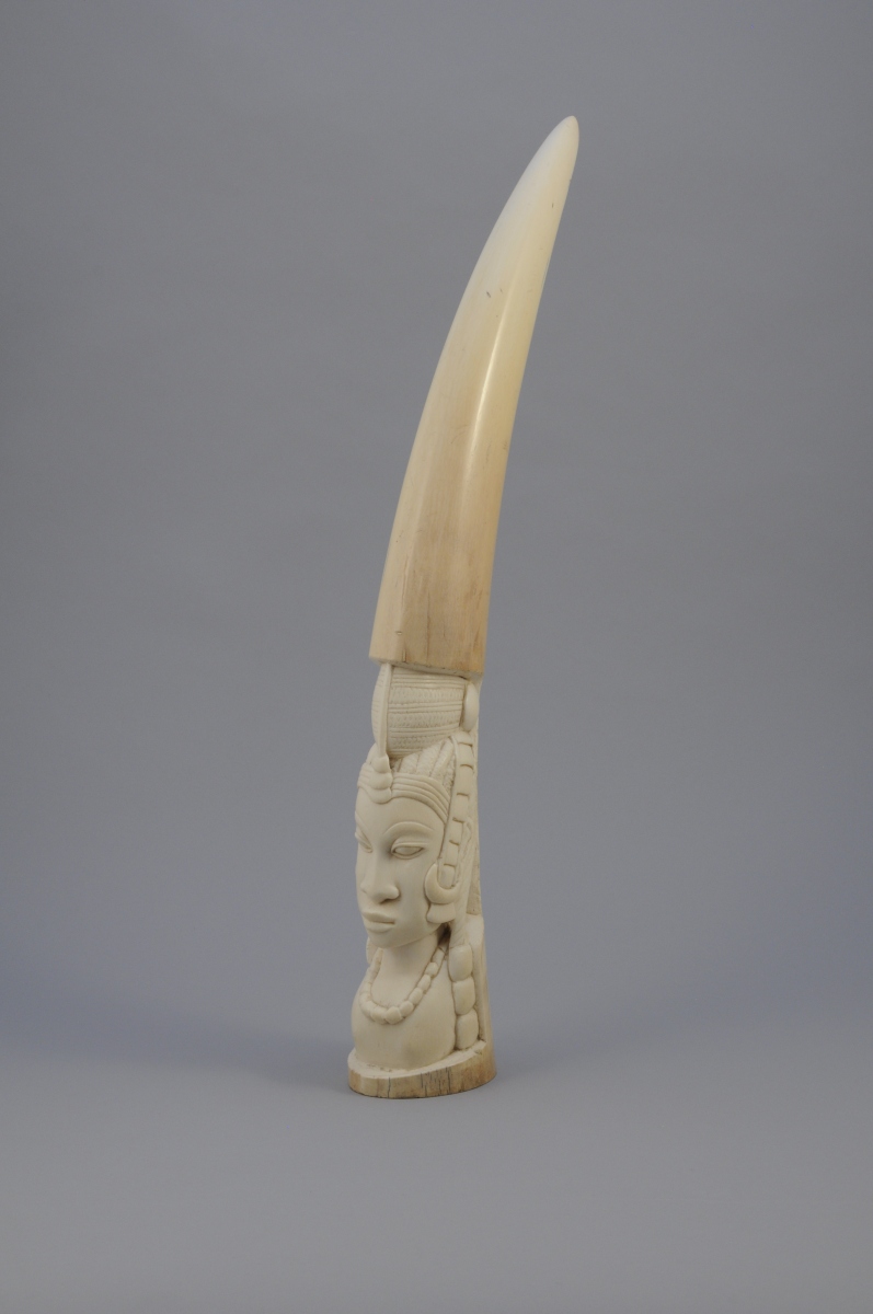 PAIRE de DÉFENSES d'éléphant en ivoire sculptées d'un buste de femme..