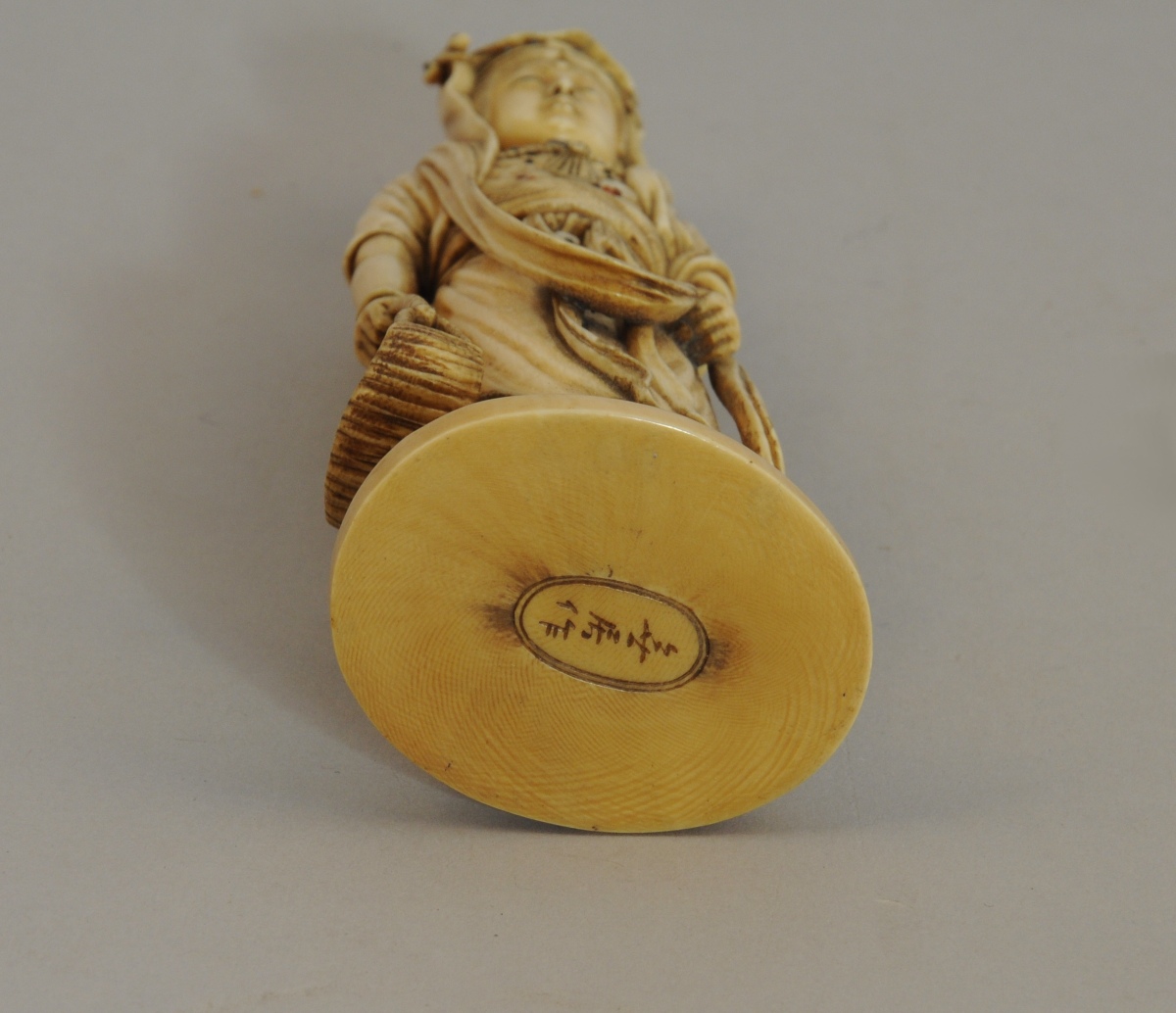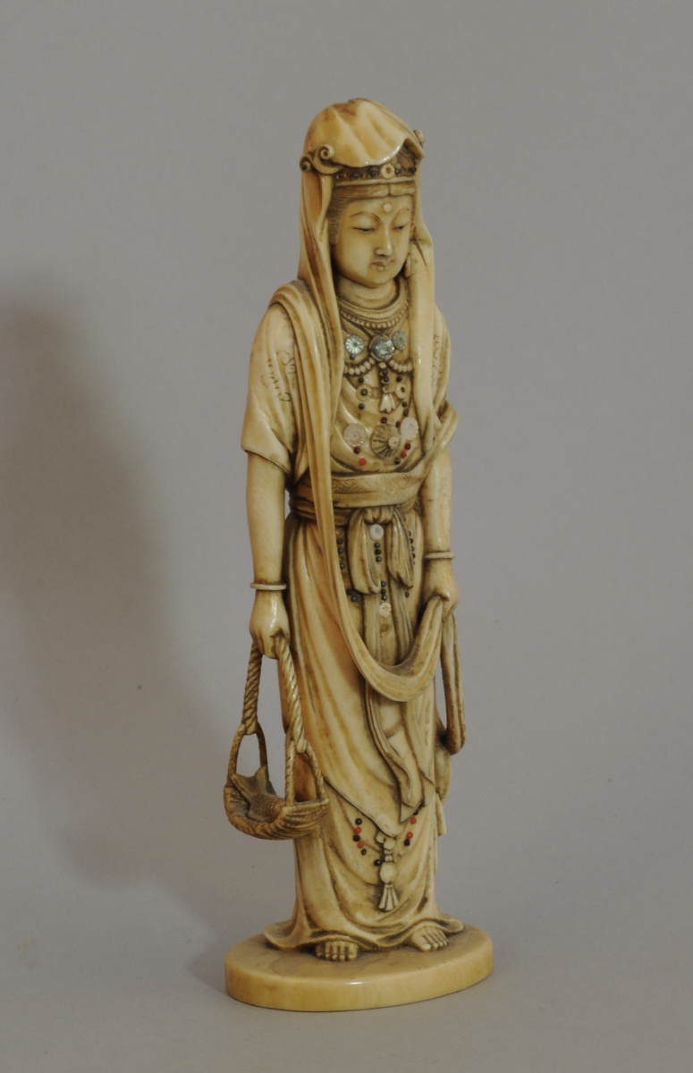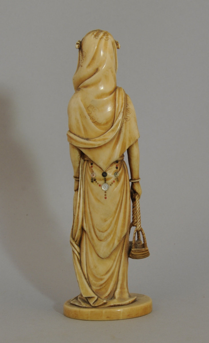 STATUETTE en ivoire sculpté figurant une femme drapée tenant de sa main droite un panier contenant un poisson. Sa tunique incrustée d'ornements en nacre, pierre dure et métal.