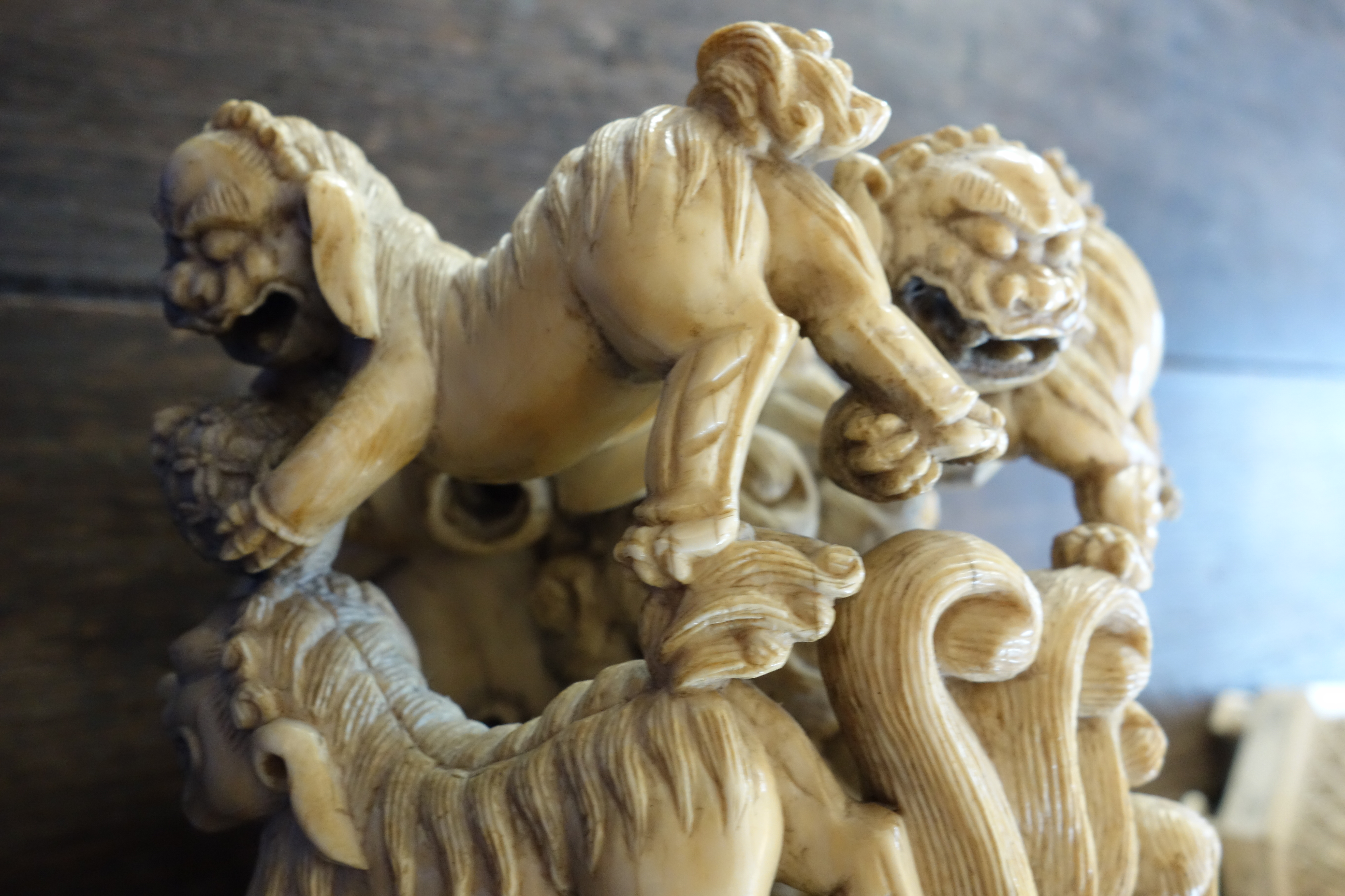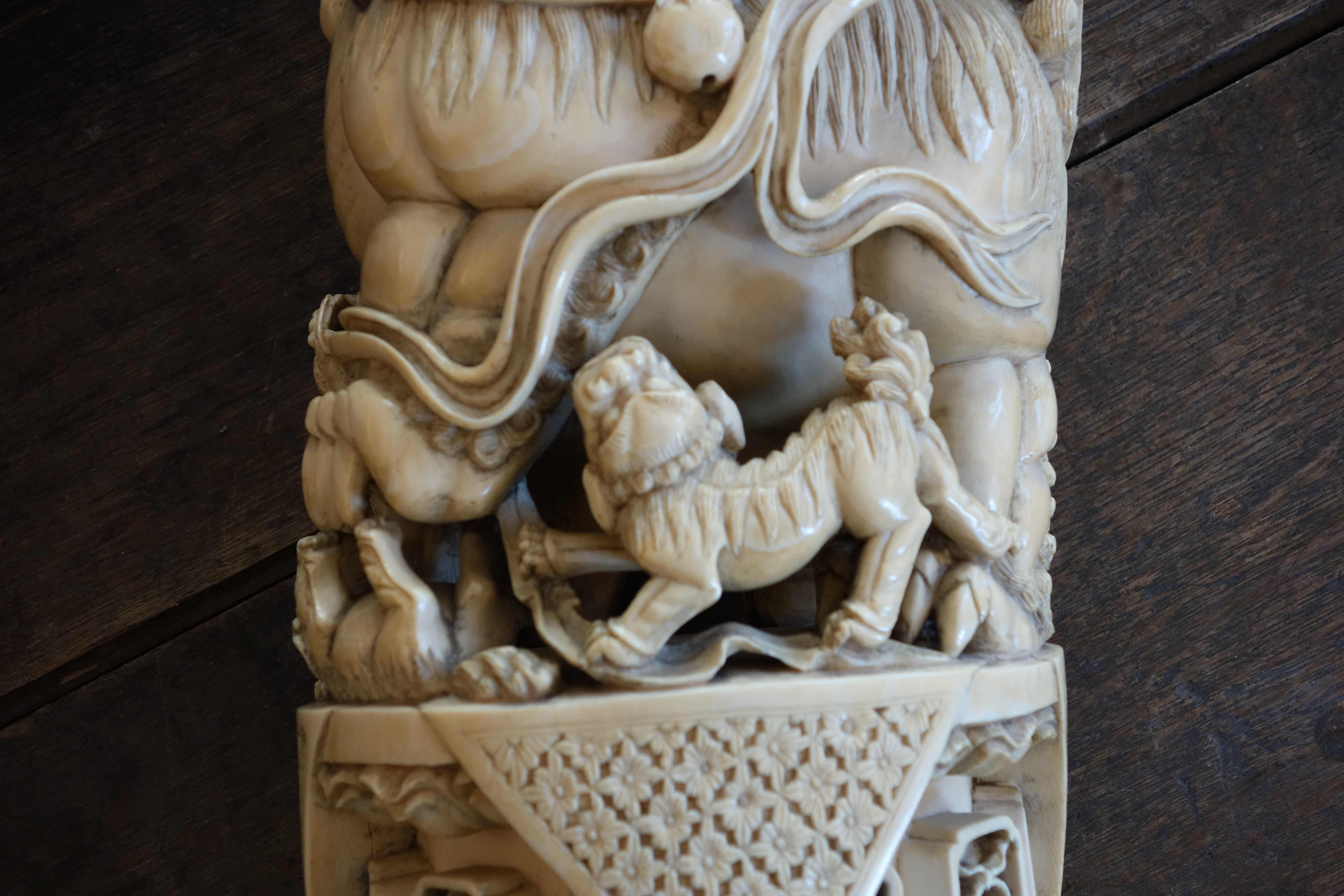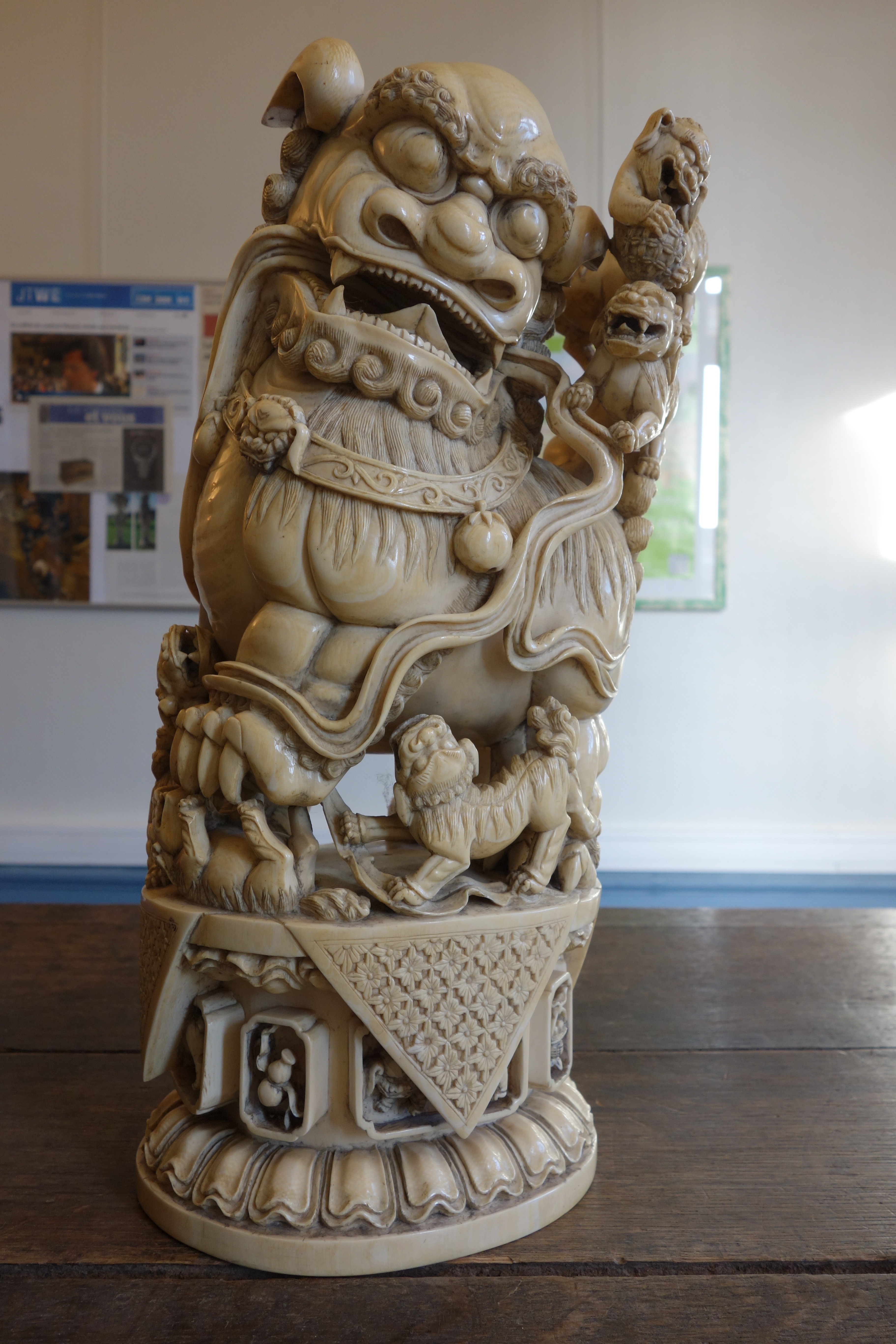 Important LION CHINOIS, ou chien de Fô, en ivoire finement sculpté, entouré de six petits autour de sa patte gauche, en signe de continuité de la vie, sur une base sculpté en bas reliefs de fleurs de lotus et de huit cartouches cartouches. Marque non garantie de Qianlong.