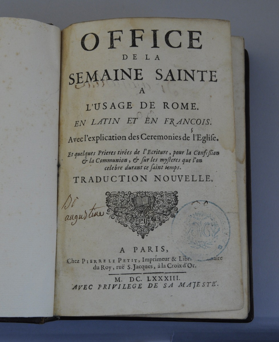 In-8, plein veau rouge, tranches dorées. Chiffre de Marie Anne Christine de Bavière (1660-1690), Dauphine de France, épouse du Grand Dauphin, au centre des plats ; fleurs de lys en angle.. (Accidents sur le plat supérieur. Mouillures. Cachet gras sur le titre).