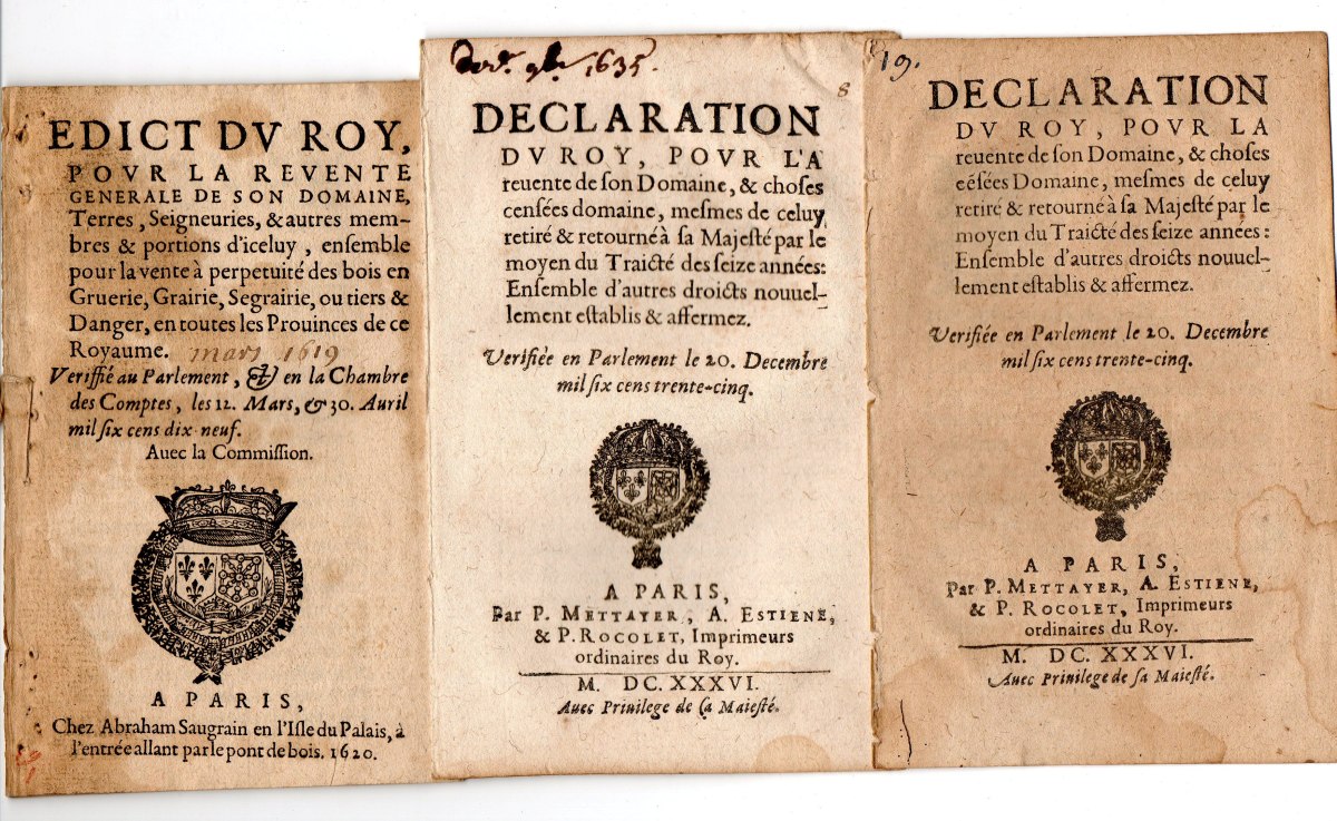 A Paris, par A. Estiene, P. Mettayer, & C. Prevost, 1627, 16 pp., in-12 - Edict du roy pour la vente et alienation à faculté de rachapt perpétuel de tout le domaine du comté de forests non aliéné