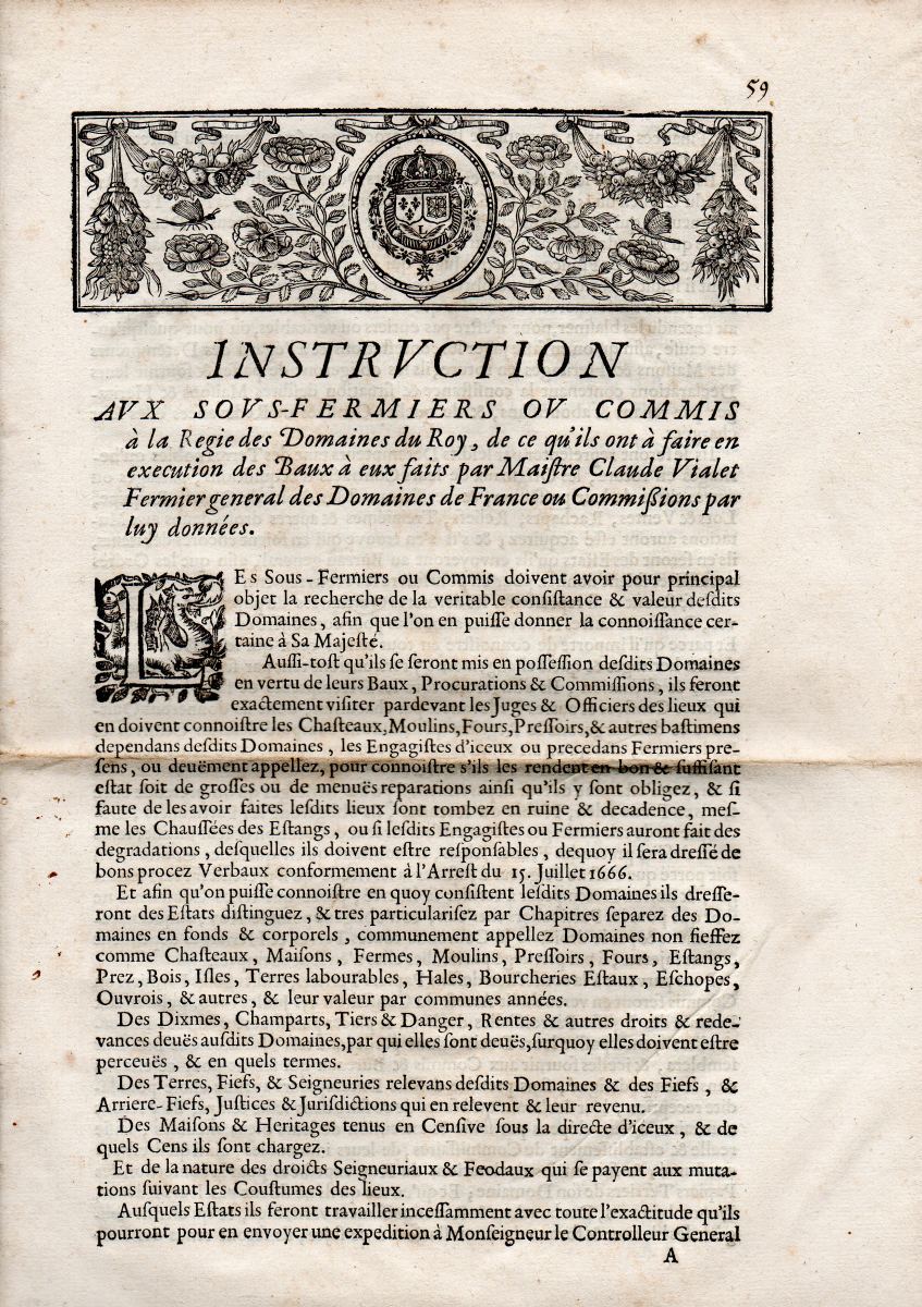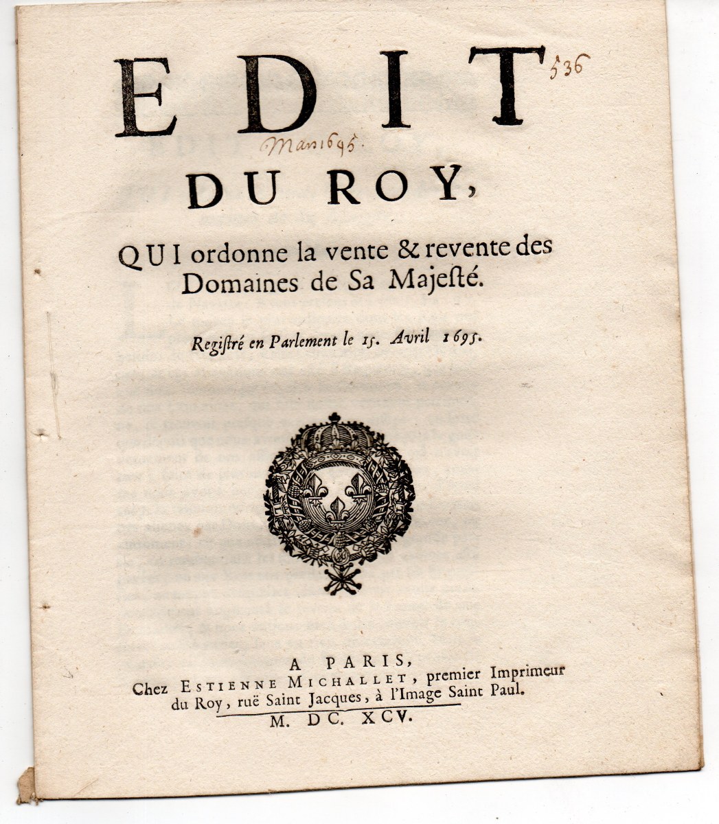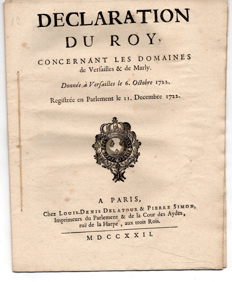 A Paris, Frederic Leonard, 1689, 12 pp., in-8 - Déclaration du roy concernant les maisons bâties à Versailles. A Paris, chez Estienne Michallet, 1693, 4 pp., in-8 - Edit du roy pour l'affranchissement des droits domaniaux dans les villes & fauxbourgs & dans les bourgs fermez du royaume. A Paris, chez Estienne Michallet, 1693, 12 pp., in-4 - Edit du roy qui ordonne la vente & revente des domaines de Sa Majesté. A Paris, chez Estienne Michallet, 1695, 16 pp., in-8 - Déclaration du roy concernant les engagistes des domaines de Sa Majesté. A Paris, chez Estienne Michallet, 1696, 7 pp., in-8 - Edit du roy pour l'union de plusieurs terres & fiefs au domaine & à la justice de Versailles. A Paris, chez François Muguet, 1697, 8 pp., in-8 - Edit du roy qui réunit au domaine de la couronne l'apanage de feu M. le duc de Berry. A Paris, chez la veuve François Muguet & Hubert Muguet, 1714, 4 pp., in-8 - Edit du roy pour la régie du domaine de Versailles & dépendances, mai 1716. A Paris, chez la veuve François Muguet, Hubert Muguet & Louis Denis de la Tour, 1716, 8 pp., in-4 - Déclaration du roy portant reglement sur les baux des maisons de Versailles, 23 juin 1716. A Paris, chez la veuve François Muguet, Hubert Muguet & Louis Denis de la Tour, 1716, 4 pp., in-4 - Reglement de police pour la ville de Versailles. A Paris, chez Louis Denis de la Tour, 1721, 8 pp., in-4 - Déclaration du roy concernant les domaines de Versailles & de Marly, 6 octobre 1722. A Paris, chez Louis Denis de la Tour, 1722, 12 pp., in-8 - Lettres patentes concernant la régie du domaine de Versailles, Marly & dépendances. A Paris, chez Joseph Saugrain, 1723, 8 pp., in-8 - Déclaration du roy pour la réunion au domaine du duché de Vendôme, 4 janvier 1724. A Paris, chez Joseph Saugrain, 1724, 7 pp., in-4 - Arrest du conseil d'estat du roy portant reglement pour les privileges & exemptions des droits du domaine dans la province du Haynault, 11 juillet 1724. Veuve & M-G. Jouvenel, 1724, 16 pp., in-8 - Arrest du conseil d'estat du roy pour la diminution des loyers de la ville de Versailles. A Paris, Louis Denis de la Tour, 1725, 3 pp., in-8 - Instruction pour la régie des domaines de Normandie. A Paris, Pierre Prault, 1736, A Paris, chez Joseph Saugrain, 1736, 11 pp., in-4 - Arrêt du conseil d'état du roi portant règlement sur les ventes & reventes des domaines, 7 mars 1777. A Paris, de l'imprimerie royale, 1777, 10 pp., in-4 - Recueil de plusieurs pièces pour servir aux particuliers qui ont acquis à perpétuité de messieurs les prevost des marchands, & echevins de la ville de Paris, des maisons, places & lieux scituez sur les fossez, remparts & contrescarpe de ladite ville. A Paris, Lottin l'aîné, 1778, 24 pp., in-4 - Lettres de validation de contrats de ventes et concessions de places pour l'hostel de ville de Paris. A Paris, Augstin-Martin Lottin l'aîné, 1778, 14 pp., in-4 - Règlement fait par le roi pour la formation & la composition de l'assemblée municipale de la ville de Versailles, 18 novembre 1787. A Paris, de l'imprimerie royale, 1787, 10 pp., in-4 - Edit du roi par lequel le roi ordonne la démolition ou la vente des châteaux de la Muette, Madrid, Vincennes & Blois
