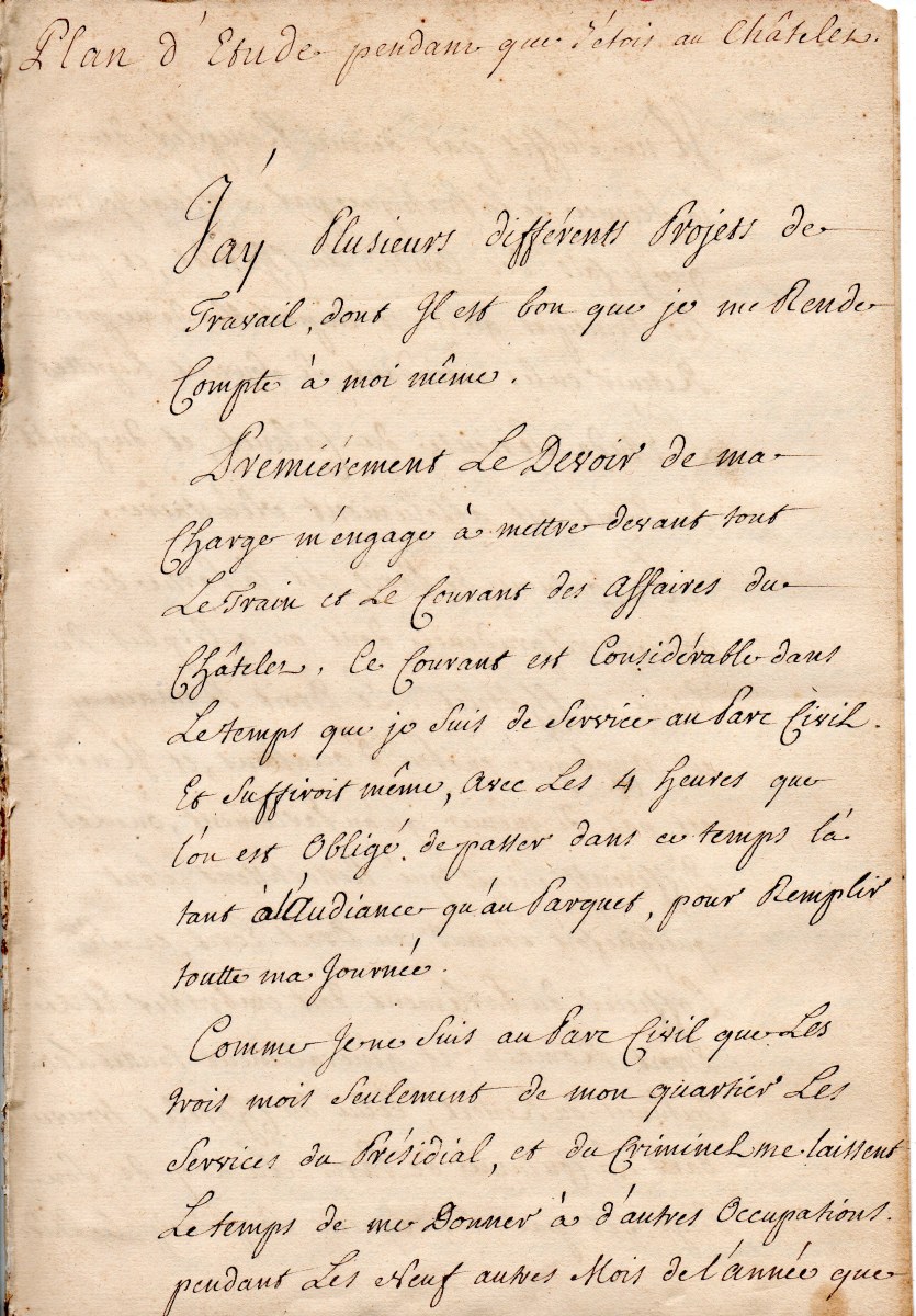) Le devoir de ma charge m'engage à mettre devant tout le train et le courant des affaires du Châtelet, ce courant est considérable dans le temps que je suis de service au parc civil et suffirait même, avec les 4 heures que l'on est obligé de passer dans ce temps là tant à l'audiance qu'au parquet, pour remplir toute ma journée. Comme je ne suis au parc civil que les trois mois seulement de mon quartier les services du présidial, et du criminel me laissent le temps de me donner à d'autres occupations pendant les neuf autres mois de l'année que j'y passe. Il ne suffit pas de me remplir de la science de la pratique par l'usage journalier que je fais des causes du Châtelet (
