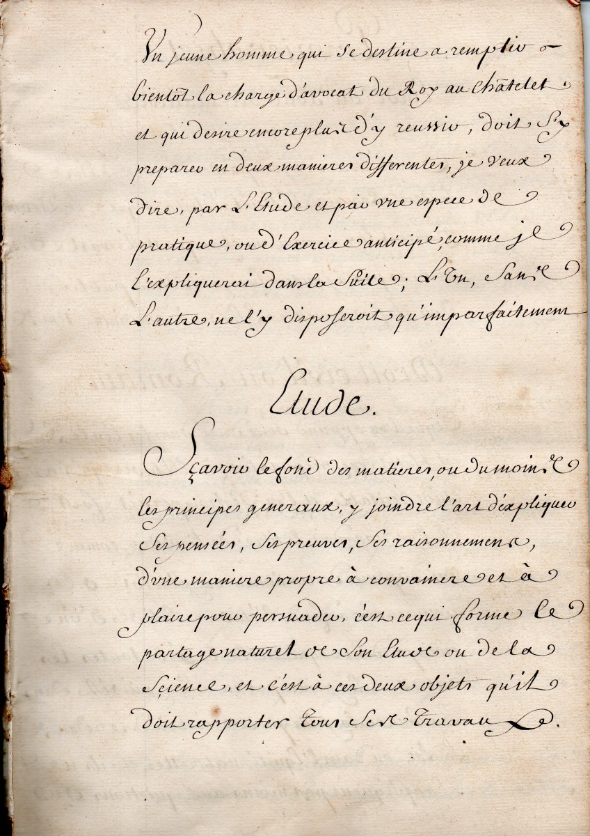 " Un jeune homme qui se destine à remplir bientôt la charge d'avocat du roy au Châtelet et qui désire encore plus d'y réussir, doit s'y préprarer en deux manières différentes, je veux dire, par l'étude et par une espèce de pratique ou d'exercice anticipé, comme je l'expliquerai dans la suite ; l'un, sans l'autre ne l'y disposerait qu'imparfaitement. (