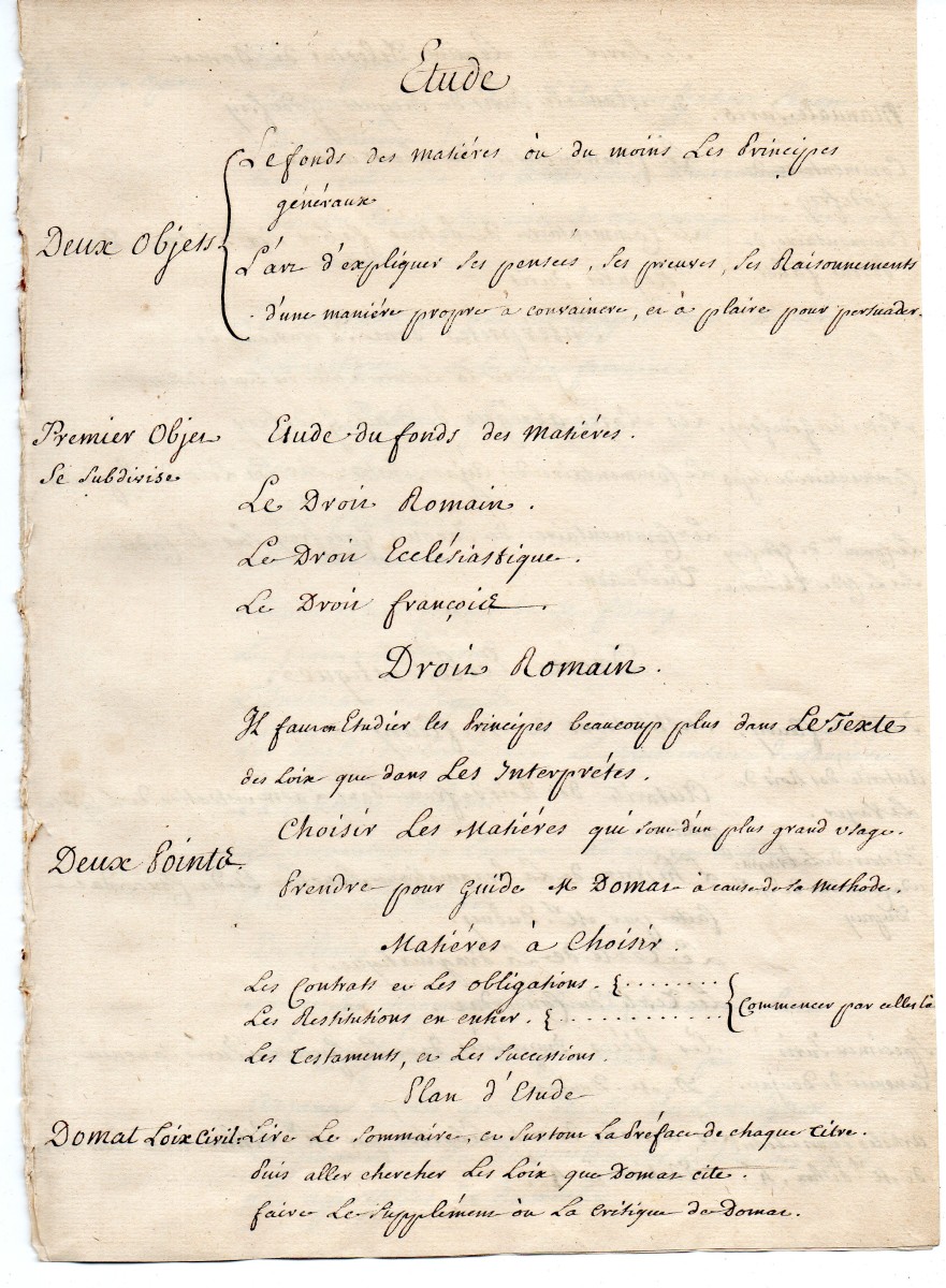 Paragraphes développés dans le manuscrit: Etude du fond des matières: droit civil ou romain ; droit ecclésiastique ; droit français - Etude des règles sur la manière de traiter les différentes matières et sur le style ou l'élocution: art de prouver ; art de plaire en prouvant et pour mieux prouver ; exercice ou pratique.