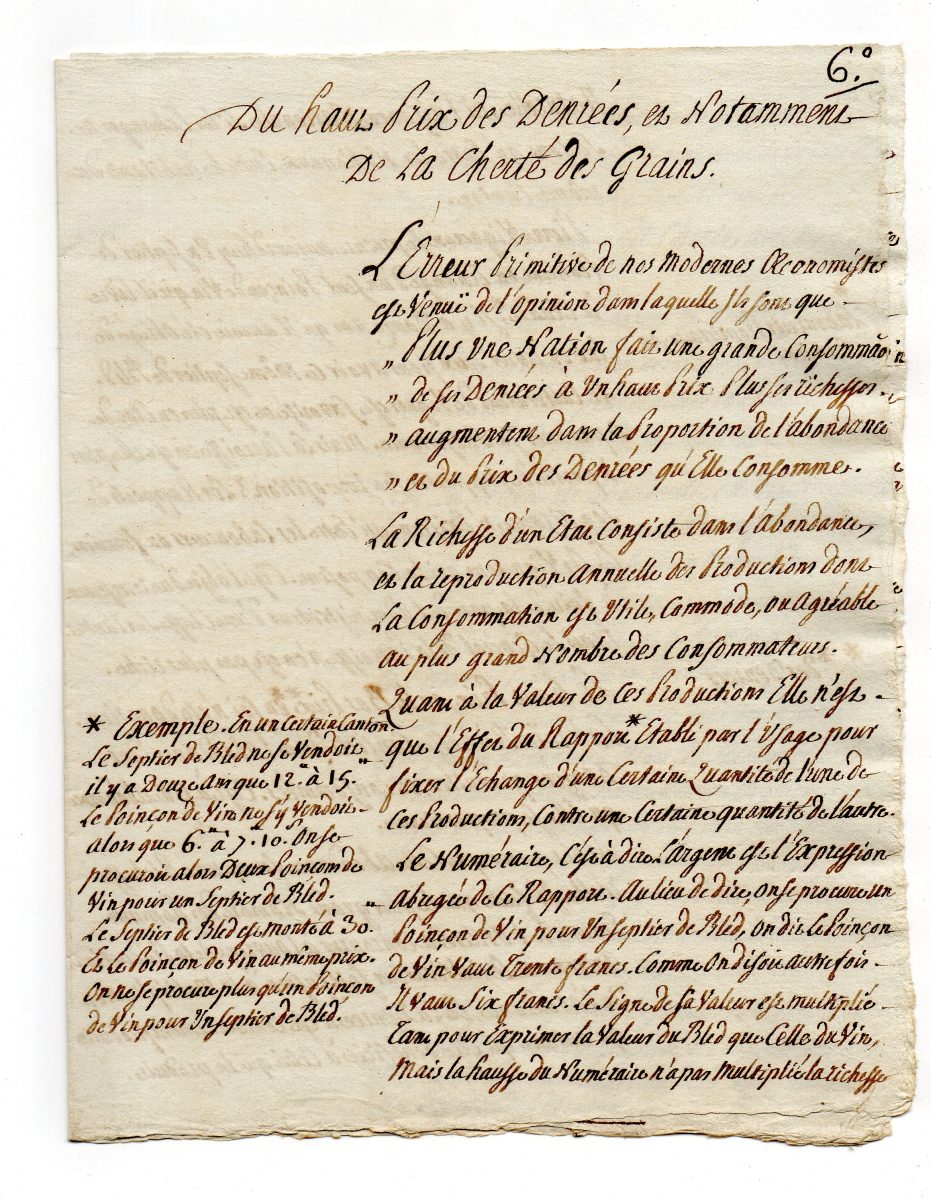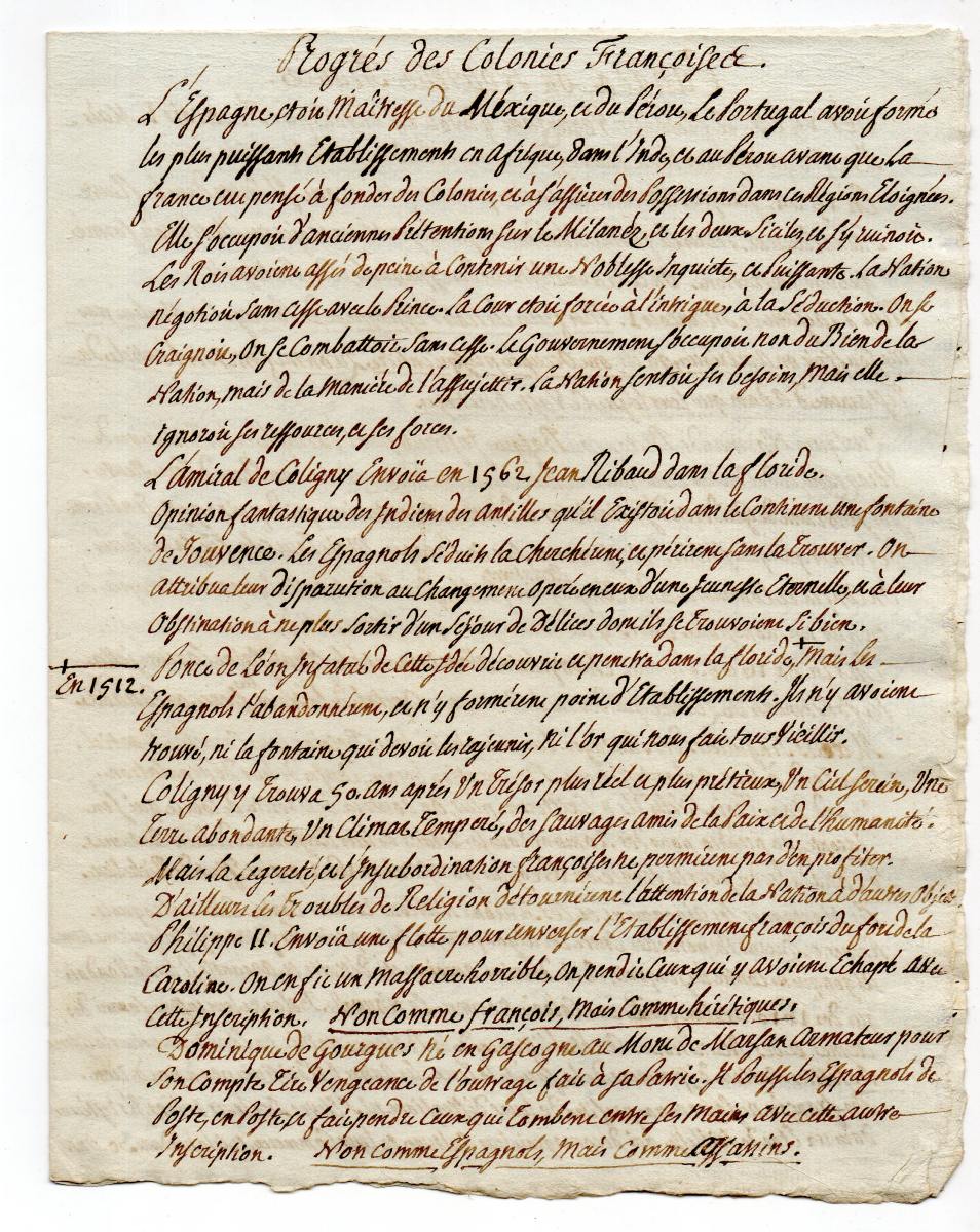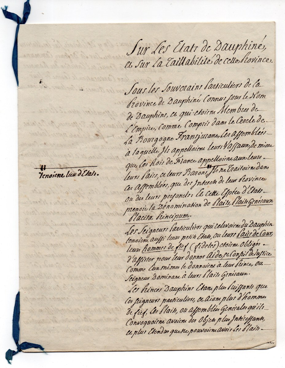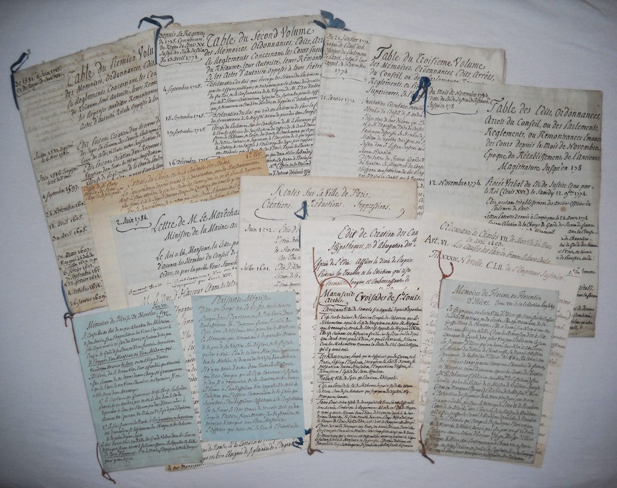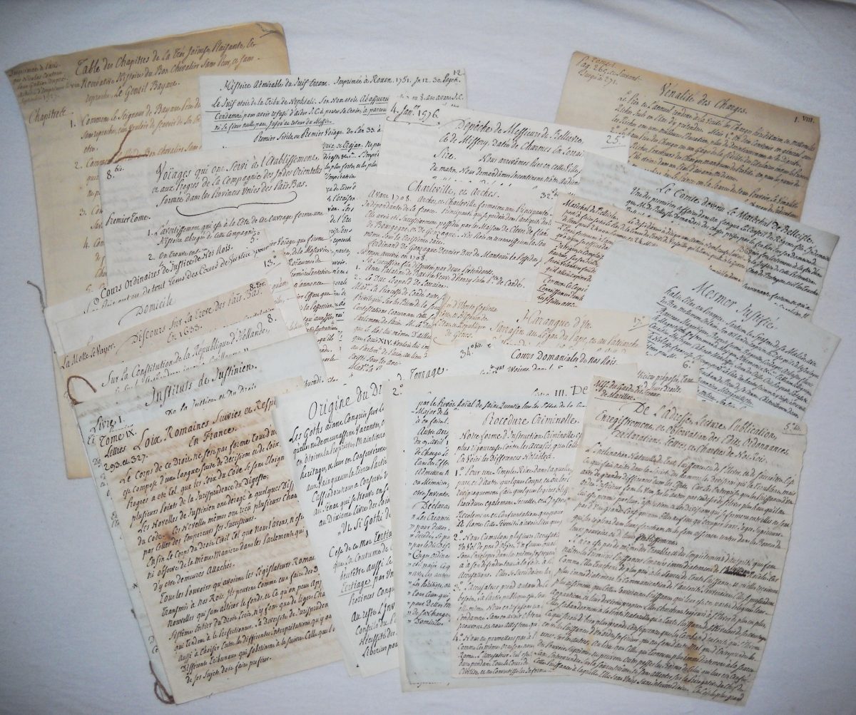 Joint: 42 pièces manuscrites autographes de Pierre-Jean-François de La Porte, non datées: réflexions personnelles dont Etude, 2 ff., in-fol. ; Sur les Etats de Dauphiné et sur taillaibillité de cette province, 6 ff., in-8 ; Du haut prix des denrées et notamment de la cherté des grains, 2 ff., in-8 ; Progrès des colonies françaises, 2 ff., in-8 - notes de lecture et références d'ouvrages dont Voïages qui ont servi à l'établissement et aux progrès de la compagnie des Indes Orientales formée dans les provinces Unies des Païs Bas, 5 ff., in-fol. ; Histoire admirable du juif errant, 2 ff., in-4 ; tables des volumes des mémoires, ordonnances, édits, arrêts et règlements concernant les cours supérieures du royaume