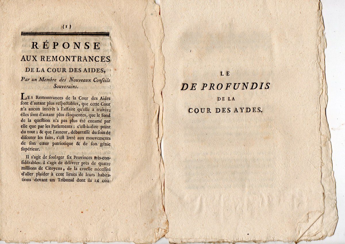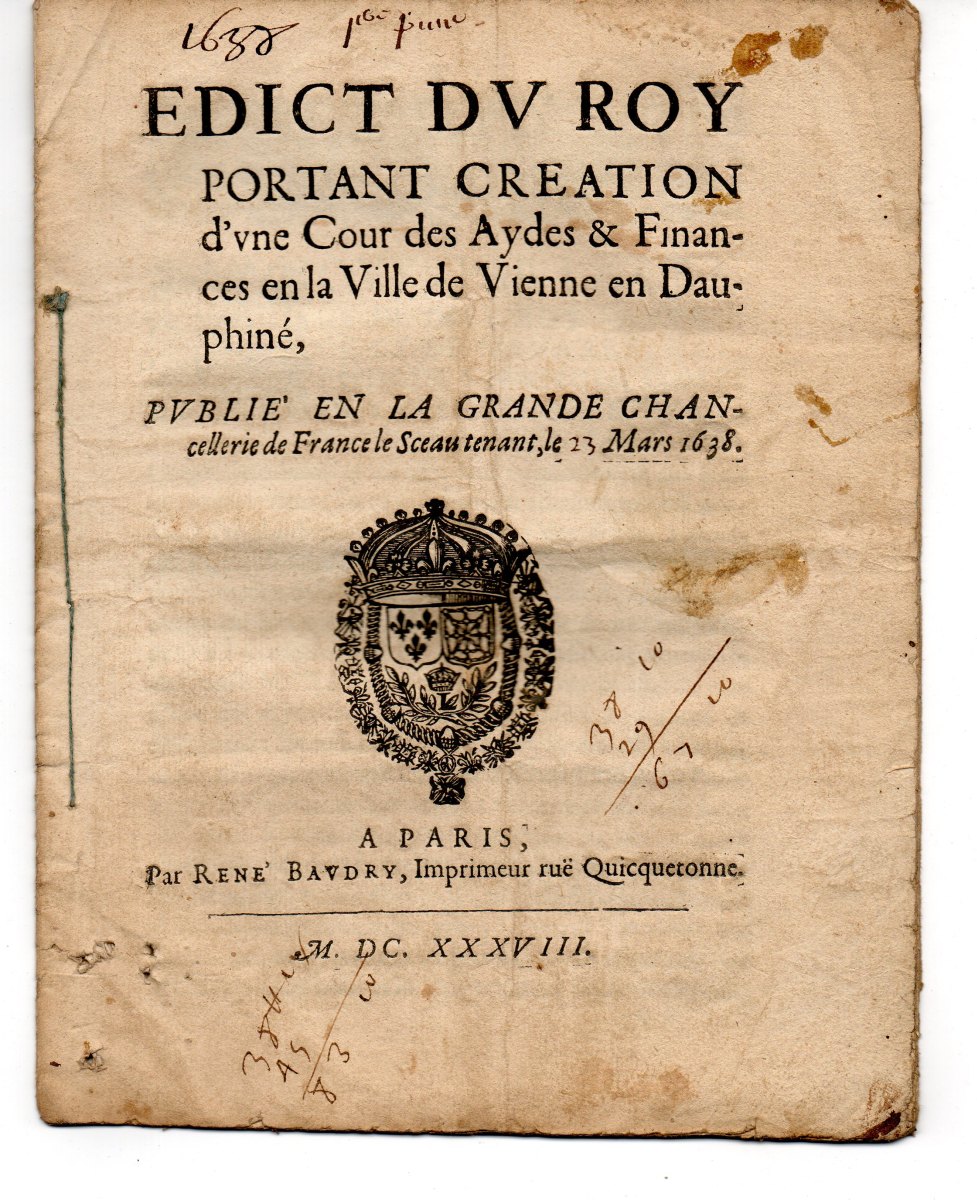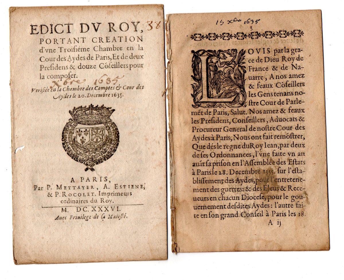 Edit du roy portant establissement de la seconde chambre de la cour des aydes, avec confirmation de l'autorité, juridiction & connoissance de la cour des aydes de Paris, mars 1551. A Paris, chez François Muguet, 1696, 8 pp., in-8 - Edict du roy sur le fait de l'ampliation de l'auctorité, cognoissance, & juridiction de la court des aydes, & finances en Normandie… On les vend à Rouen, par Marin le Mesgissier, 1552, (11) pp., in-12 - Lettres patentes du roy sur la sceance & presceance de messieurs les presidens de la cour des aydes contre messieurs les conseillers de la grande chambre & autres du parlement. 1597, 4 pp., in-4 - Recueil des edicts, declarations, reglemens, ordonnances & arrests, concernans l'authorité, juridiction & connoissance de la cour des aydes de Paris. 1611, 40 pp., in-12 - Edict du roy portant creation d'une troisieme chambre en la cour des aydes de Paris, et de deux presidens & douze conseillers pour la composer. A Paris, par P. Mettayer, A. Estiene & P. Rocolet, 1636, 8 pp., in-12 - Edict du roy portant creation d'une cour des aydes & finances en la ville de Vienne en Dauphiné. A Paris, par René Baudry, 1638, 16 pp., in-8 - Edict du roy donné au mois d'octobre M. DC. LVIII portant revocation de la cour des aydes cy-devant establie à Vienne… A Grenoble, chez Antoine Verdier, 1658, 14 pp., in-8 - Déclaration du roy portant reglement des audiances de la cour des aydes & rétablissement des appointemens au conseil. A Paris, chez Damien Foucault, 1673, 7 pp., in-4 - Edit du roy portant creation d'officiers en la cour des aydes de Paris. A Paris, chez Guillaume Desprez, 1691, 7 pp., in-8 - Déclaration du roy portant reglement entre la cour de parlement & la cour des aydes de Bordeaux, 24 aoust 1734. A Paris, de l'imprimerie royale, 1734, 24 pp., in-4 - Le De Profundis de la cour des aydes. [1771], 16 pp., in-8 - Réponse aux remontrances de la cour des aides par un membre des nouveaux conseils souverains. [1771], 7 pp., in-8 - Procès-verbal de ce qui s'est passé à la séance tenue en la cour des aides de Paris, en présence de Monseigneur le Comte d'Artois, le samedi 12 novembre 1774. P.G. Simon, 1774, 28 pp., in-4 - Procès-verbal de ce qui s'est passé au rétablissement de la cour des aides de Clermont-Ferrand, lundi 5 décembre 1774. P.G. Simon, 1774, 12 pp., in-4 - Procès-verbal de ce qui s'est passé à la séance tenue en la cour des aides du roi en présence de Monsieur, frère du roi. A Paris, chez Knapen, 1775, 16 pp., in-4 - Procès-verbal de ce qui s'est passé à la séance tenue en la cour des aides de Paris, en présence de monseigneur le comte d'Artois, mardi 19 mars 1776. A Paris, chez Knapen, 1776, 16 pp., in-4 - etc.