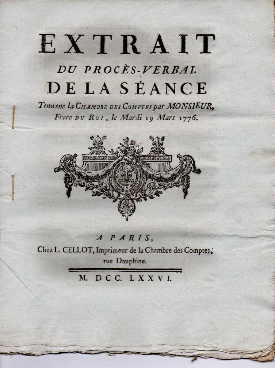 A Paris, chez Estienne Michallet, 1692, 7 pp., in-8 - Déclaration du roy portant reglement pour les receptions des foy, hommages, aveus & denombremens des vassaux de Sa Majesté. A Paris, au Palais, chez Henry Charpentier, 1703, 8 pp., in-8 - Déclaration du roy portant reglement entre la chambre des comptes & la cour des aydes, sur le fait de leur juridiction. A Paris, de l'imprimerie royale, 1727, 8 pp., in-8 - Distribution des chambres de messieurs les conseillers auditeurs en la chambre des comptes, 2 juillet 1759. Chez la veuve Delormel, 24 pp., in-16 - Edit du roi portant suppression de la chambre des comptes de Blois, juillet 1775. A Paris, de l'imprimerie royale, 1775, 4 pp., in-4 - Extrait du procès-verbal de la séance tenue en la chambre des comptes par Monsieur, frère du roi, mardi 19 mars 1776. A Paris, chez L. Cellot, 1776, 22 pp., in-4 - etc.