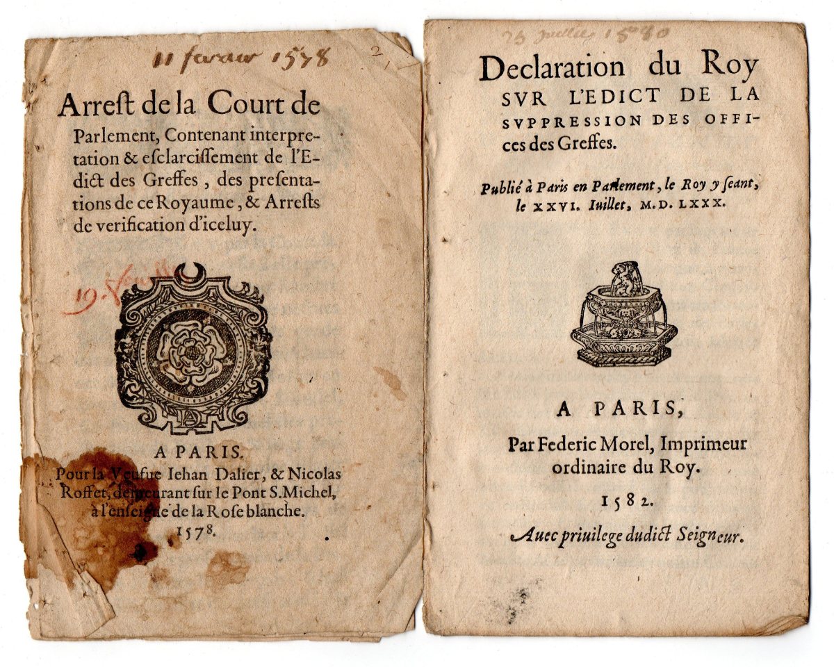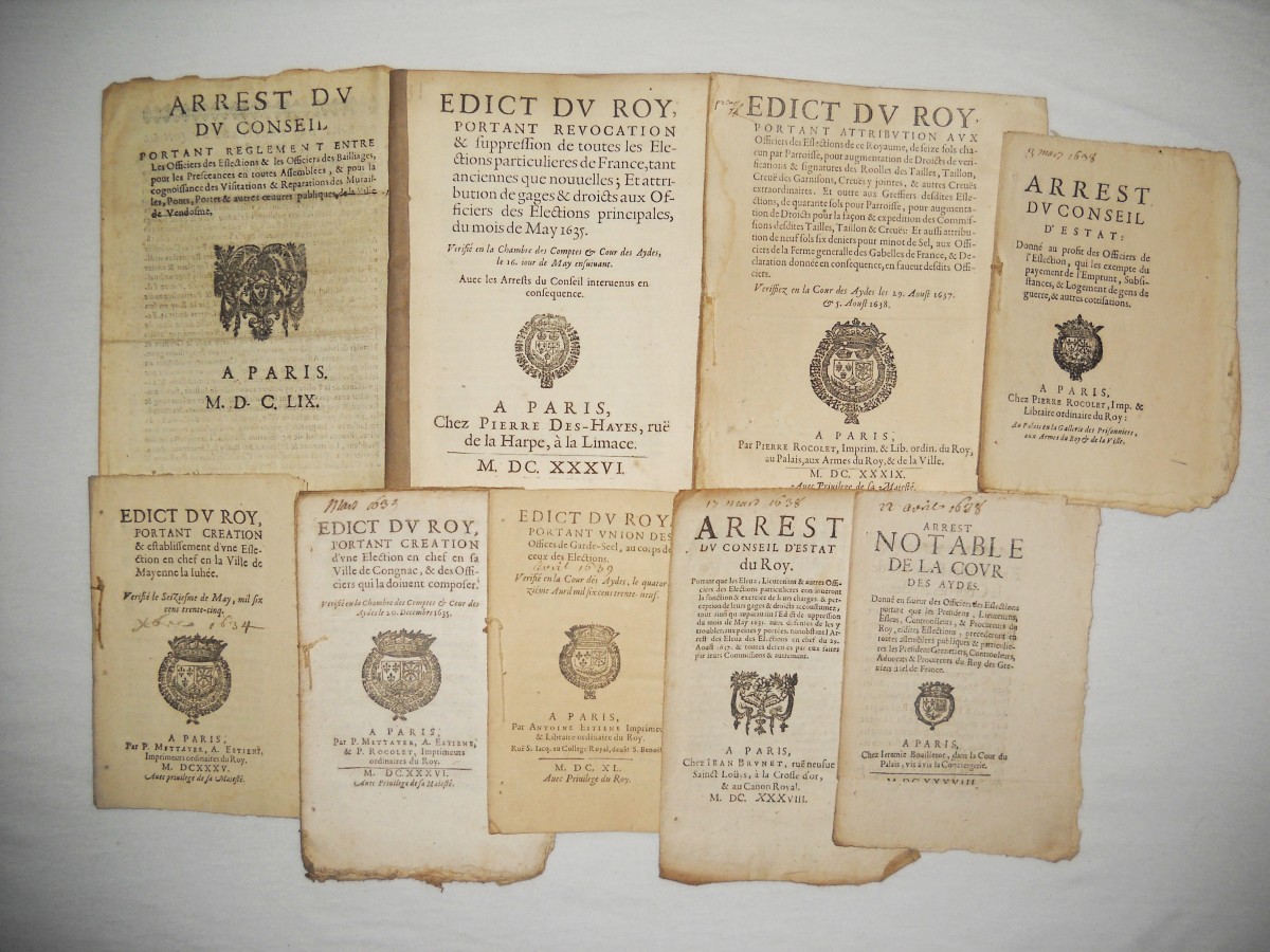 A Paris, chez Pierre Des Hayes, 1636, 47 pp., in-8 - Edict du roy portant creation de divers officiers es elections de ce royaume. A Paris, 1655, 19 pp., in-8 - Arrests de la cour de parlement obtenus par les officiers du roy au baillage de Vermandois, siege royal & presidial de Reims. A Reims, chez Jean Multeau, 1664, 16 pp., in-8 - Arrest portant reglement general entre les sieurs president, lieutenant, assesseur, eleus, & controleurs eleus, conseillers du roy en l'election de Paris, pour les fonctions & droits de leurs charges. A Paris, chez François Muguet, 1698, 24 pp., in-8 - etc.