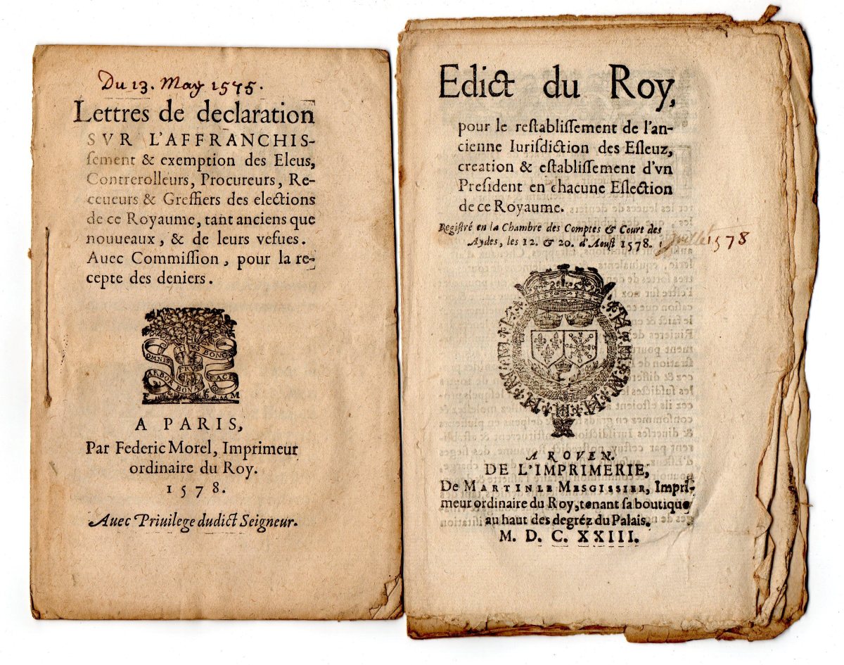 A Paris, chez Fed. Morel, 1622, 23 pp., in-12 - Déclaration du roy en faveur des presidens et lieutenans des eslections de ce royaume. A Paris, chez Fed. Morel & P. Mettayer, 1624, 16 pp., in-12 - Edict du roy portant revocation & suppression de toutes les elections particulieres de France tant anciennes que nouvelles