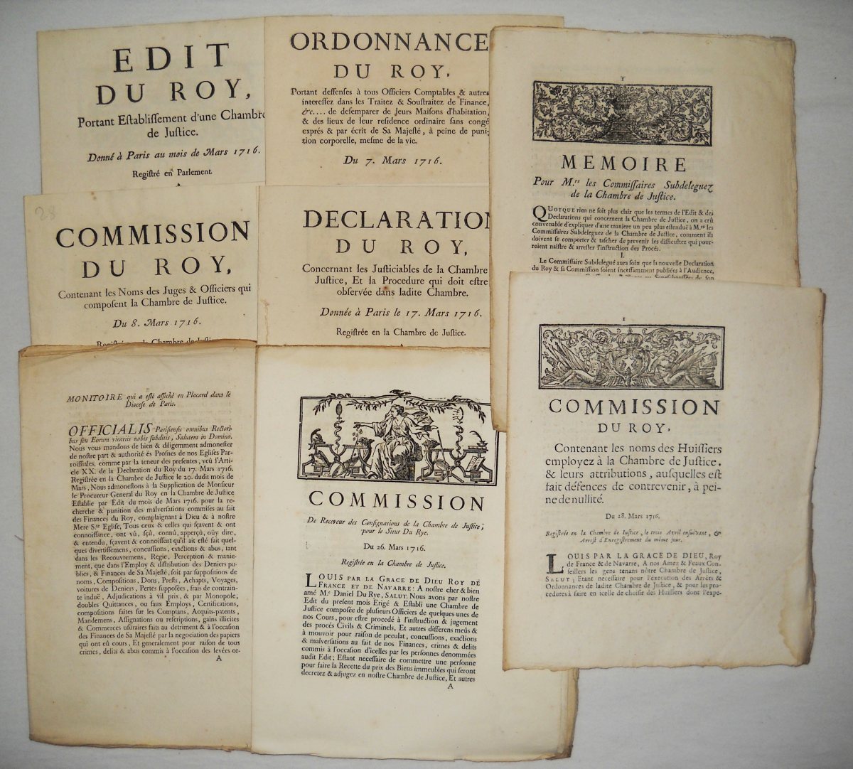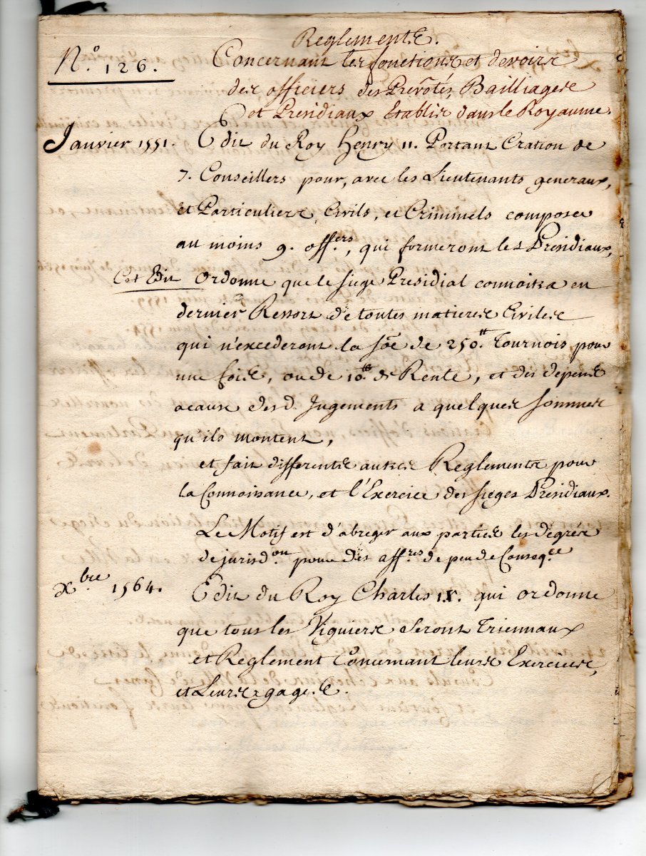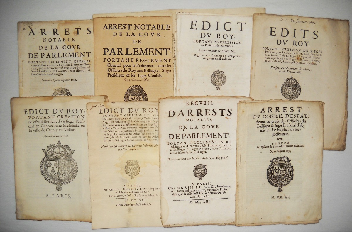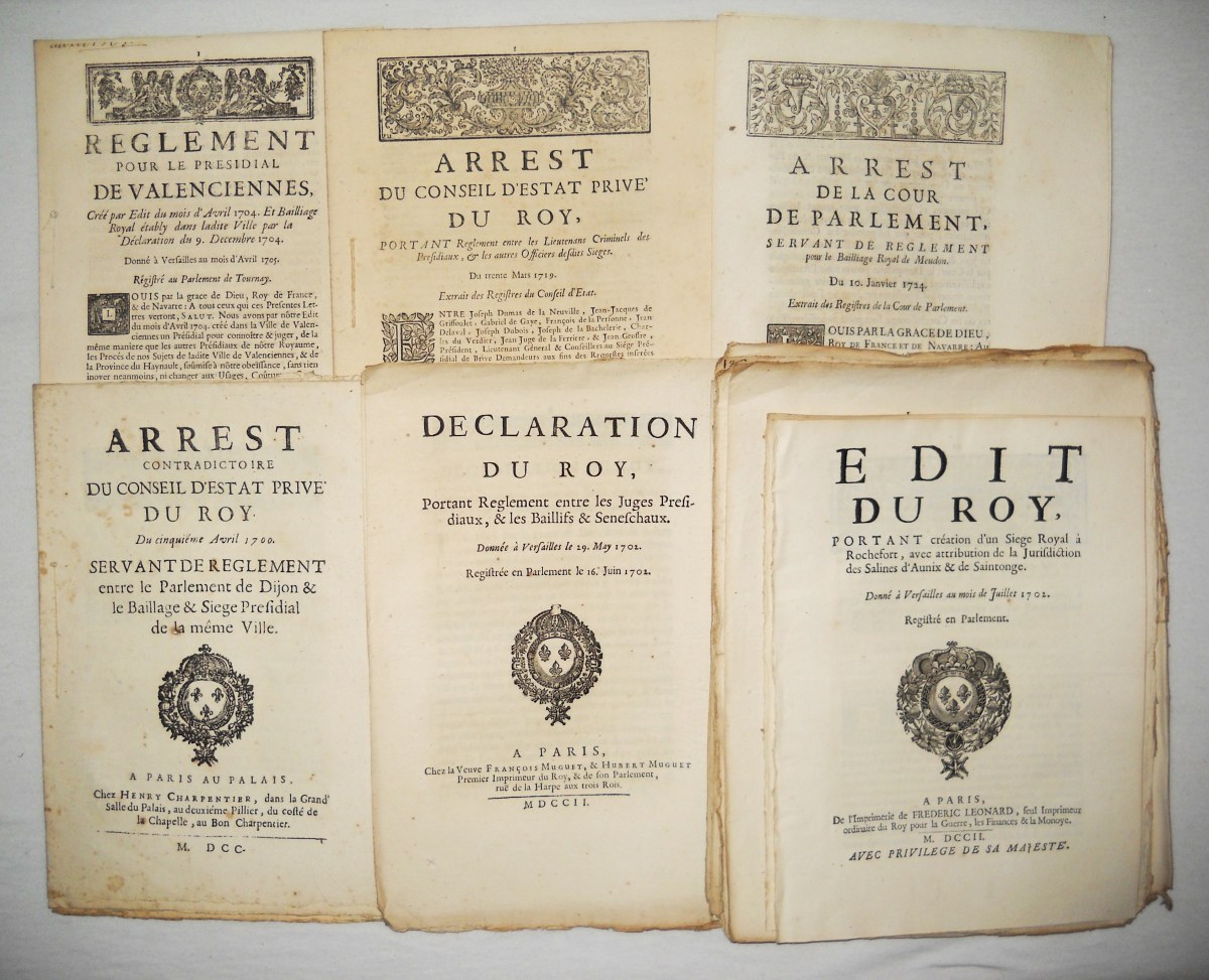 [JUSTICE - TRIBUNAUX] - Lettres patentes, édits, déclarations, ordonnances, arrêts du conseil d'état du roi, arrêts de la cour de parlement, arrêts de la chambre de justice et divers, relatifs aux circonscriptions judicaires (bailliages, présidiaux, sénéchaussées, vicomtés, vigueries) et à la chambre de justice.