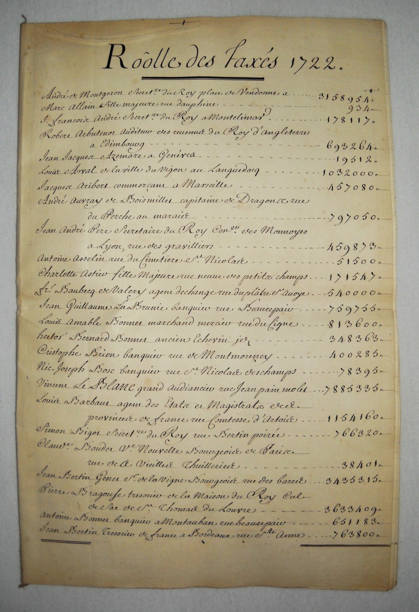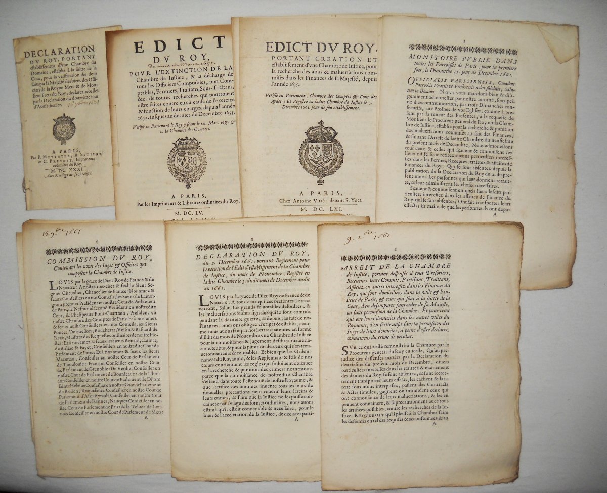 Env. 335 pièces imprimées et copies manuscrites, 1583-1789, tous formats, dont 31 pièces du règne de Louis XIII et réunion de pièces sur la chambre de justice avec quelques documents manuscrits dont " Noms des fermiers généraux qui n'ont fait aucun traité, affaires extraordinaires, ny exercé aucune charge comptable et qui neantmoins ont esté dans les rolles des taxes de la chambre de justice pour les sommes cy apres et depuis par moderation ", 1 p. in-fol. ; " Roôle des taxés 1722 ", 12 pp., in-fol.