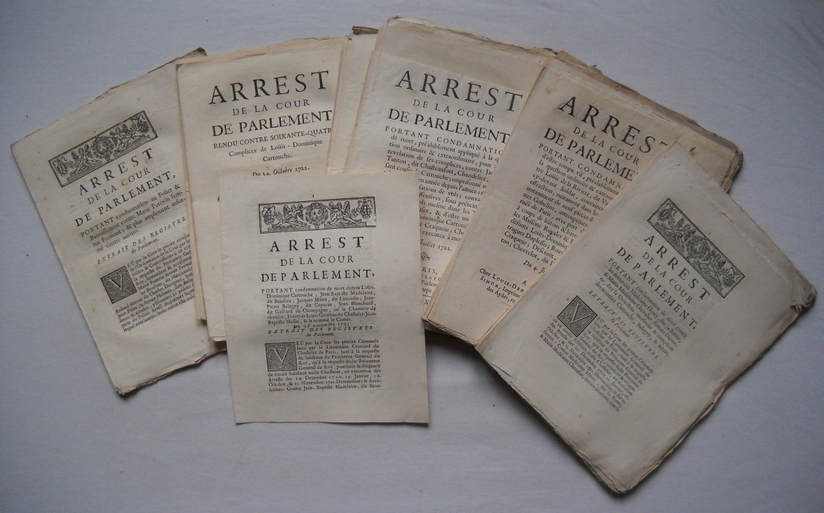 [JUSTICE - AFFAIRE CARTOUCHE] - Arrêts de la cour de parlement portant condamnations à mort et aux galères le célèbre contrebandier Louis-Dominique Cartouche et ses complices.