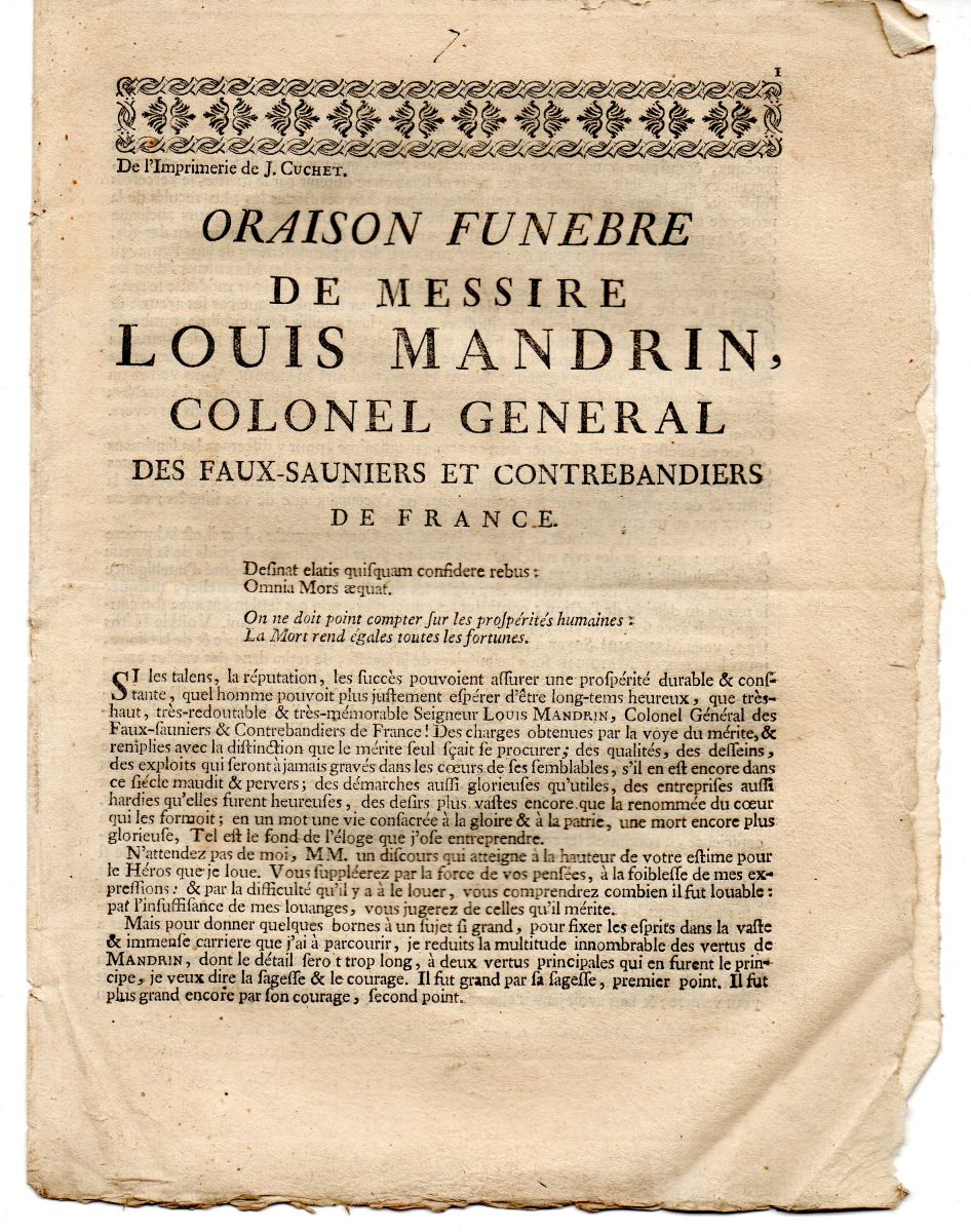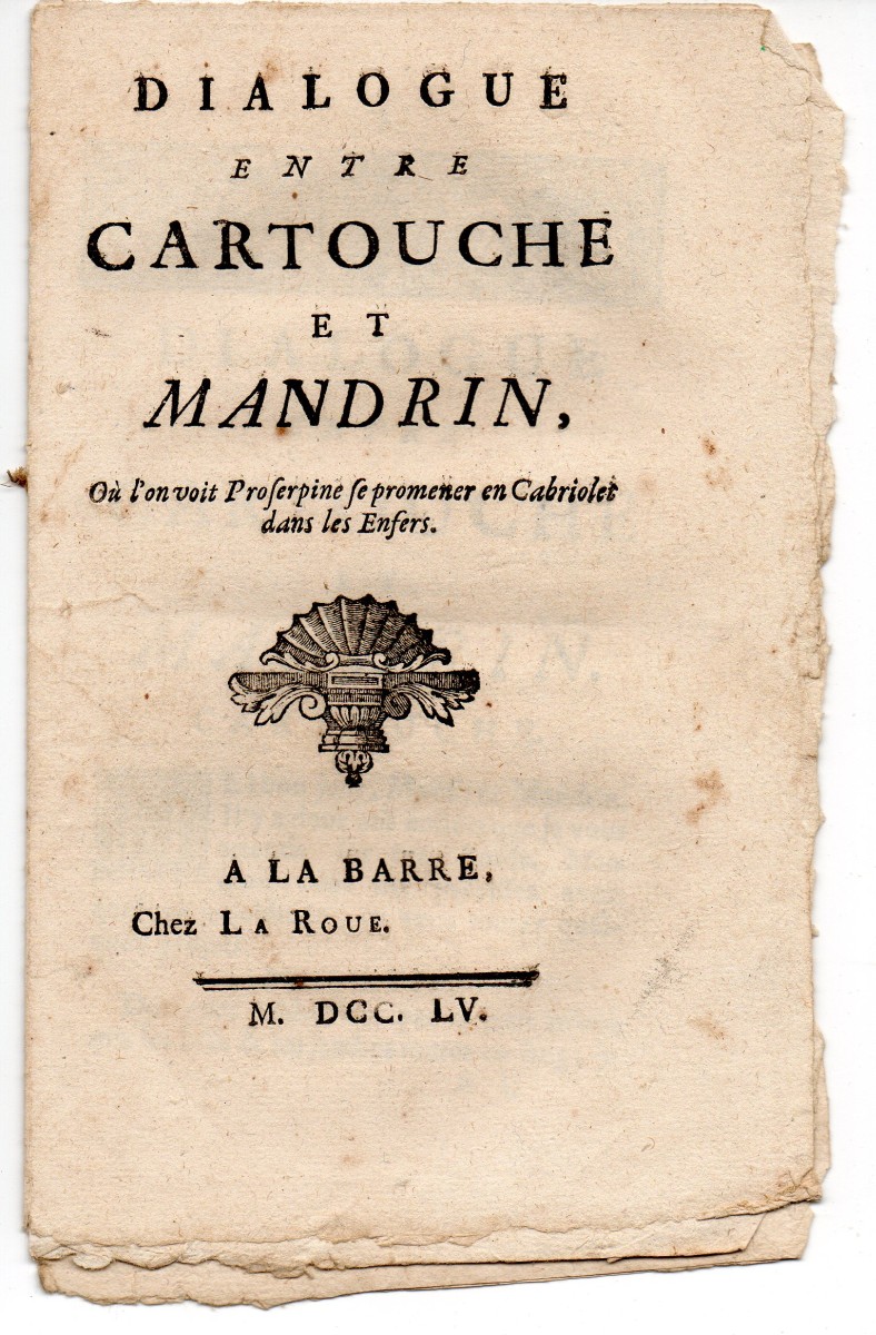 Joint 3 pamphlets: Dialogue entre Cartouche et Mandrin, où l'on voit Proserpine se promener en cabriolet dans les enfers. A la Barre, chez la Roue, 1755, 15 pp., in-12 - Oraison funèbre de messire Louis Mandrin, colonel general des faux-sauniers et contrebandiers de France. A Grenoble, 28 juin 1755, Vallet, 4 pp., in-4 (double exemplaires).