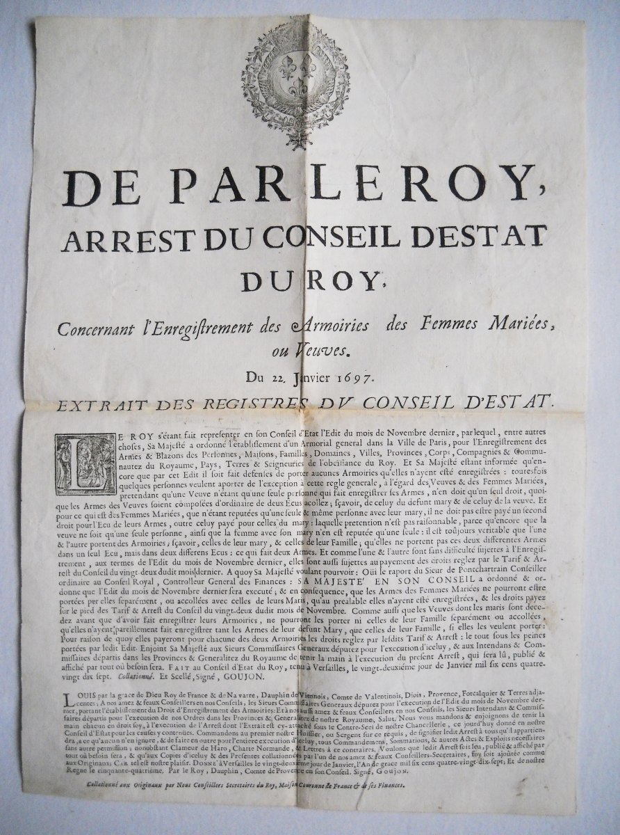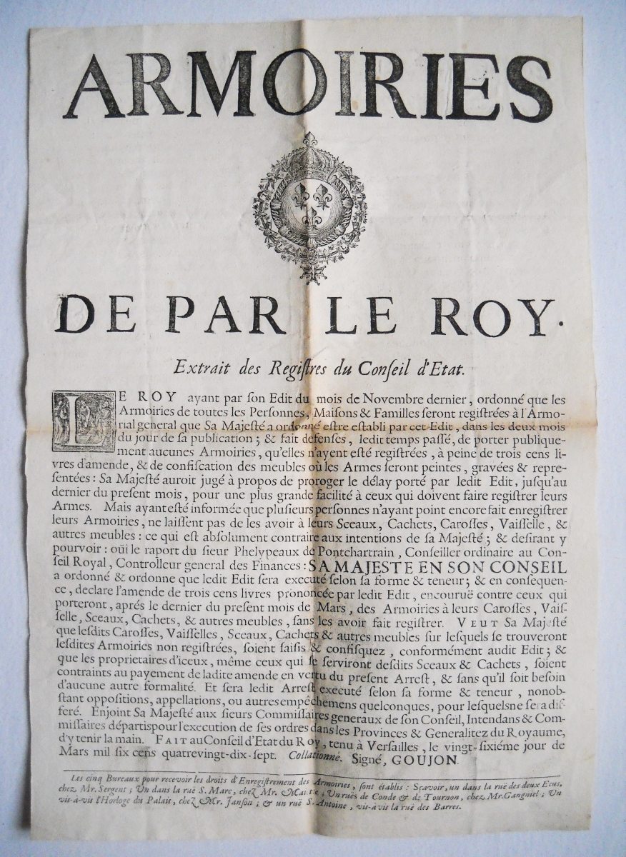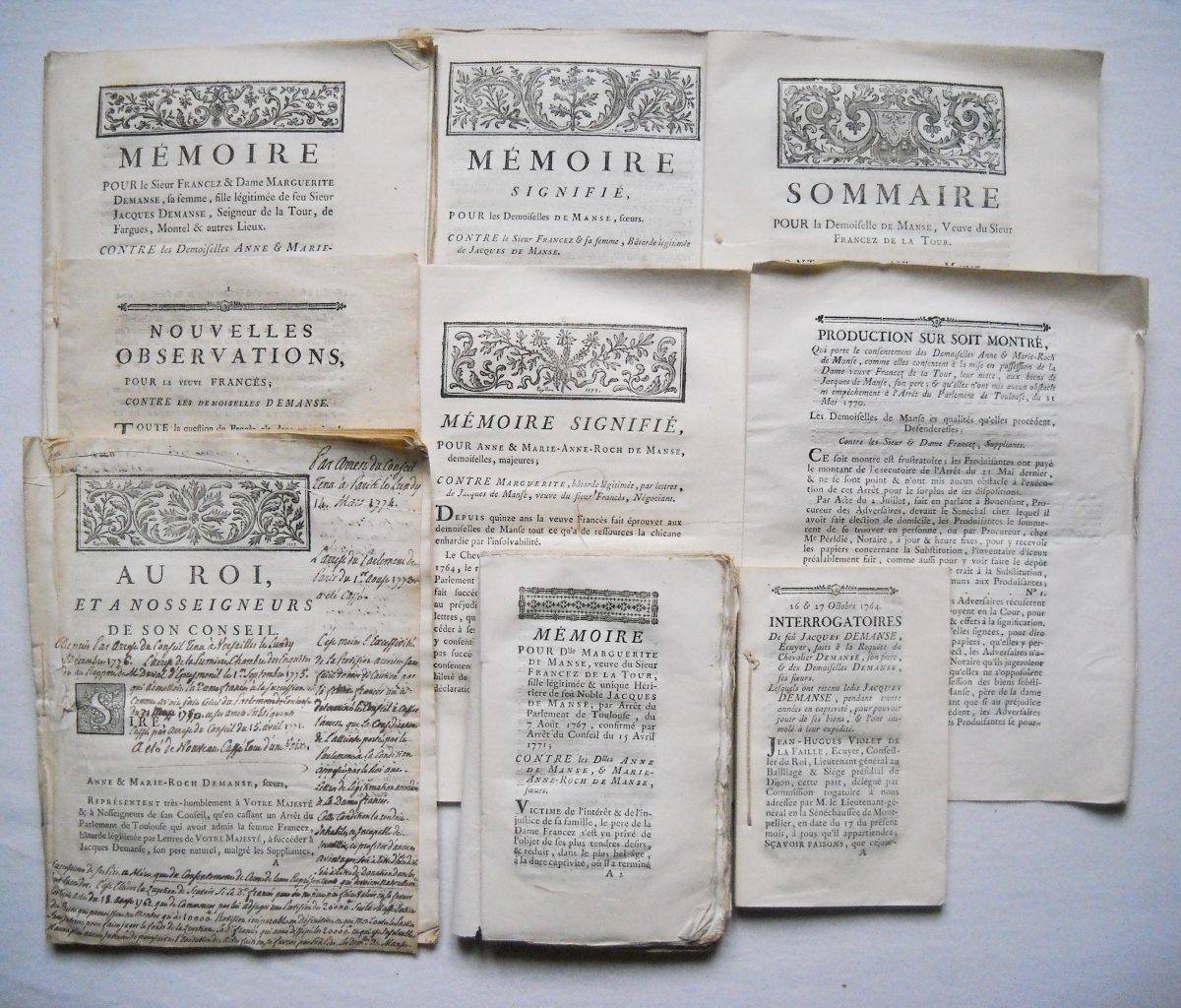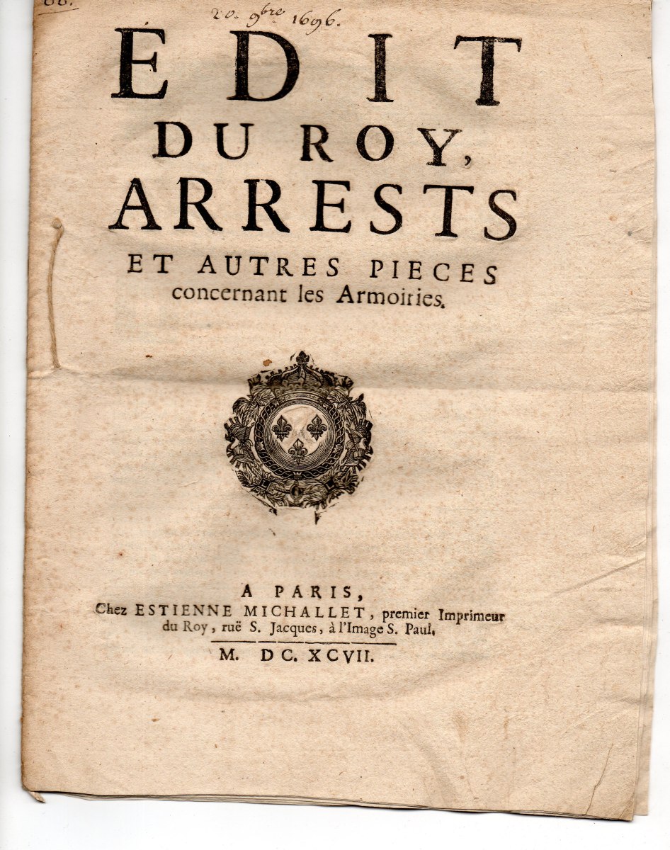 Edit du roy, arrests et autres pièces concernant les armoiries. A Paris, chez Estienne Michallet, 1697, 20 pp., in-4 - Déclaration du roy portant confirmation des lettres de naturalité & de légitimation. A Paris, chez Estienne Michallet, 1697, 8 pp., in-8 - Edit du roy portant création d'une grande maistrise & des maistrises particulieres, composées d'officiers, pour connoistre des differends & contestations qui arriveront à l'occasion des armoiries & blasons. A Paris, chez François Muguet, 1696, 12 pp., in-4 - Arrest du conseil d'estat du roy concernant l'enregistrement des armoiries des femmes mariées, ou veuves, 22 janvier 1697. 34 x 48 cm - Arrest du conseil d'estat du roy qui ordonne la saisie & confiscation des meubles sur lesquels se trouveront des armes non registrées, avec l'amende de trois cent livres, 16 mars 1697. A Paris, chez Estienne Michallet, 1697, 4 pp., in-8 - Declaration du roy qui décharge les bourgeois & habitans de la ville & faux bourgs de Paris de l'exécution de l'édit du mois de juillet 1705 concernant les lettres de bourgeoisie… A Paris, chez la veuve François Muguet & Hubert Muguet, 1706, 6 pp., in-4 - Déclaration du roy qui révoque & annulle les lettres de naturalité accordées aux estrangers non residens dans le royaume. A Paris, chez Louis Denis de la Tour, 1720, 4 pp., in-8 - Ordonnance du roi concernant les armoiries, 29 juillet 1760. A Paris, de l'imprimerie royale, 1760, 16 pp., in-4 - Réunion de 12 pièces concernant l'affaire de Marguerite de Manse veuve Francez de la Tour réclamant la légitimation dont: Mémoire pour Delle Marguerite de Manse… contre les Delles Anne de Manse & Marie Anne Roch de Manse, sœurs. A Paris, Lottin aîné, 1775, 243 pp., in-12 ; Interrogatoires de feu Jacques de Manse… Lottin, 1779, 95 pp., in-12 - Sommaire pour la demoiselle de Manse, veuve du sieur Francez de la Tour contre les demoiselles de Manse. Lottin, 1779, 24 pp., in-4 - etc.