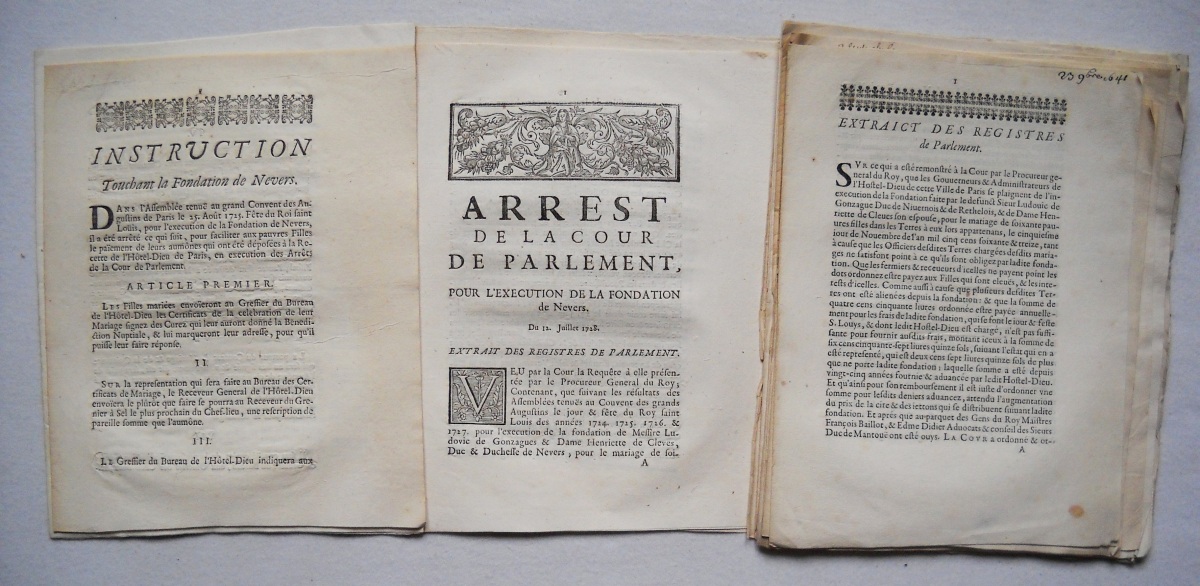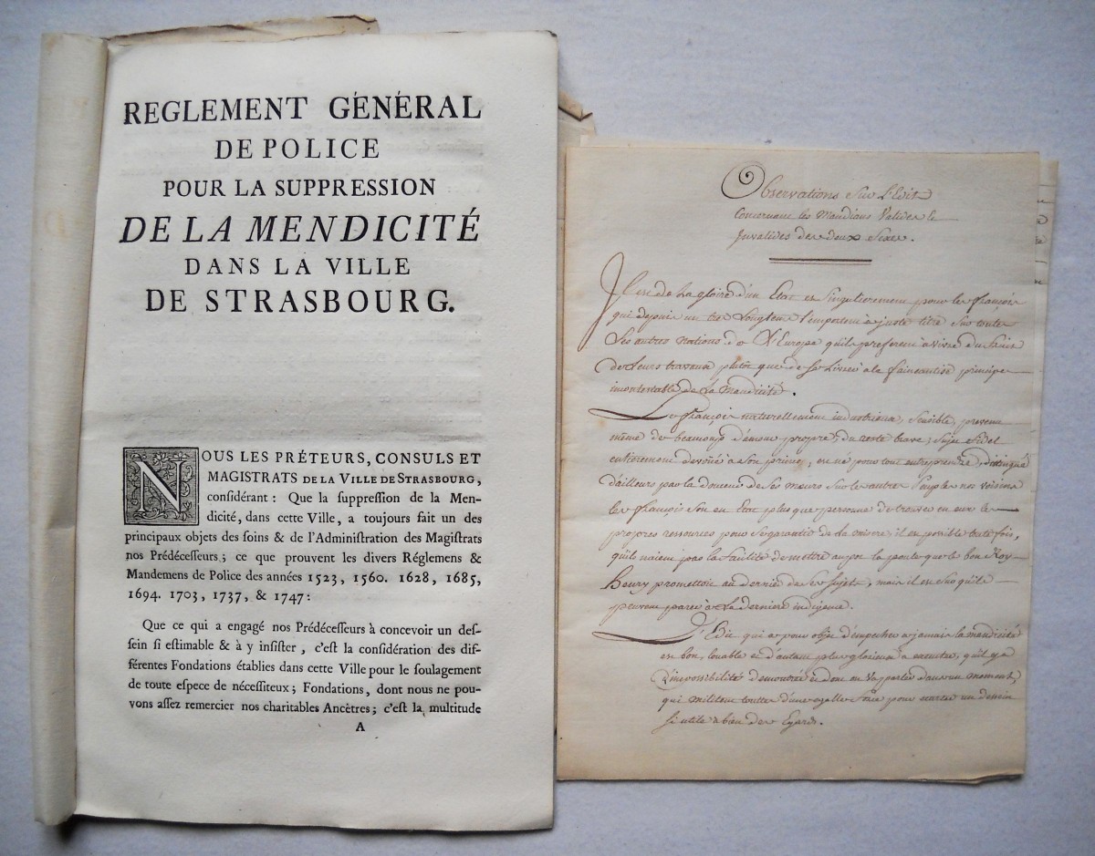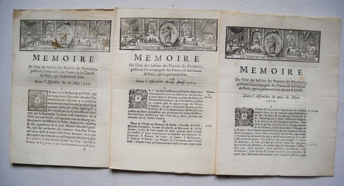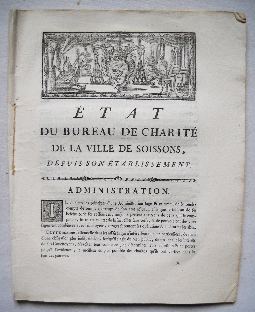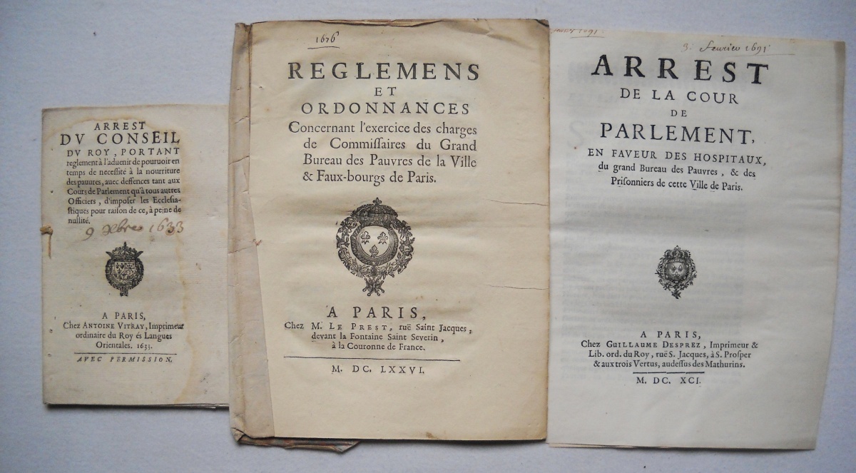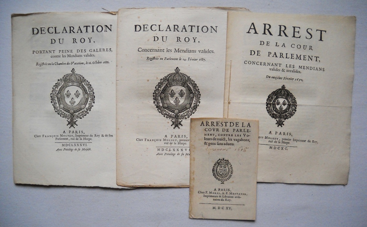 A Paris, chez Antoine Vitray, 1633, 15 pp., in-12 - Edict du roy portant condamnation de la peine des galères, contre les mendians valides, qui auront esté trois fois pris & chastiez en l'hospital general. A Paris, 1661, 8 pp., in-8 - Reglemens et ordonnances concernant l'exercice des charges de commissaires du grand bureau de spauvres de la ville & faux-bourgs de Paris. A Paris, chez M. Le Prest, 1676, 20 pp., in-8 - Déclaration du roy pour deffendre les pelerinages, sans permission du roy & des évêques, 7 janvier 1686. A Paris, de l'imprimerie royale, 1724, 40 x 52 cm - Arrest de la cour de parlement concernant les mendians valides & invalides, 11 février 1690. A Paris, chez François Muguet, 1690, 9 pp., in-4 - Mémoire de l'état des besoins des pauvres des provinces, présenté à l'assemblée des dames de la charité de Paris, qui en prennent soin, 28 mai 1721. 4 pp., in-4 - Idem pour mars et août 1722 - Arrest du conseil d'estat du roy concernant la distribution des aumosnes aux pauvres des paroisses de la ville & faux-bourgs de Paris, 4 mai 1723. A Paris, chez la veuve Saugrain & Pierre Prault, 1723, 4 pp., in-8 - Déclaration du roy concernant les mendians & vagabonds, 18 juillet 1724. A Paris, de l'imprimerie royale, 1724, 12 pp., in-8 - Instruction touchant la fondation de Nevers. A Paris, chez Pierre Simon, 1725, 4 pp., in-8 - Arrest du conseil d'estat du roy portant establissement d'une loterie royale an faveur des pauvres, 22 janvier 1741. A Paris, de l'imprimerie royale, 1741, 7 pp., in-4 - Reglement general de police pour la suppression de la mendicité dans la ville de Strasbourg. A Strasbourg, 1767, chez Jean-François Le Roux, 19 pp., in-fol. - État du bureau de charité de la ville de Soissons depuis son établissement. A Soissons, [1787], Ponce Courtois, 43 pp., in-4 - etc.