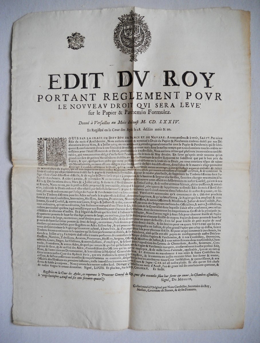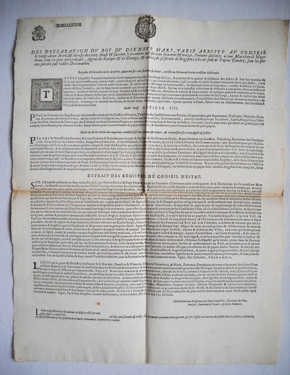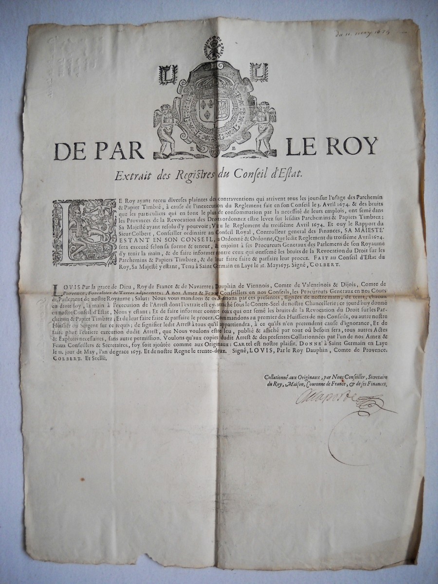 1673, 3 pp., in-fol. - Estat ou mémoire des papiers formulez nécessaires aux greniers & chambres d'impost, vente volontaire & cinq grosses fermes. 1673, 3 pp., in-fol. - Arrest du conseil d'estat du roy portant etablissement d'un droit sur tout le papier & parchemin qui se consomment dans le royaume, 5 avril 1674. A Paris, par Sébastien Mabre-Cramoisy, 1674, 7 pp., in-8 - Déclaration du roy portant reglement pour les ecritures qui doivent estre faites sur papier & parchemin timbrez, 25 juin 1691. A Paris, chez Guillaume Desprez, 1691, 8 pp., in-8 - Lettres patentes du roi qui abrogent l'usage du parchemin pour les quittances, 24 février 1785. A Paris, de l'imprimerie royale, 1785, 3 pp., in-4 - Arrêt du conseil d'état du roi qui établit un bureau de timbre pour la musique, 15 septembre 1786. A Paris, de l'imprimerie royale, 1786, 8 pp., in-4 - Déclaration du roi concernant le timbre, 4 août 1787. A Paris, de l'imprimerie royale, 1787, 32 pp., in-4 - etc.