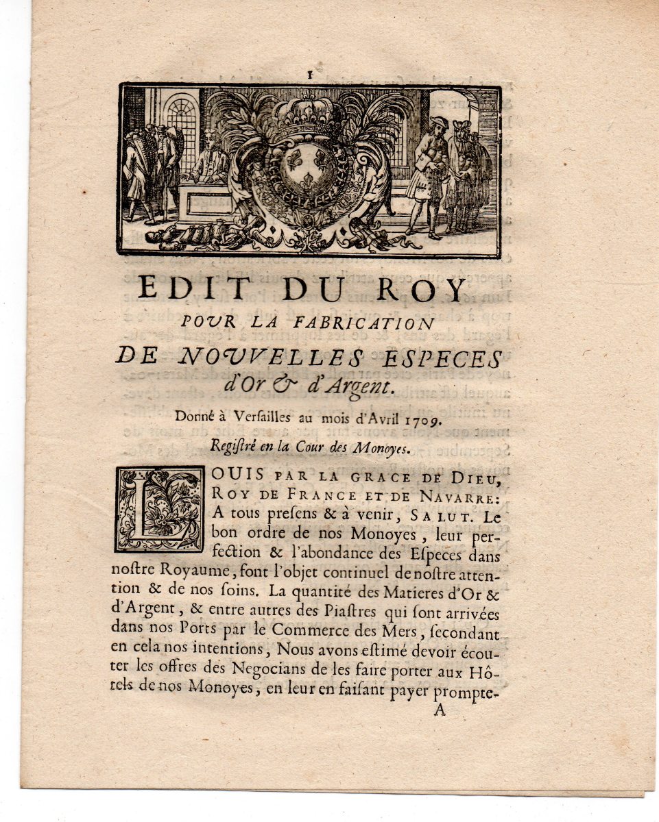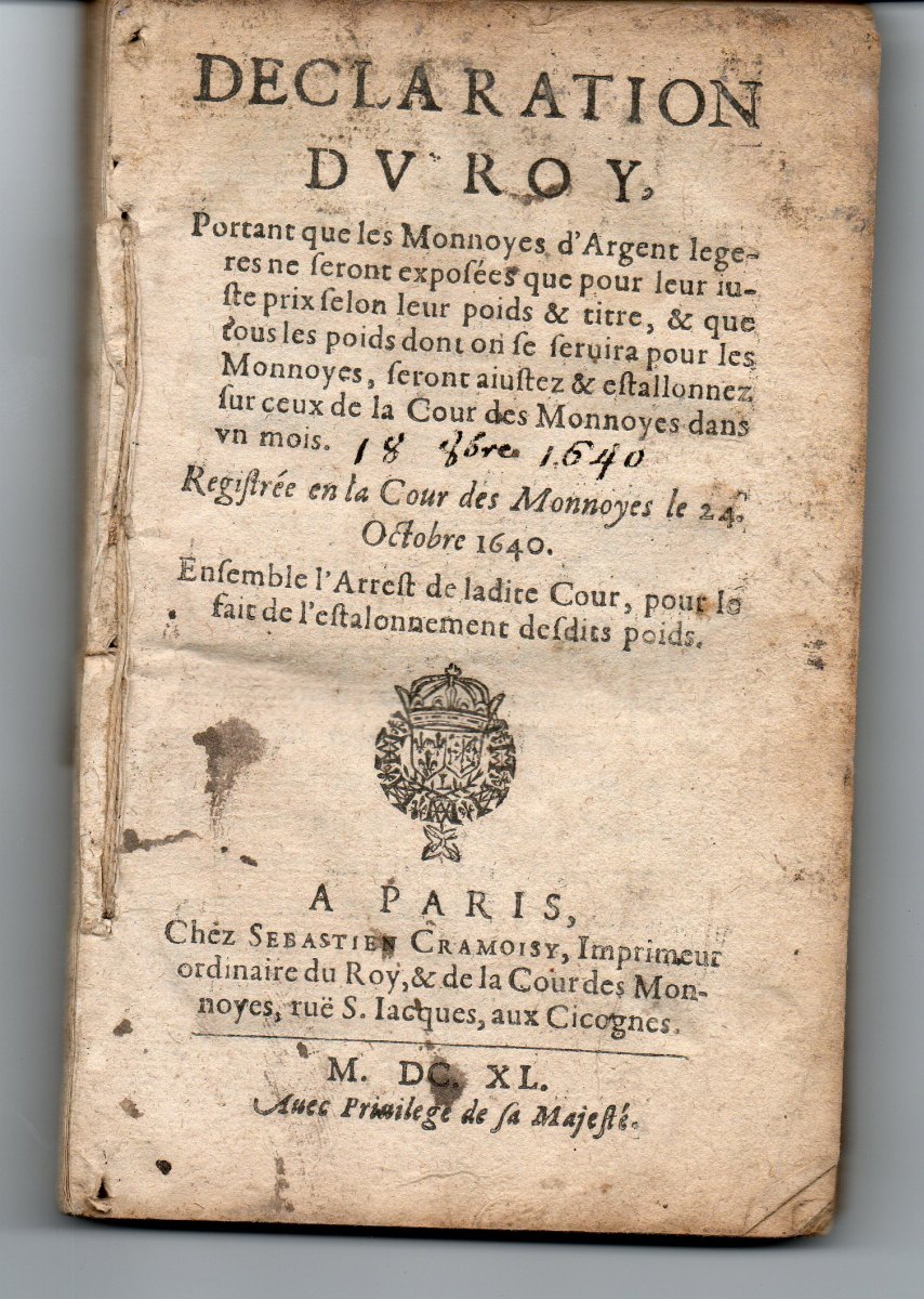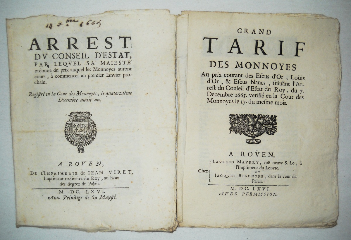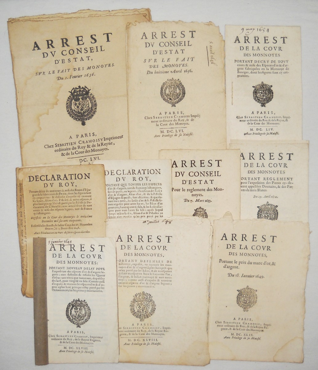 [MONNAIE] - Lettres patentes, édits, déclarations, ordonnances, arrêts du conseil d'état du roi, arrêts de la cour des aydes, arrêts de la cour des monnaies, et divers, relatifs à l'administration et à la règlementation de la monnaie (fabrication, circulation, change, tarifs) et au statut et rôle des officiers.
