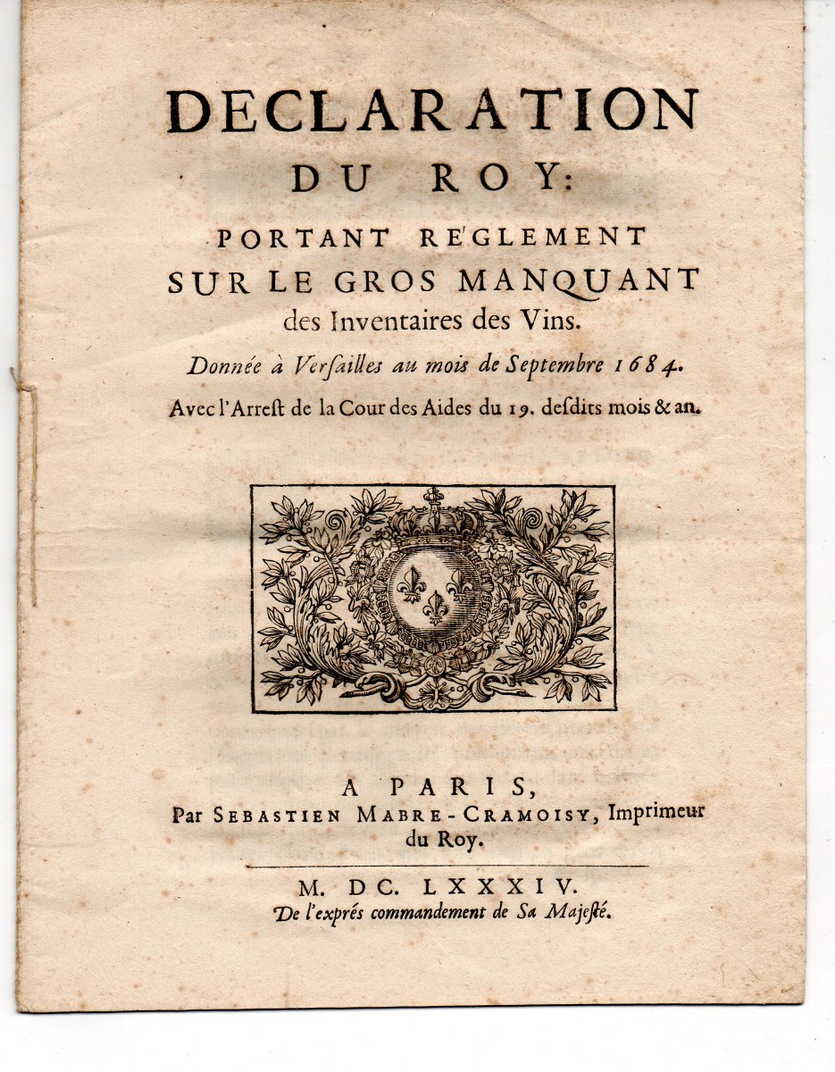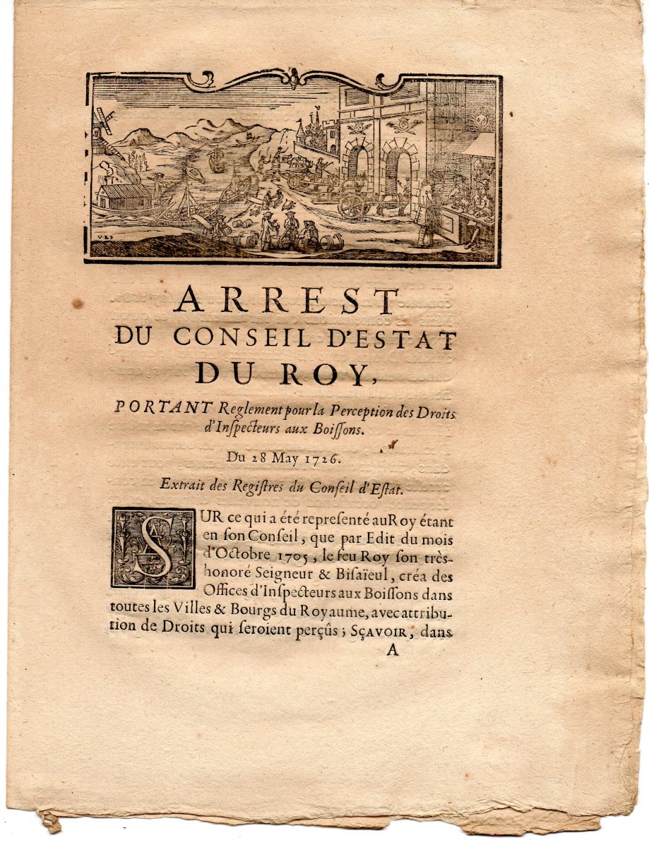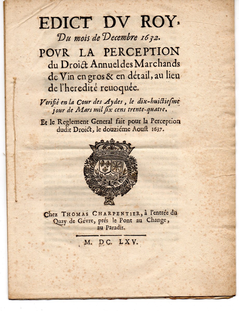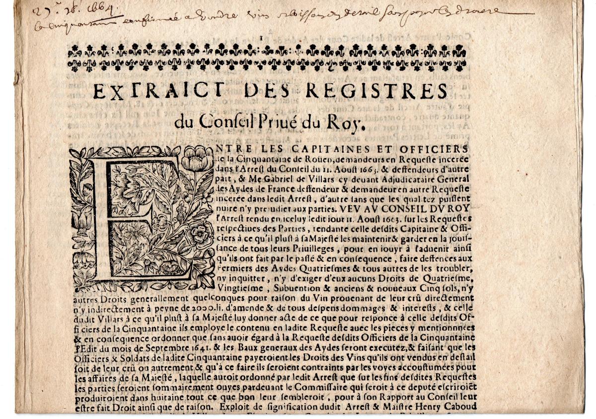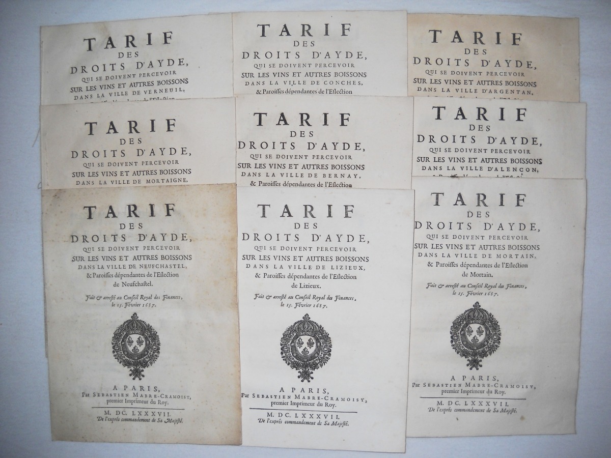 [COMMERCE - AYDES - VINS et ALCOOLS] - Lettres patentes, édits, déclarations, ordonnances, arrêts du conseil d'état du roi, arrêts de la cour des aydes et divers, relatifs aux règlements et à la jurisprudence de la perception des droits d'aides perçus sur les vins et alcools (eau-de-vie, bière, cidre, vinaigre), notamment dans la province de Normandie.