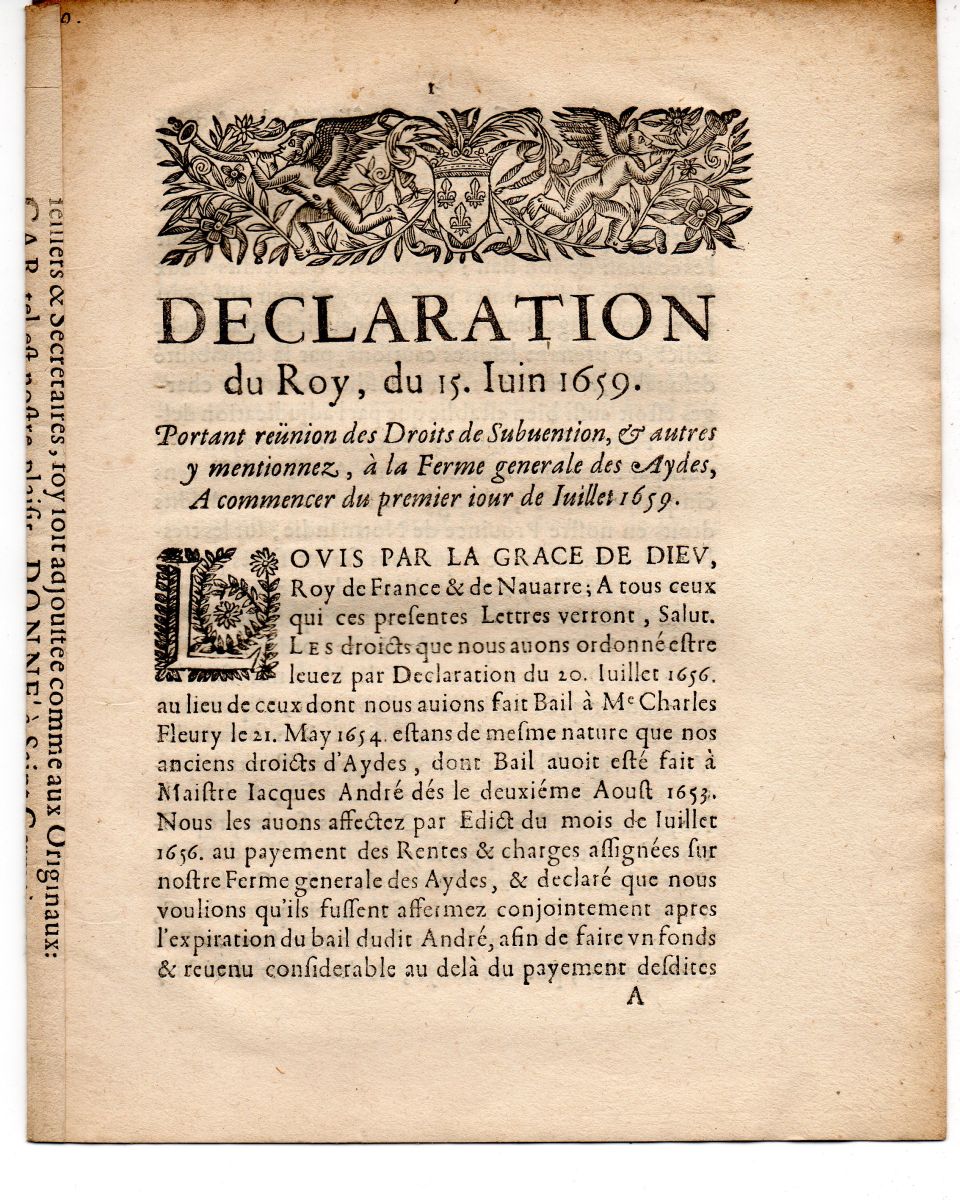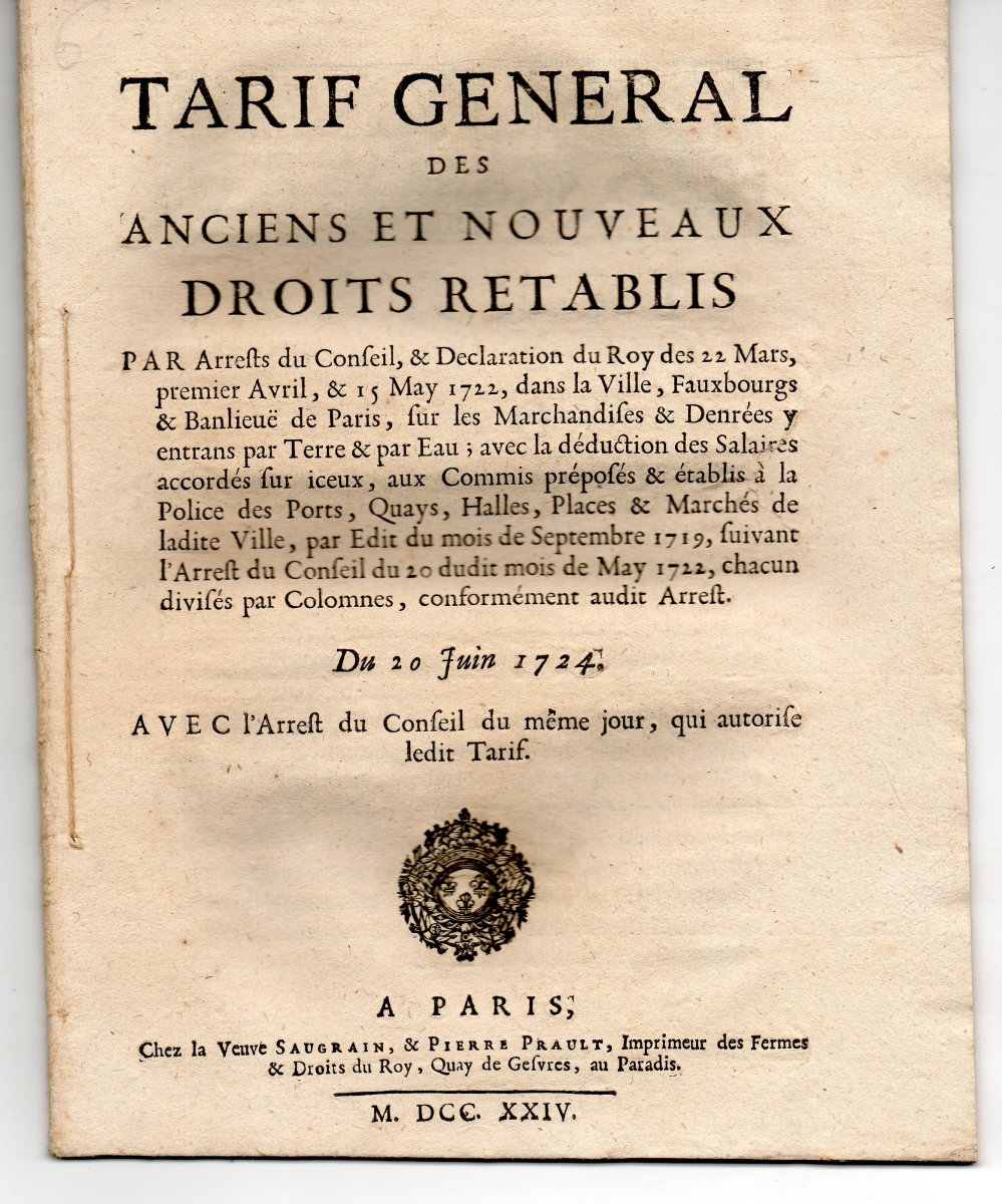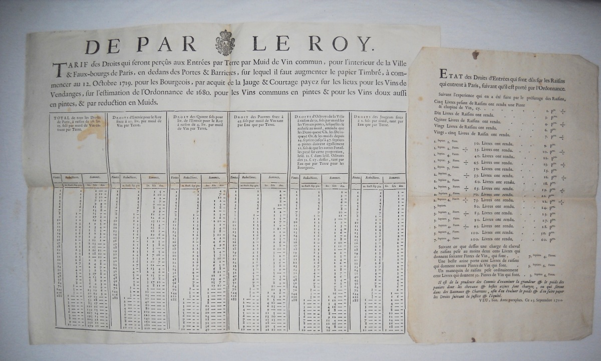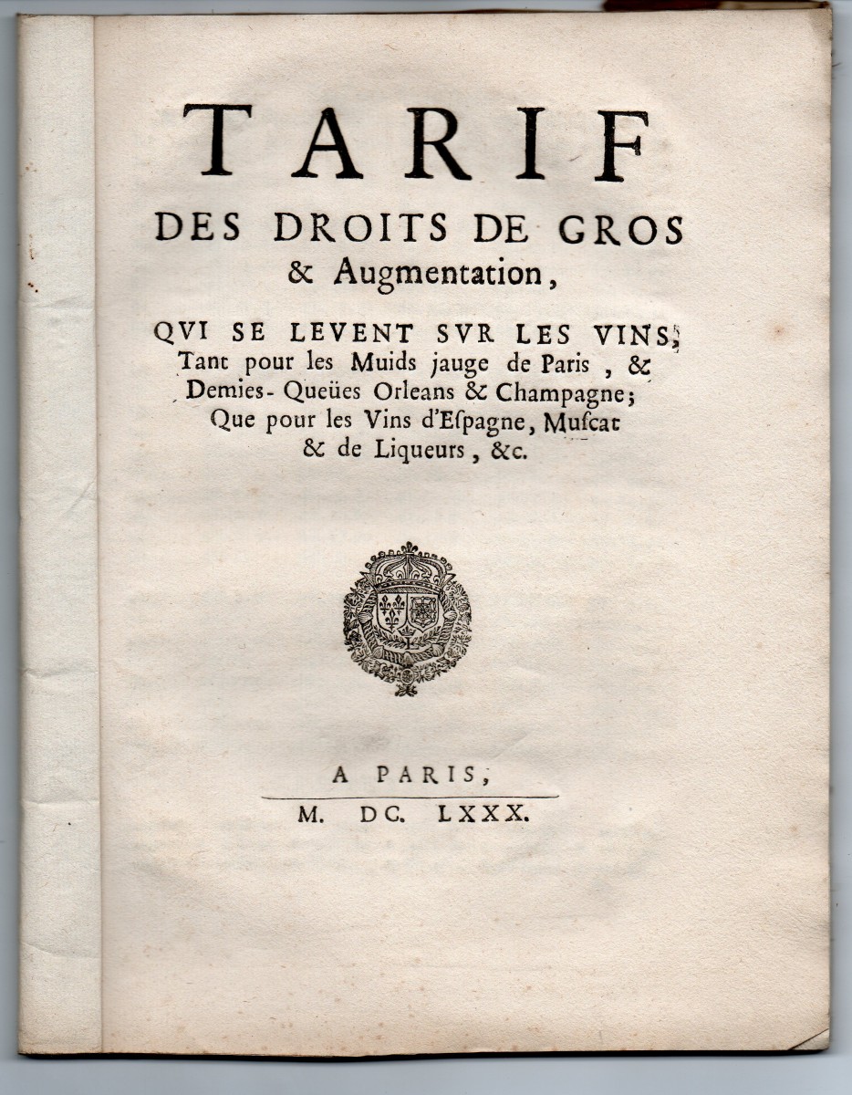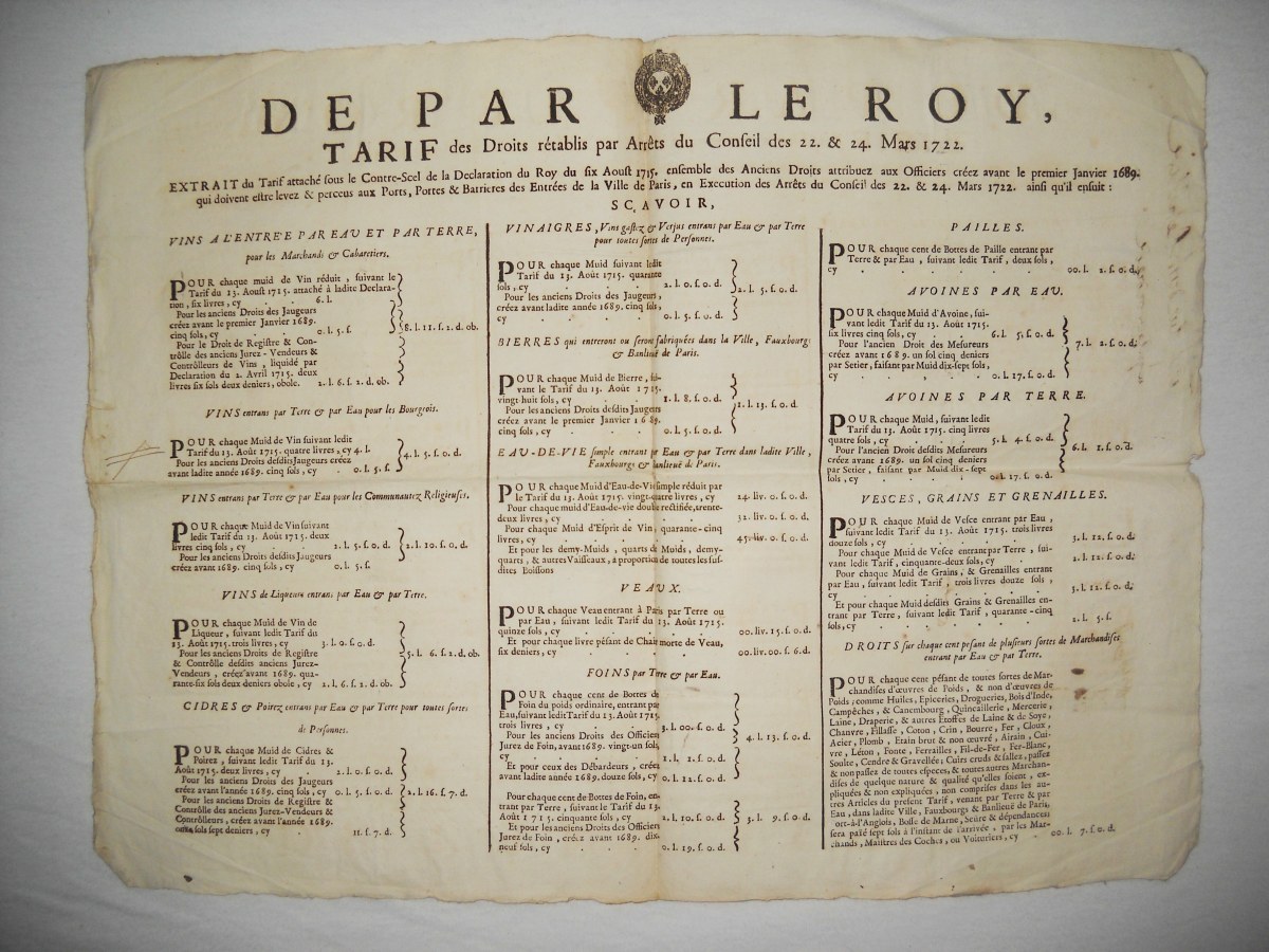 [Droits d'entrées et sorties - droits de subvention - droits de vente et revente - déclarations de congés de remuage - tarifs des droits d'aides - droits annuels - levée des anciens et nouveaux cinq sols - droit du huitième et du quatrième - droit de détail - droit de gros et gros manquant - droits rétablis - inspecteurs aux boissons - essayeurs visiteurs et contrôleurs d'eau de vie et d'esprit de vin - brasseurs de bière - essayeurs visiteurs de bière - etc.]