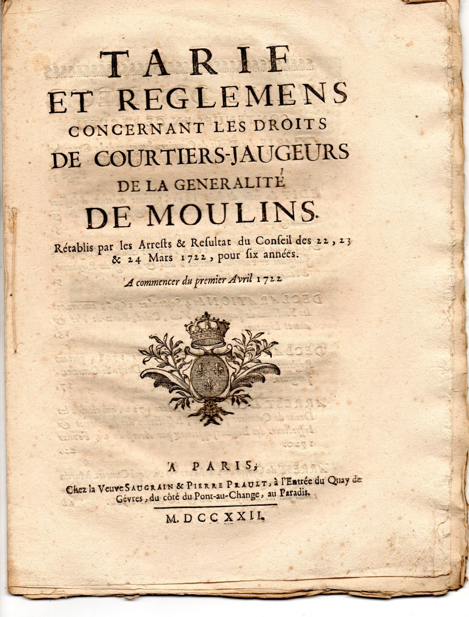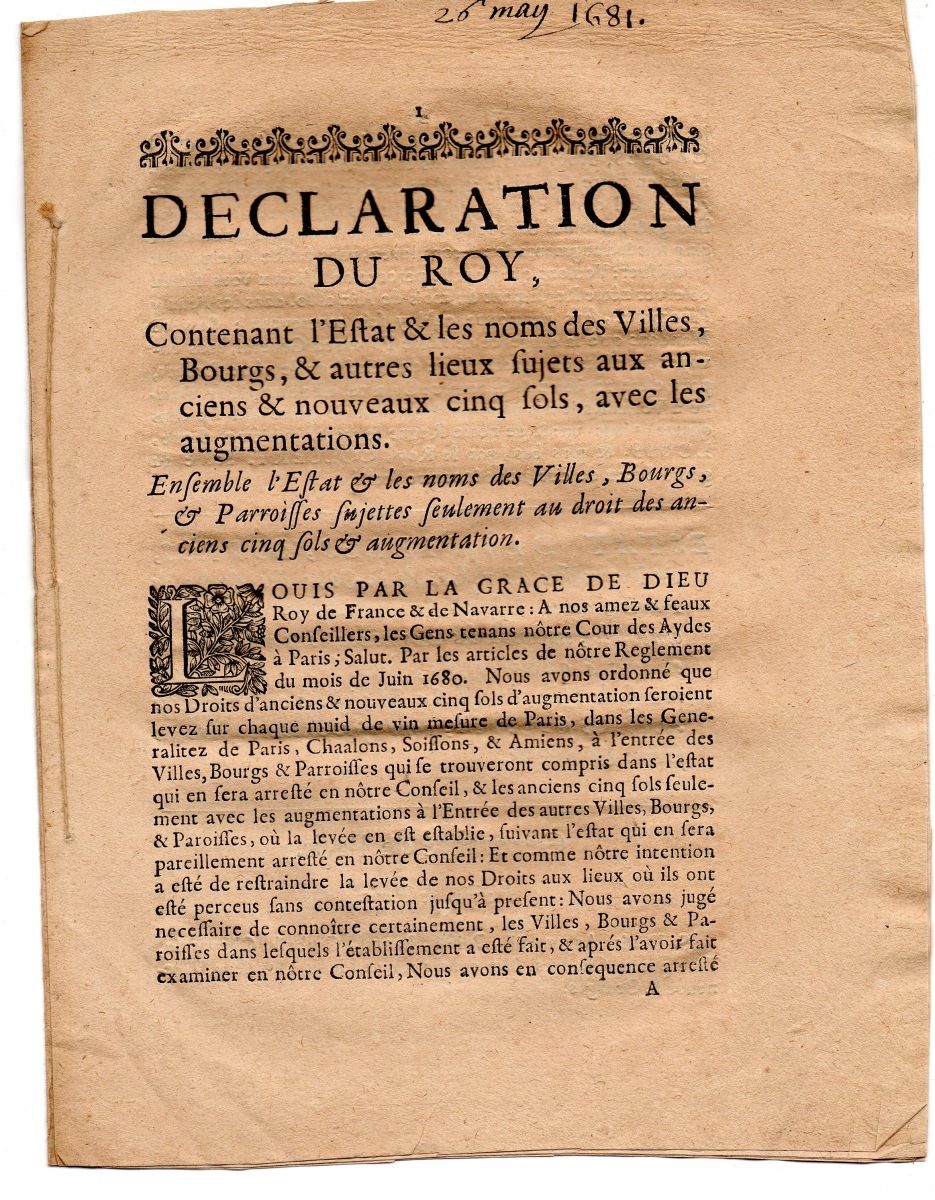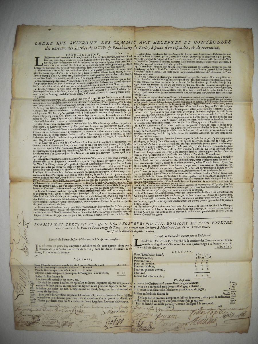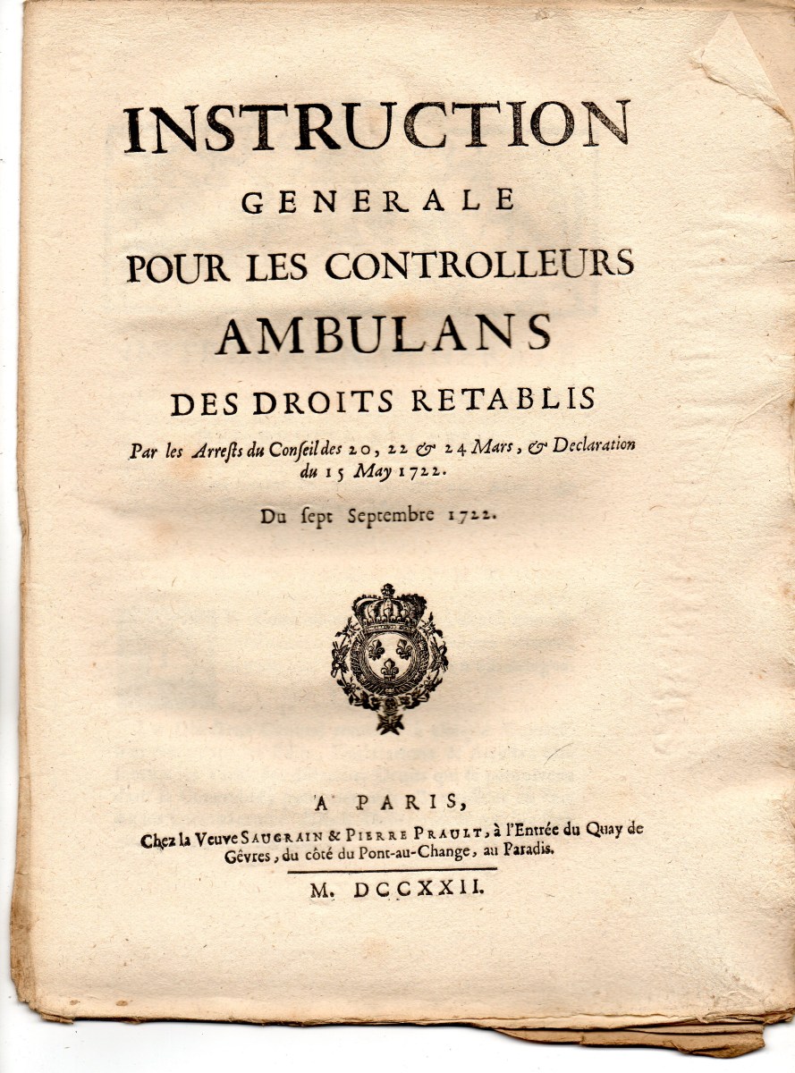 [Droits d'entrées et sorties - droits de subvention - droits de vente et revente - déclarations de congés de remuage - tarifs des droits d'aides - droits annuels - levée des anciens et nouveaux cinq sols - droit du huitième et du quatrième - droit de détail - droit de gros et gros manquant - droits rétablis - inspecteurs aux boissons - essayeurs visiteurs et contrôleurs d'eau de vie et d'esprit de vin - brasseurs de bière - essayeurs visiteurs de bière - etc.]