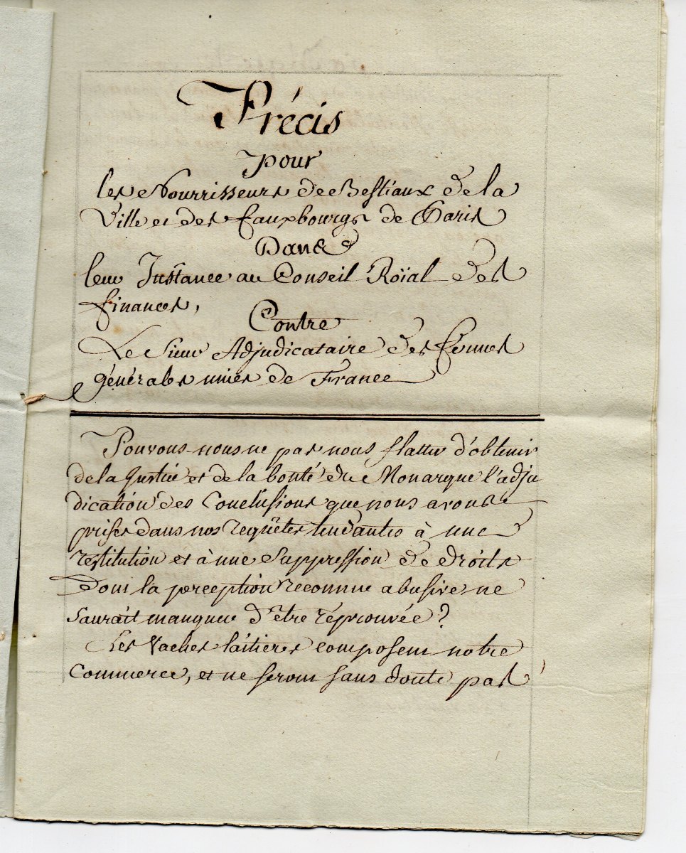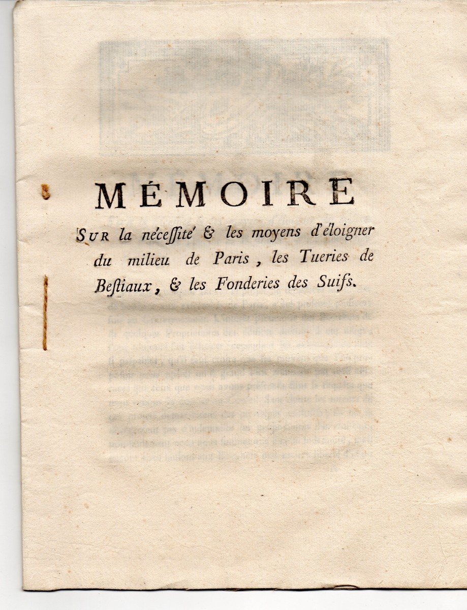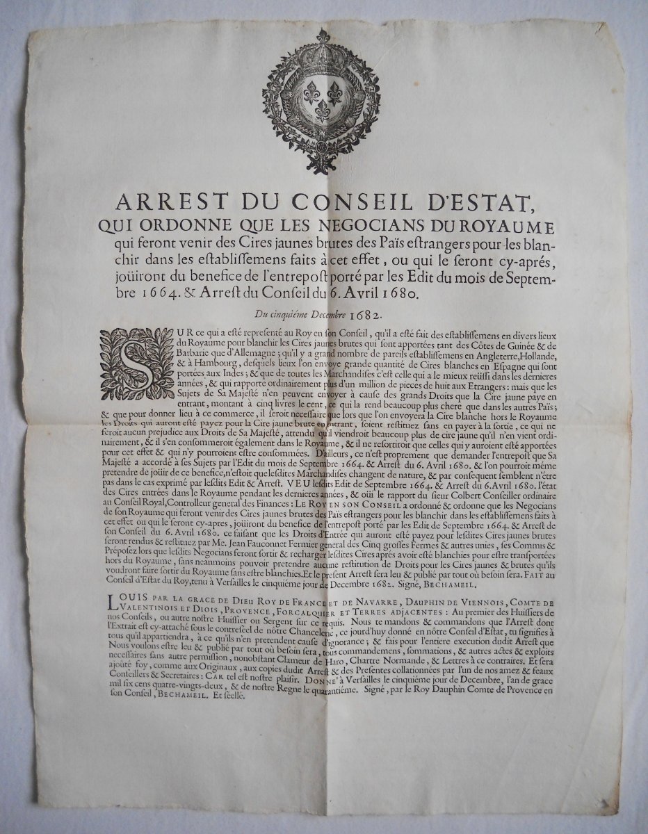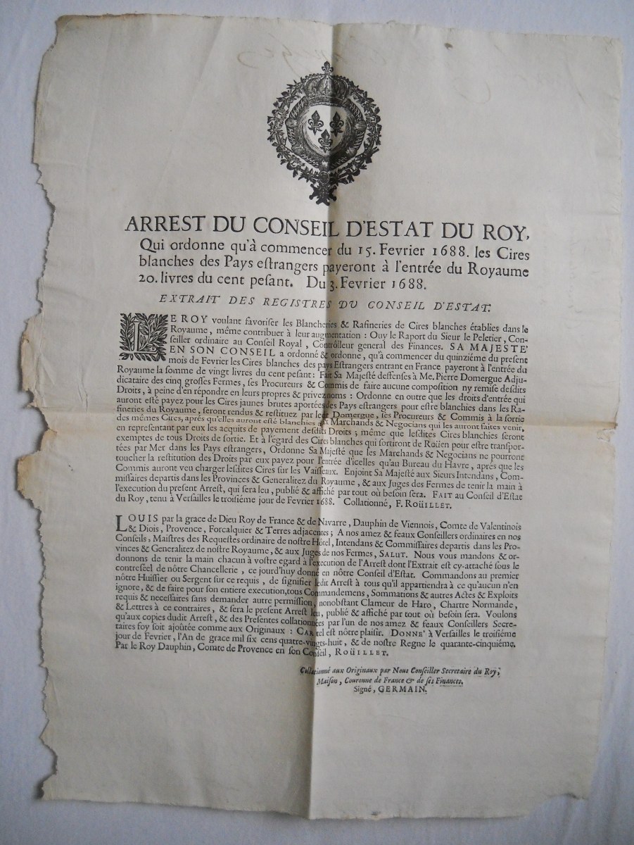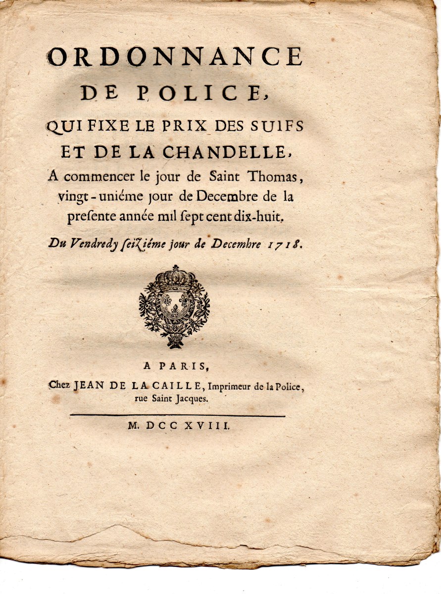Edit du roy pour la création de huit offices de vendeurs de veaux, & huit leurs commis, dans la ville & faux bourgs de Paris, may 1675. 3 pp., in-8 - Arrest du conseil d'estat qui ordonne que les negocians du royaume qui feront venir des cires jaunes brutes des païs estrangers pour les blanchir dans les establissemens faits à cet effet jouiront du benefice de l'entrepost, 5 décembre 1682. 35 x 37 cm - Arrest du conseil d'estat du roy et déclaration du roy en faveur des marchands forains de bestiaux & des bouchers de Paris pour la suppression des vendeurs de bœufs, vaches, moutons & brebis ; et le règlement de pied-fourché, 11 mars 1690. A Paris, chez Estienne Michallet, 1690, 7 pp., in-8 - Arrest du conseil d'estat du roy qui adjuge à Jean Lemaire tous les offices de jurez vendeurs & visiteurs de porcs de la generalité de Paris, où il y a foires ou marchez, à l'exception de la ville & faux bourgs de Paris, Sceaux, Longjumeau, Saint Ouen, Montmorancy & Luzarche. A Paris, chez Henry Charpentier, 1704, 8 pp., in-4 - Idem pour les généralités d'Alençon, Orléans, province de Bretagne - Déclaration du roy qui réunit aux Etats de Bretagne les offices d'inspecteurs aux boucheries, & de jurez vendeurs visiteurs & langayeurs de porcs, 12 janvier 1706. A Paris, Frederic Leonard, 1706, 8 pp., in-8 - Edit du roy portant suppression des charges de jurez-vendeurs de porcs et création de jurez-inspecteurs, contrôlleurs de porcs, avril 1708. A Paris, chez la veuve François Muguet, & Hubert Muguet, 1708, 7 pp., in-8 - Edit du roy portant creation de cinquante offices de trésoriers de la Bourse de la Place & marché aux veaux de Paris, décembre 1708. Chez la veuve François Muguet & Hubert Muguet, 1709, 7 pp., in-8 - Arrest du conseil d'estat du roy portant reglement en faveur de la communauté des maistres chaircutiers de la ville & faux bourgs de Paris, 8 mars 1712. 4 pp. n. ch., in-4 - Ordonnance de police qui fixe le prix des suifs et de la chandelle, 16 décembre 1718. A Paris, chez Jean de la Caille, 1718, 8 pp., in-4 - Mémoire sur la nécessité & les moyens d'éloigner du milieu de Paris, les tueries de bestiaux & les fonderies des suifs. L. Cellot, 1787, 19 pp., in-4 - Second mémoire et pièces justificatives sur la nécessité d'éloigner du milieu de Paris… L. Cellot, 1788, 22 pp., in-4 - etc.
