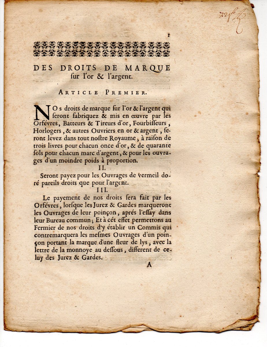 21 juillet 1699. 7 pp., in-8 - Ordonnance du roy portant defenses de transporter des espèces d'or & d'argent dans l'Amérique, 4 mars 1699. A Paris, de l'imprimerie royale, 1699, 4 pp., in-8 - Edit du roy portant reglement pour l'or & l'argent qu'on employe tant en vaisselle, que sur tous les meubles, habits, carosses, &c. A Paris, Frederic Leonard, 1700, 12 pp., in-4 - Edit du roy qui décharge les marchands orfèvres de Paris de la visite des inspecteurs de police, octobre 1713. A Paris, chez la veuve François Muguet & Hubert Muguet, 1713, 4 pp., in-4 - Déclaration du roy portant deffenses de porter des diamans, 4 février 1720. A Paris, de l'imprimerie royale, 1720, 4 pp., in-8 - Arrests du conseil d'estat du roy portant reglement pour les affineurs & tireurs d'or des villes de Paris & Lyon. Georges Jouvenel, 1722, 24 pp., in-8 - Déclaration du roy portant reglement sur l'orfèvrerie dans la province d'Alsace, 29 décembre 1727. A Paris, de l'imprimerie royale, 1728, 11 pp., in-8 - Déclaration du roi concernant le commerce des ouvrages d'Or & d'Argent venant de l'étranger, 9 septembre 1769. A Paris, de l'imprimerie royale, 1769, 7 pp., in-4 - Arrest de la cour des monnaies qui fait défenses à tous juifs, colporteurs, etc, de vendre, acheter, troquer ou débiter aucuns ouvrages, bijoux, vaisselles ou marchandises d'or & d'argent, sans y être autorisés par des permissions particulières, 27 novembre 1771. A Paris, de l'imprimerie royale, 1771, 3 pp., in-4 - Lettres patentes du roi portant suppression de la communauté des maîtres lapidaires & leur réunion au corps des maîtres orfèvres-joailliers, tireurs & batteurs d'or, 17 mars 1781. A Paris, chez P.G. Simon, 1781, 6 pp., in-4 - Déclaration du roi concernant les brevets d'apprentissage pour l'orfèvrerie, 25 janvier 1781. A Paris, de l'imprimerie royale, 1781, 3 pp., in-4 - Déclaration du roi qui ordonne que chaque communauté d'orfèvres aura à l'avenir un poinçon de contre-marque particulier & invariable, 15 décembre 1783. A Paris, de l'imprimerie royale, 1784, 4 pp., in-4 -Lettres patentes du roi qui autorisent les orfèvres à travailler au titre de dix-huit karats les menus ouvrages d'or, 4 avril 1789. A Paris, de l'imprimerie royale, 1789, 7 pp., in-4 - etc.