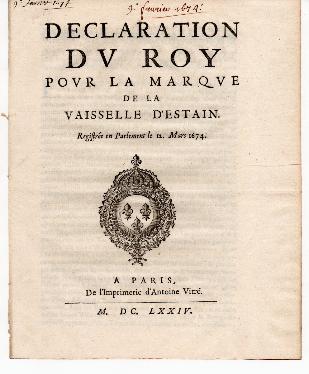 A Paris, 1678, 12 pp., in-fol. - Déclaration du roy portant défense de fabriquer les pièces d'orfèvrerie qui y sont mentionnées, 21 février 1687. A Paris, chez François Muguet, 1687, 6 pp., in-8 - Déclaration du roy portant reglement sur les ouvrages & vaisselles d'or & d'argent, 14 décembre 1689. A Paris, Frederic Leonard, 1989, 8 pp., in-8 -Edit du roy portant création de contrôlleurs de la marque des ouvrages d'or & d'argent, aoust 1696. A Paris, chez François Muguet, 1696, 7 pp., in-8 - Déclaration du roy portant reglement pour la levée & perception des droits établis sur les dentelles de Flandres & Pays-Bas