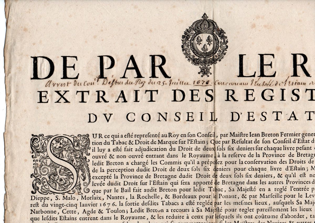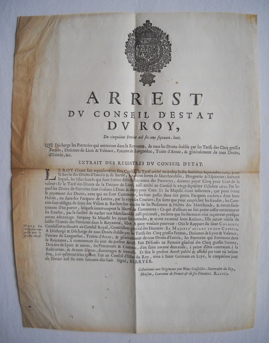 A Paris, Julian Jacquin, 1653, 7 pp., in-8 - Déclaration du roy en forme de nouveau tarif pour la levée & perception des droits d'entrée & sortie du royaume. 1667, A Paris, chez Thomas Charpentier, 7 pp., in-8 - Déclaration du roy portant que l'or et l'argent qui sera fabriqué & mis en uvre par les orfèvres, batteurs & tireurs d'or, il sera levé trente sols par once d'or & vingt sols par marc d'argent, au profit du roy, 7 avril 1672. A Paris, par Sébastien Mabre-Cramoisy, 1672, 6 pp., in-8 - Arrest du conseil d'estat du roy qui décharge les pierreries qui entreront dans le royaume, de tous les droits établis par les tarifs des cinq grosses fermes, douanes de Lion & Valence, patente de Languedoc, traite d'Arzac & généralement de tous droits d'entrée, 5 février 1672. 30 x 40 cm - Arrest notable du conseil d'estat du roy, Sa Majesté y estant, entre le sieur Ruply de la ville d'Ispaham, capitale de Perse, et Nicolas Saunier et ses cautions, fermiers généraux des gabelles et cinq grosses fermes