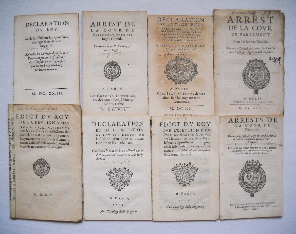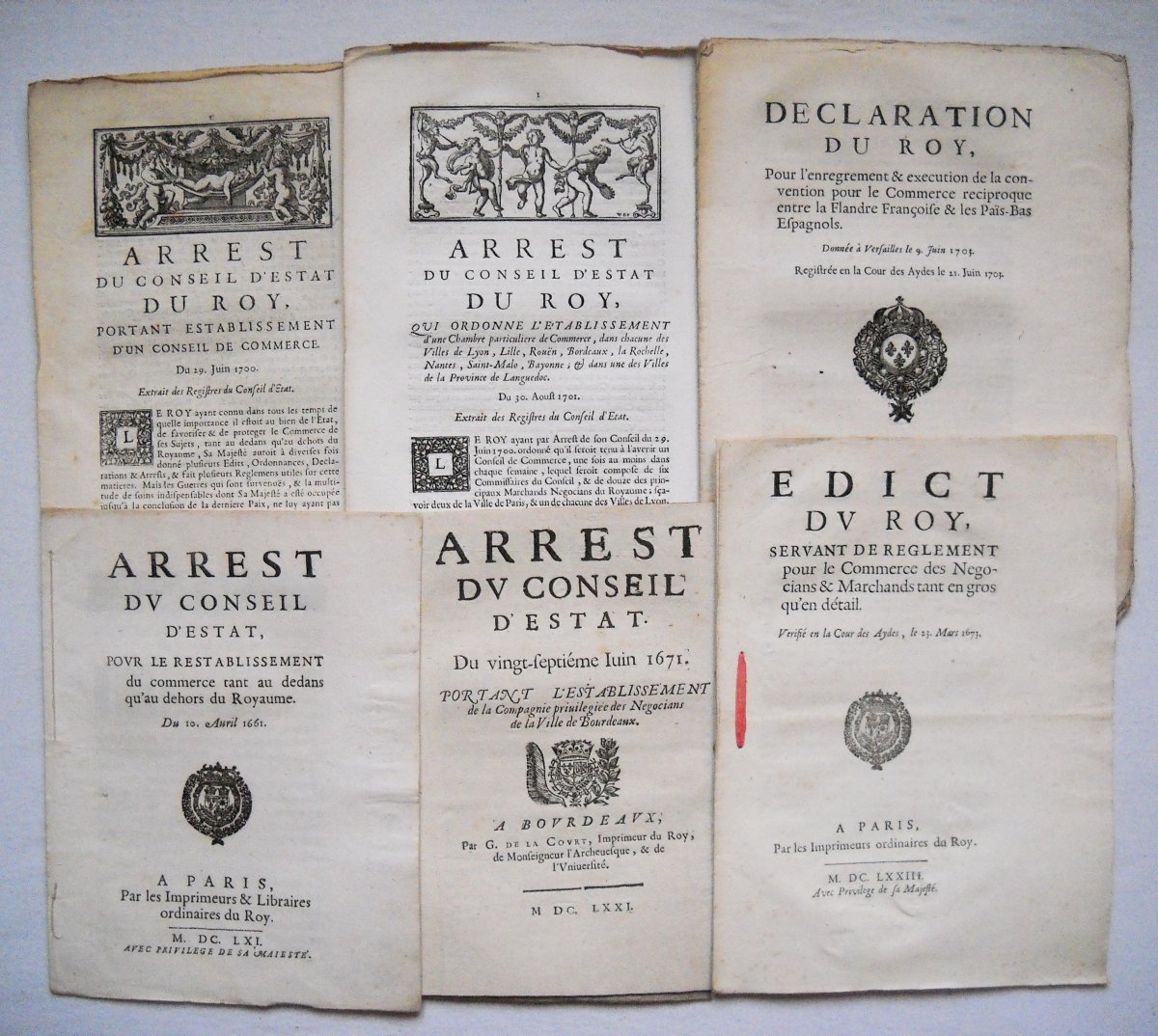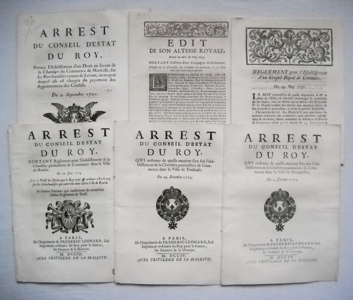 - [COMMERCE - INSTANCES] - Lettres patentes, édits, déclarations, ordonnances, arrêts du conseil d'état du roi, arrêts de la cour de parlement, arrêts de la cour des aydes et divers, relatifs aux instances et agents de commerce.