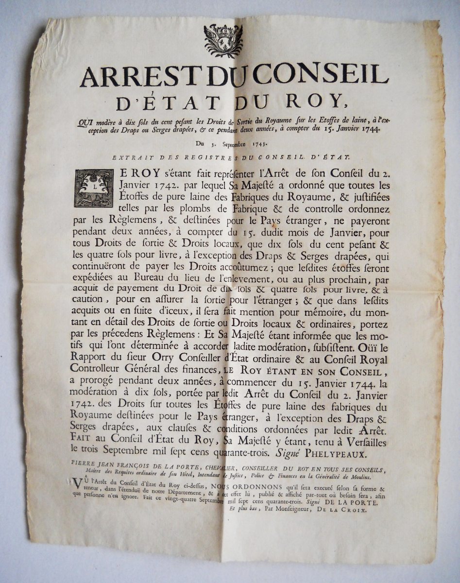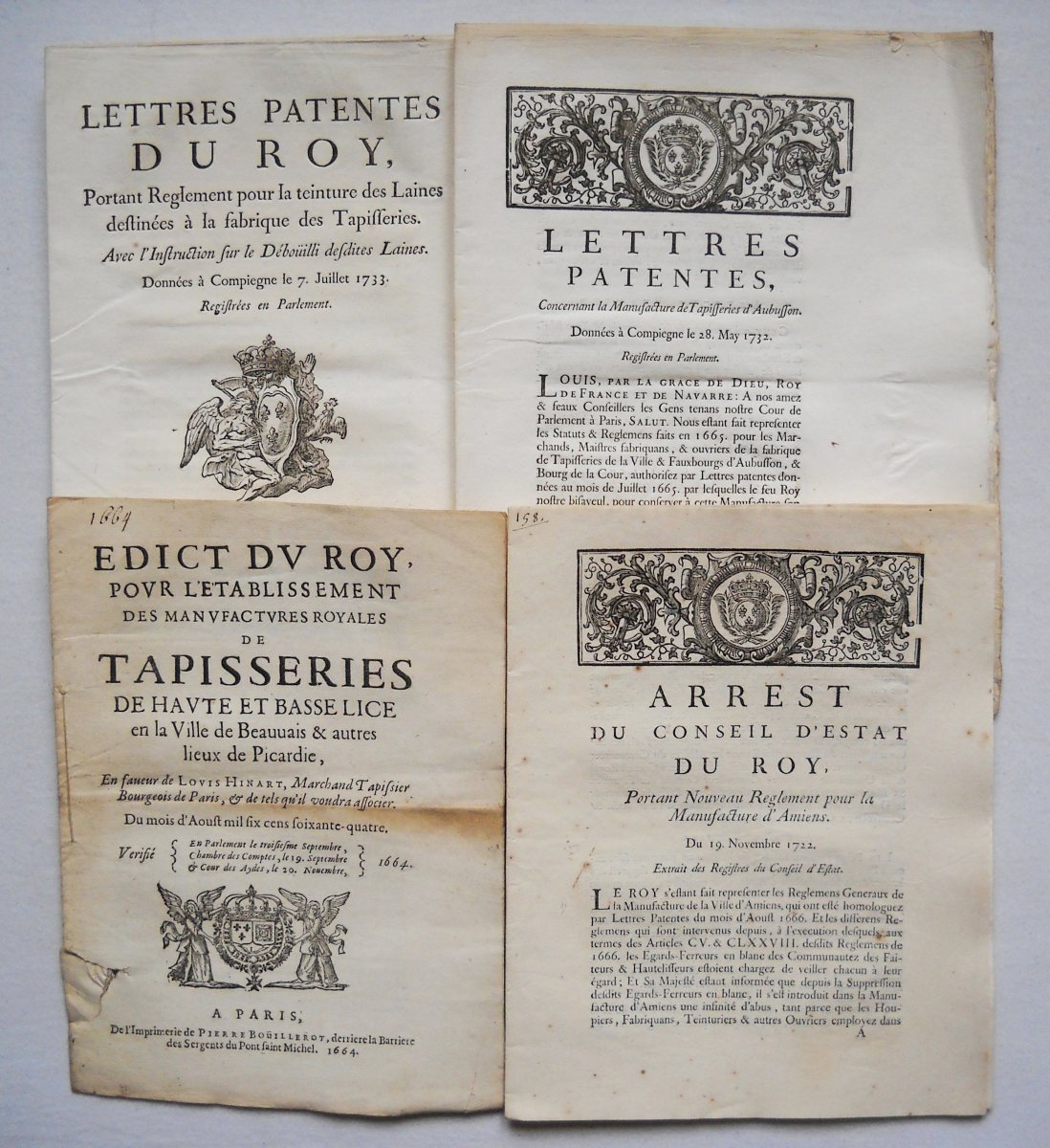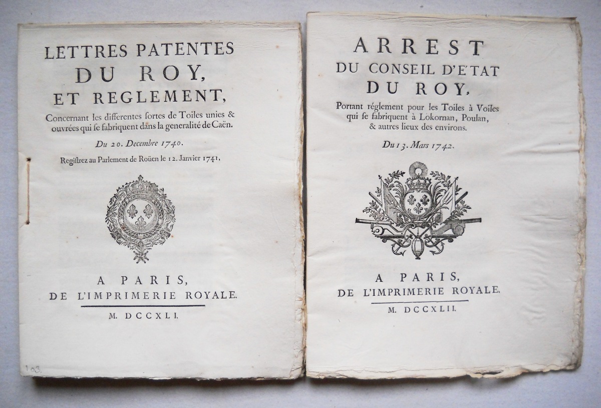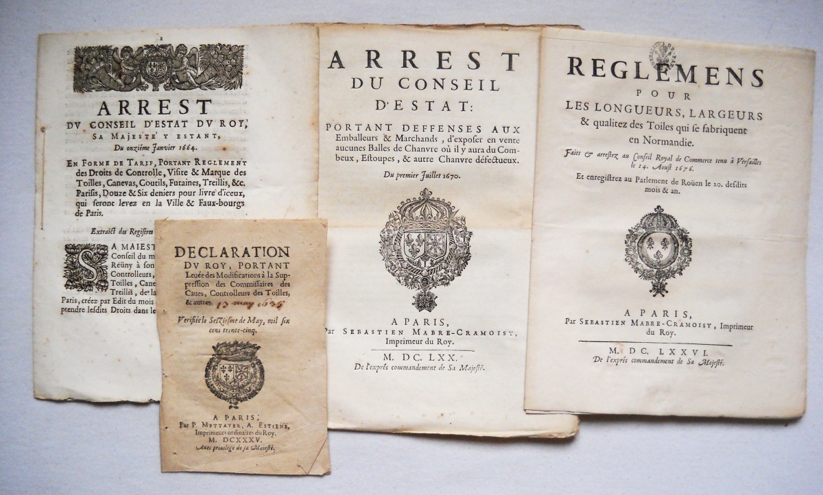 [COMMERCE -TOILES et LAINES, DRAPS et TAPISSERIES - MANUFACTURES et FABRIQUES] - Lettres patentes, édits, déclarations, ordonnances, arrêts du conseil d'état du roi, et divers, relatifs à la fabrication et au commerce des toiles, laines, draps et tapisseries.
